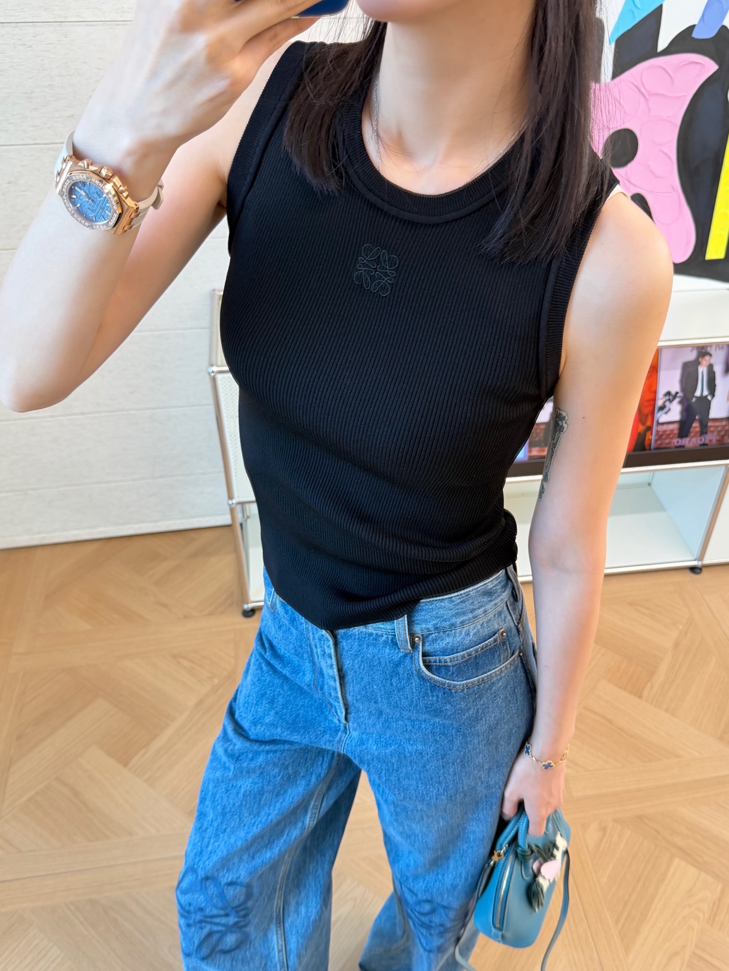 除了單穿之外,這件背心作為內搭同樣非常出色。搭配襯衫、西裝外套或針織外套時,胸前刺繡會自然成為視覺亮點,整體造型瞬間更有層次感。