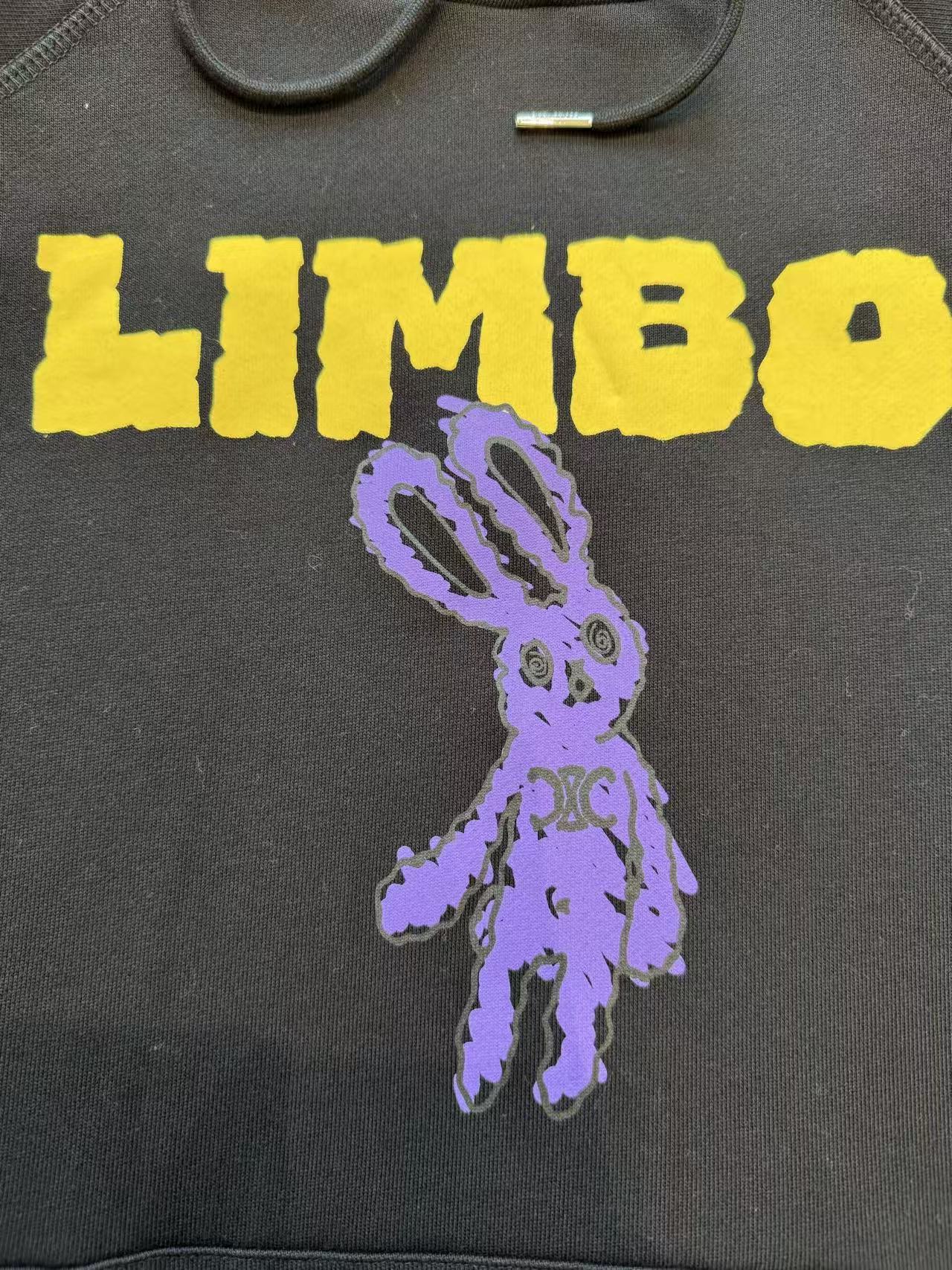最瘋狂的當然是胸前那隻「紫色毛絨兔子」+「手寫LIMBO塗鴉」!兔子不是印花也不是貼布,而是真的用毛絨立體縫上去,摸起來軟到爆炸,兔耳朵還會跟著晃;字樣用厚實油墨多層印刷,邊緣故意做髒髒感,藝術家親手塗鴉的即視感直接拉滿,懂的人自動懂~