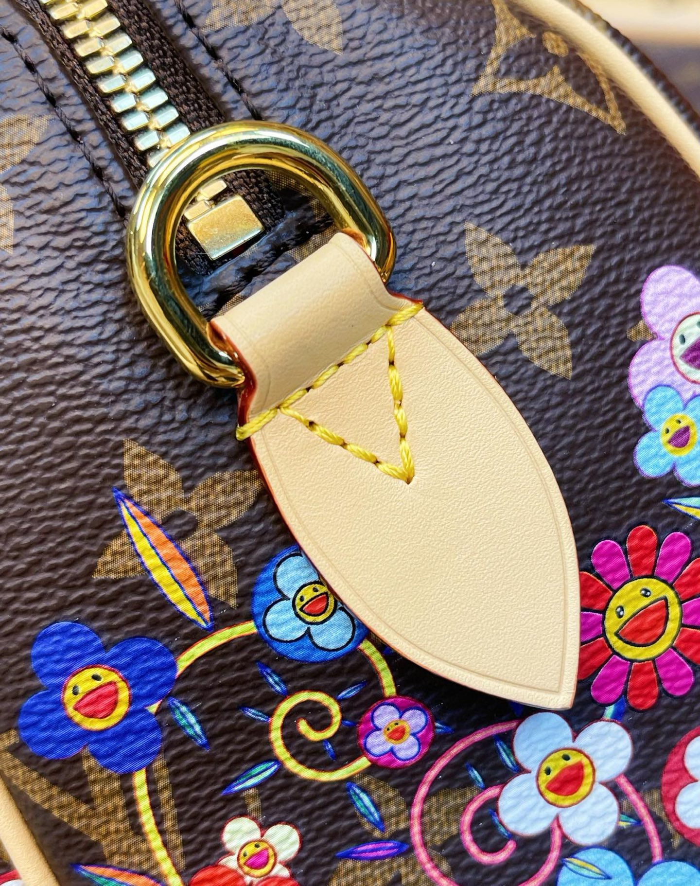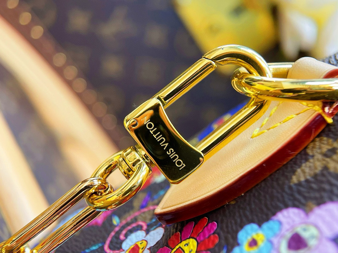 村上隆的標誌性藝術元素如色彩繽紛的花朵圖案,讓這款包包在細節上散發著濃厚的藝術氣息,為手袋帶來一抹獨特的亮點。