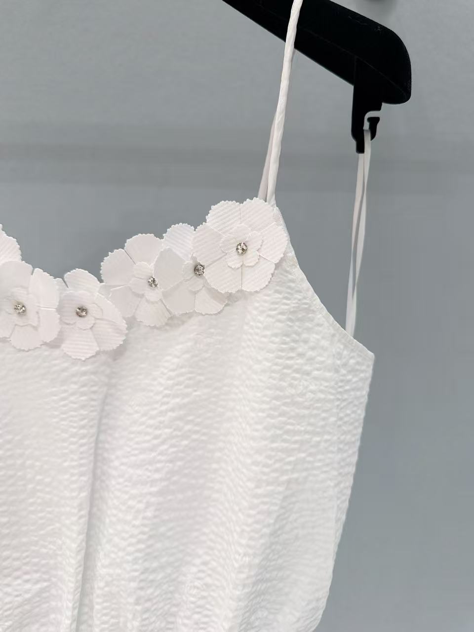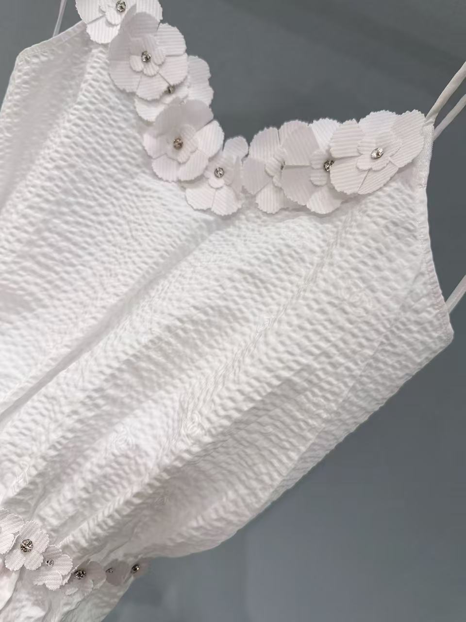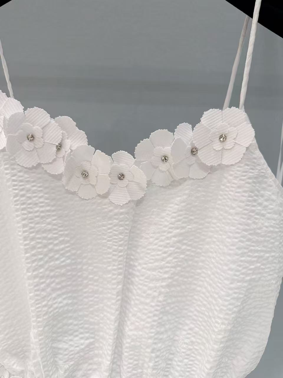 最讓人心動的細節,在於領口與腰間的手工訂製立體花朵,花心處點綴了閃爍的水鑽,走在陽光下會隱隱約約透出光芒,仙氣滿滿!