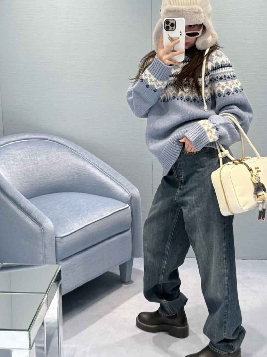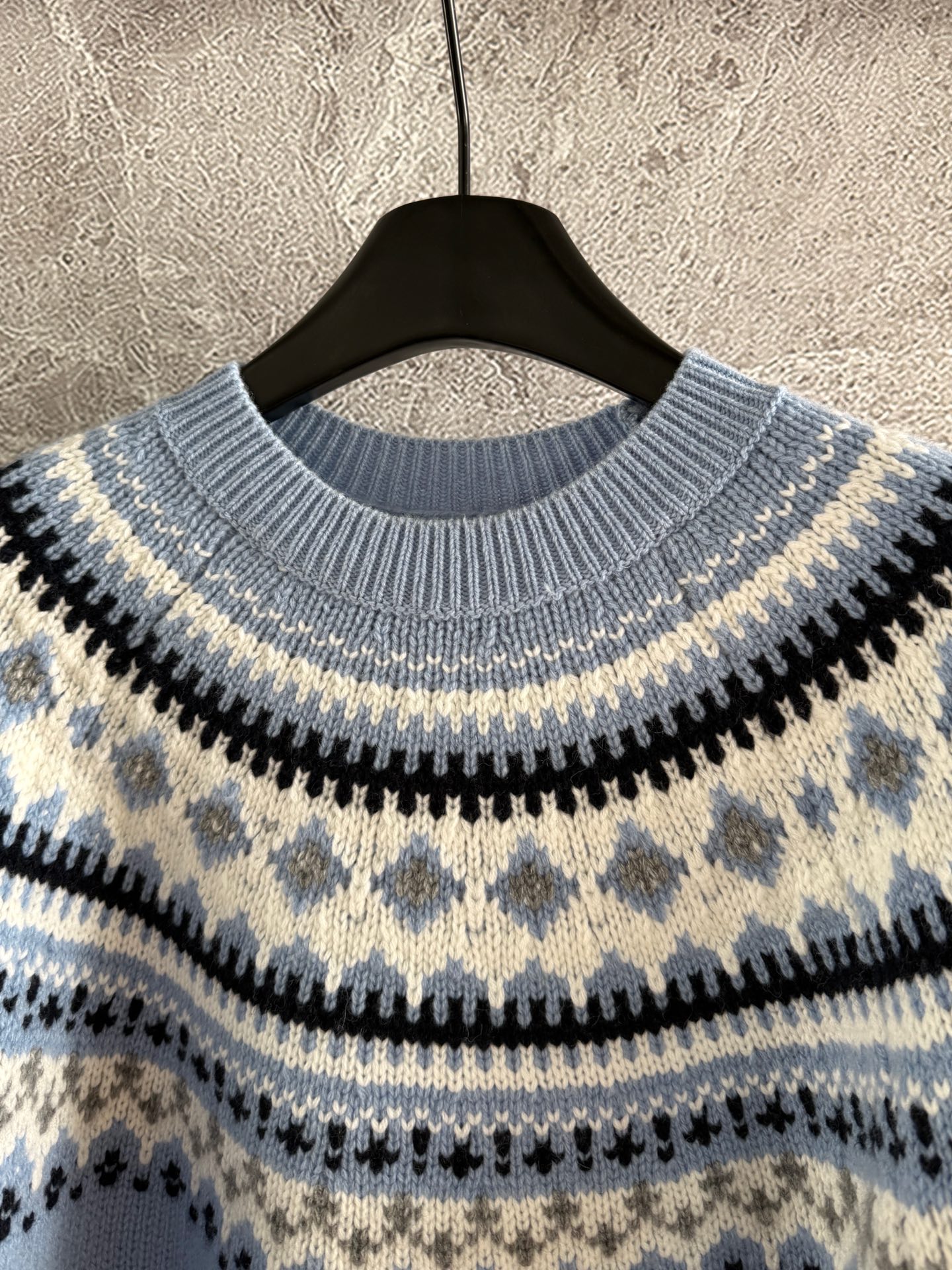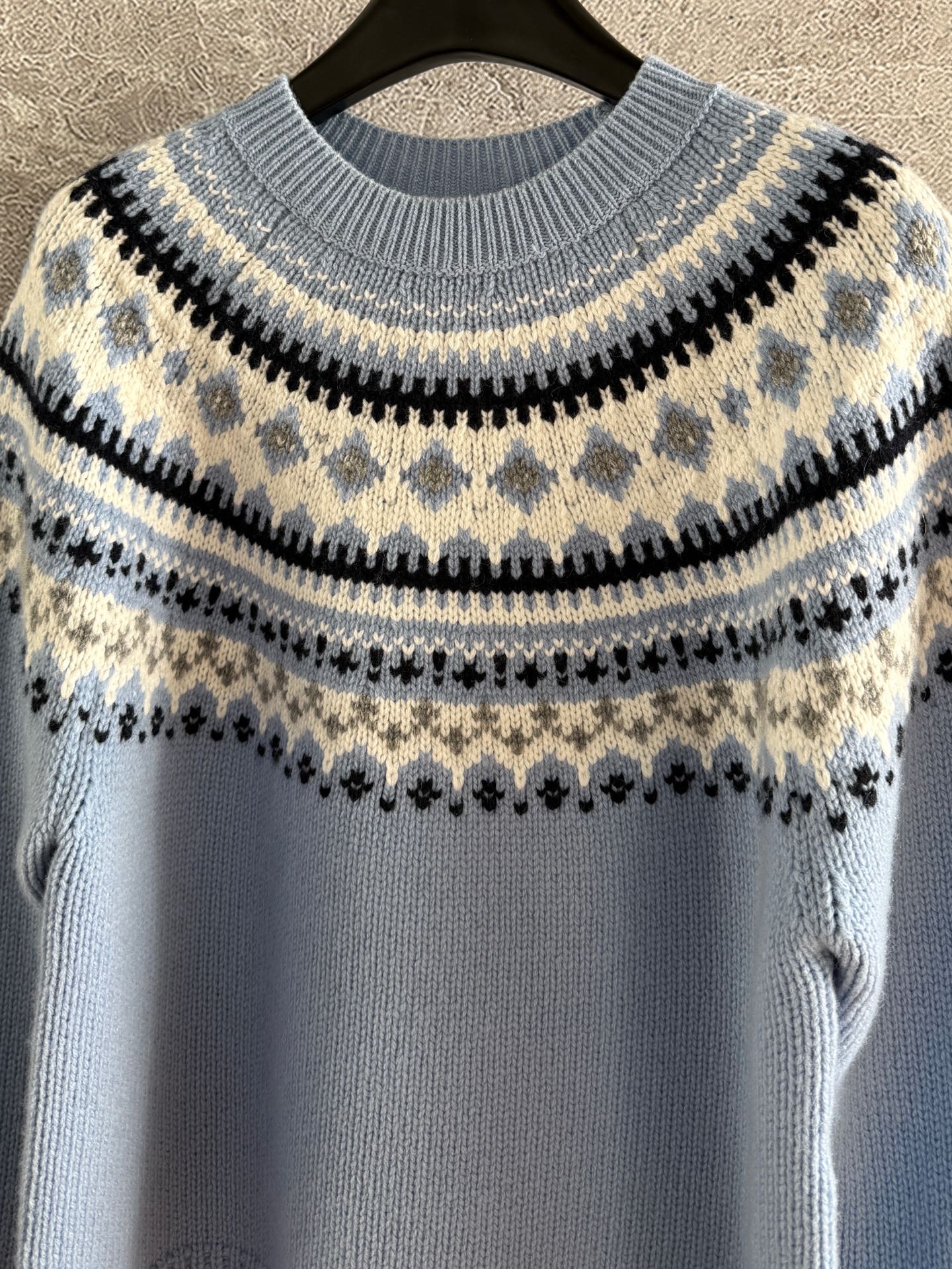 這件的靈魂絕對是那經典的「費爾島提花」——在淺藍色底上點綴雪花紋理,就像冬夜裡靜靜飄落的初雪,柔和又浪漫。