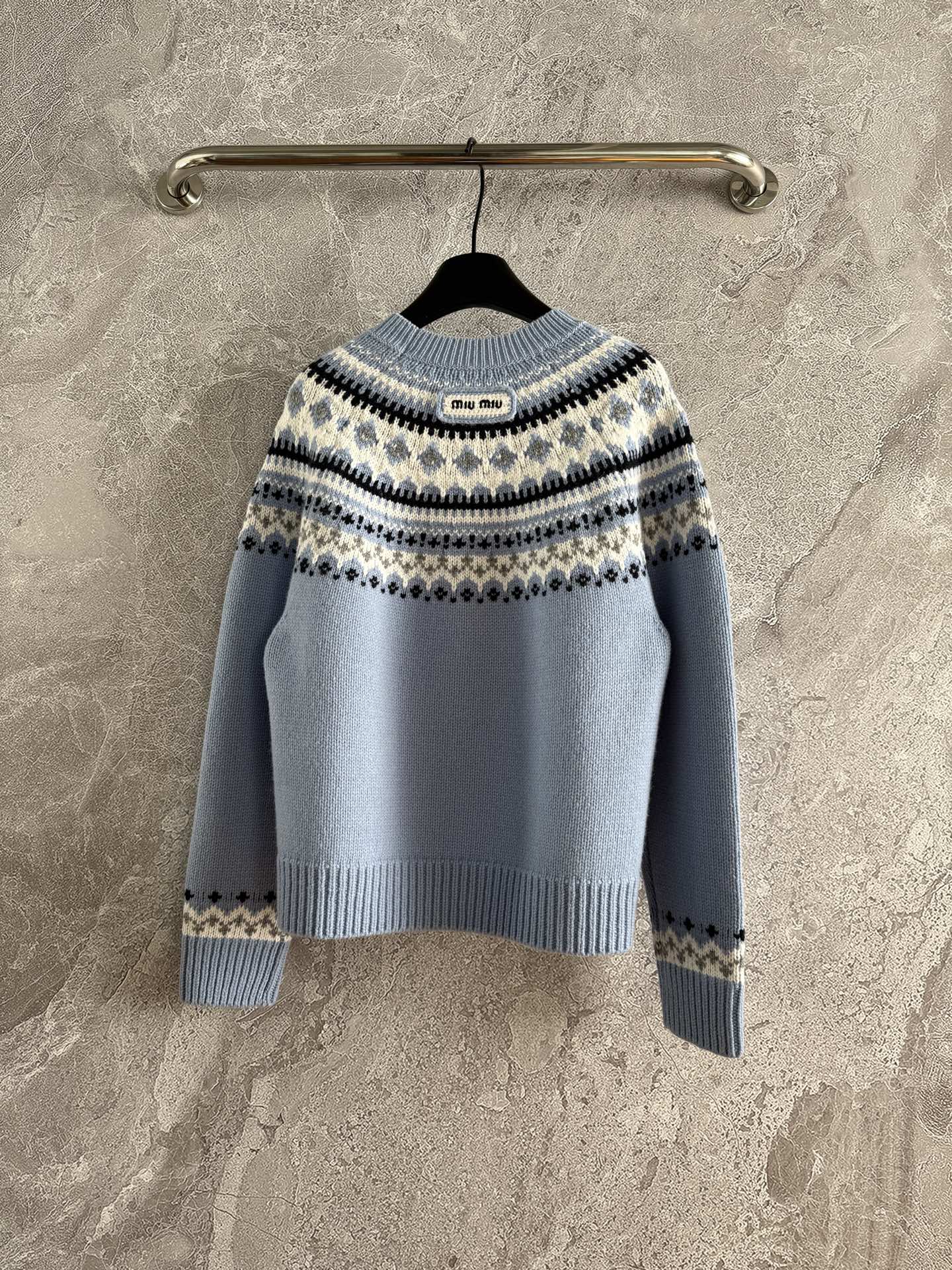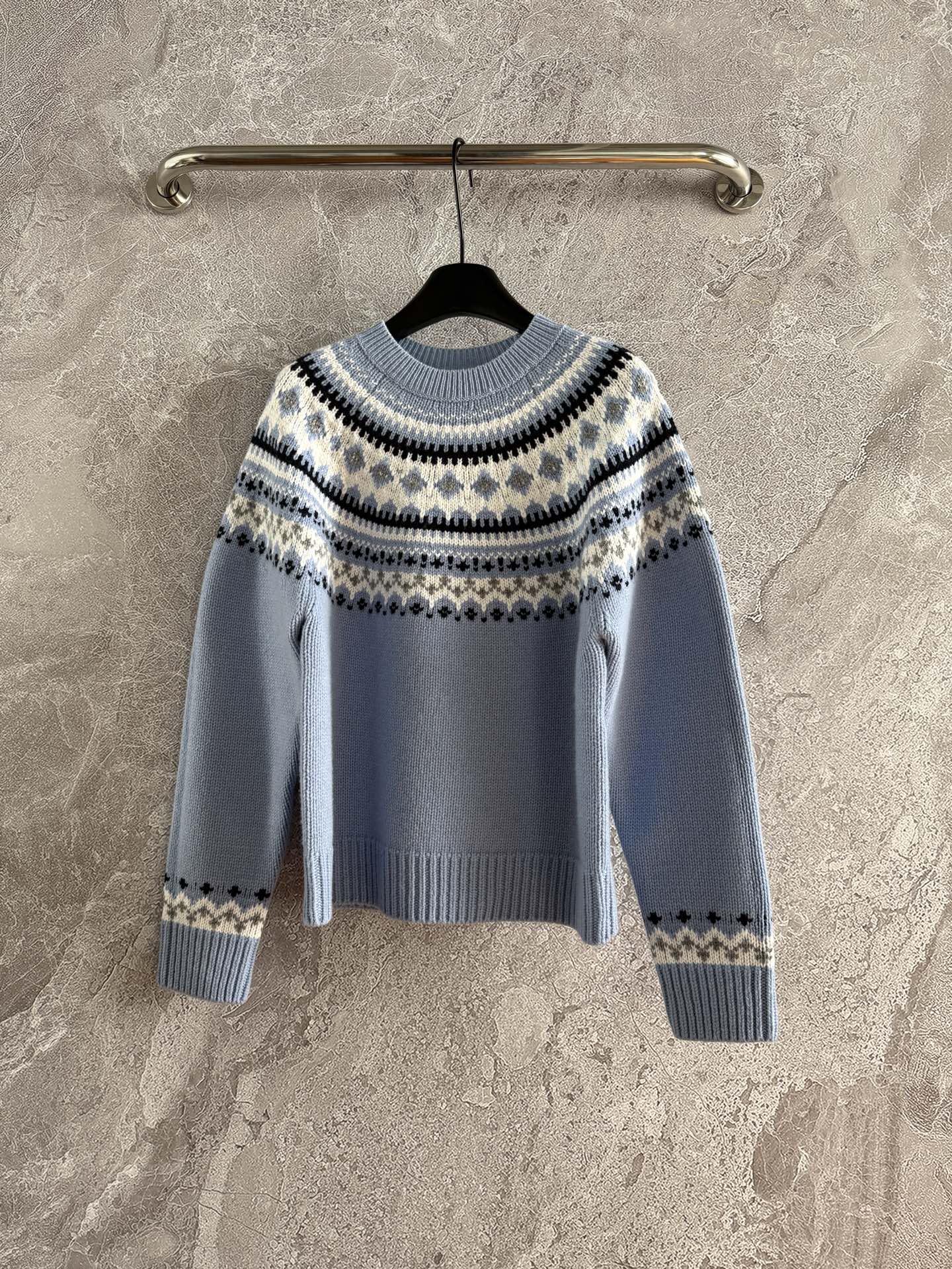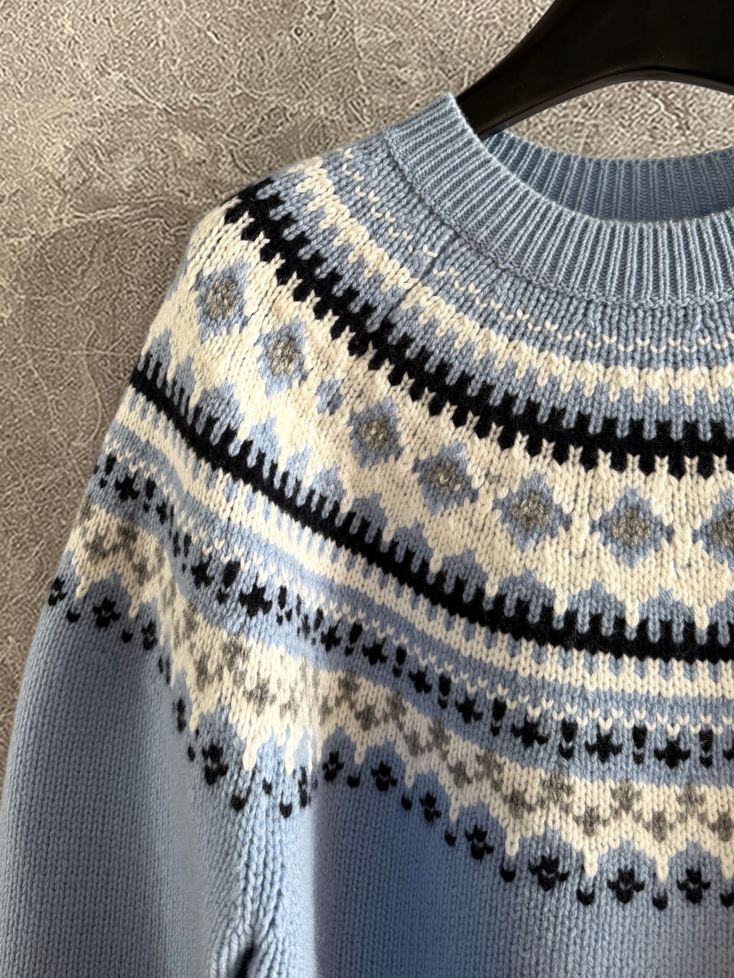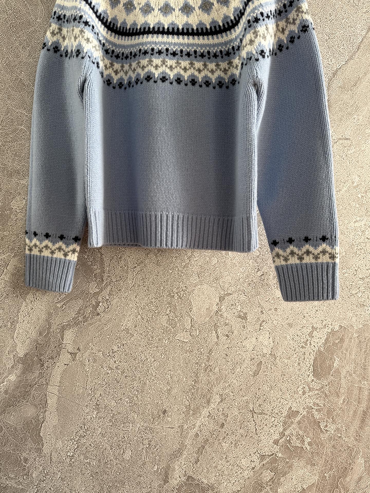 這件的靈魂絕對是那經典的「費爾島提花」——在淺藍色底上點綴雪花紋理,就像冬夜裡靜靜飄落的初雪,柔和又浪漫。