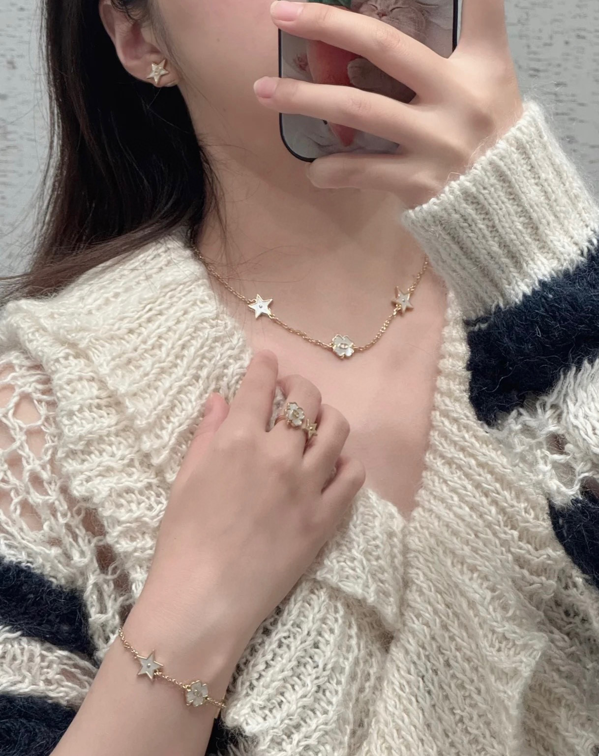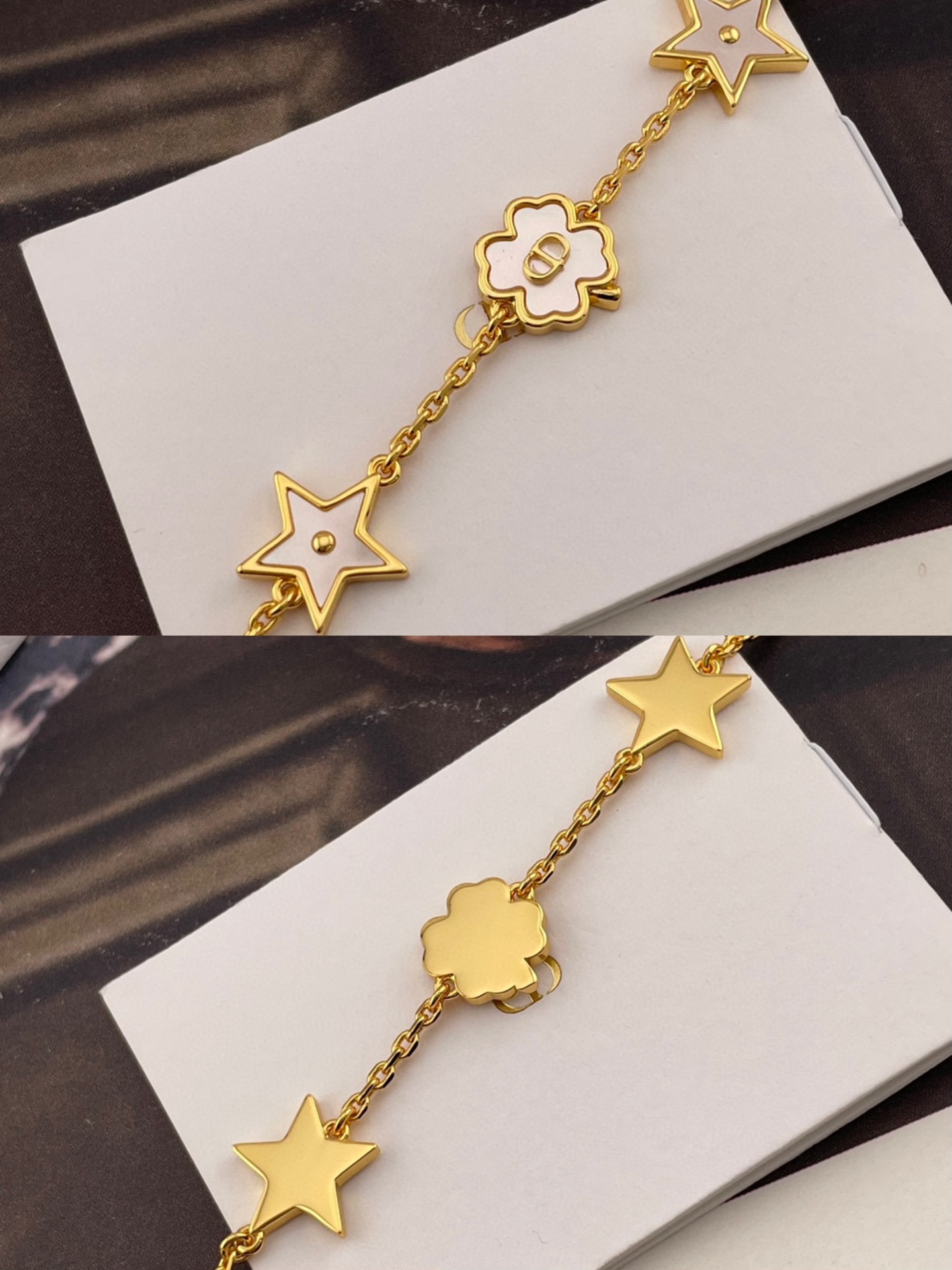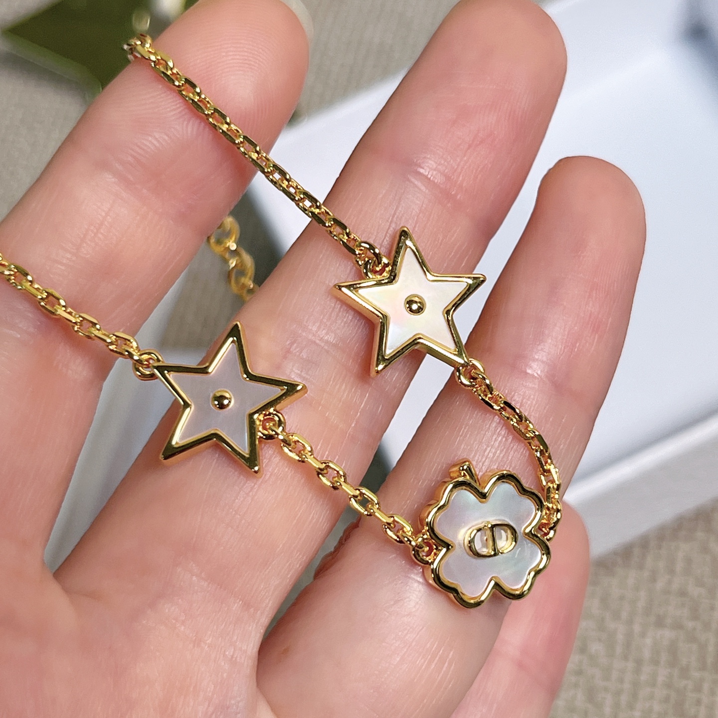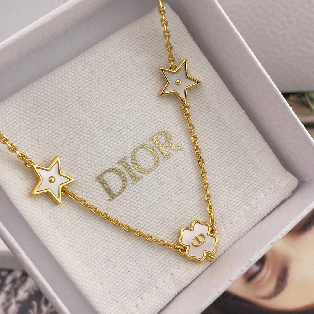 這條項鍊結合了品牌經典的 CD logo 與幸運四葉草設計,星星與四葉草皆採用天然貝殼打造,每一顆都有獨一無二的紋理與光澤。從不同角度看,都能折射出細緻變幻的色彩層次,溫柔又閃耀,像是把星光與月色都鎖進了項鍊裡。