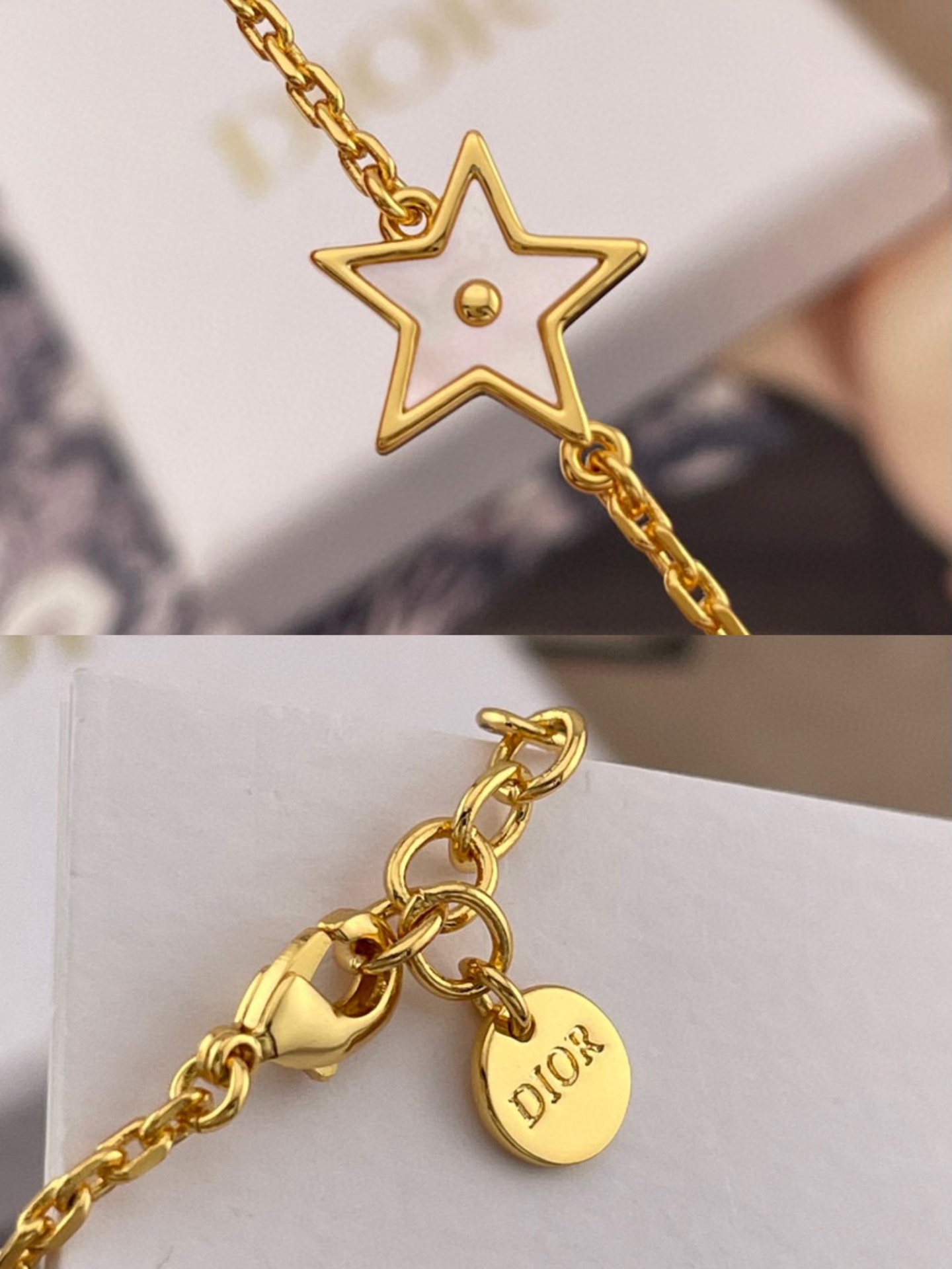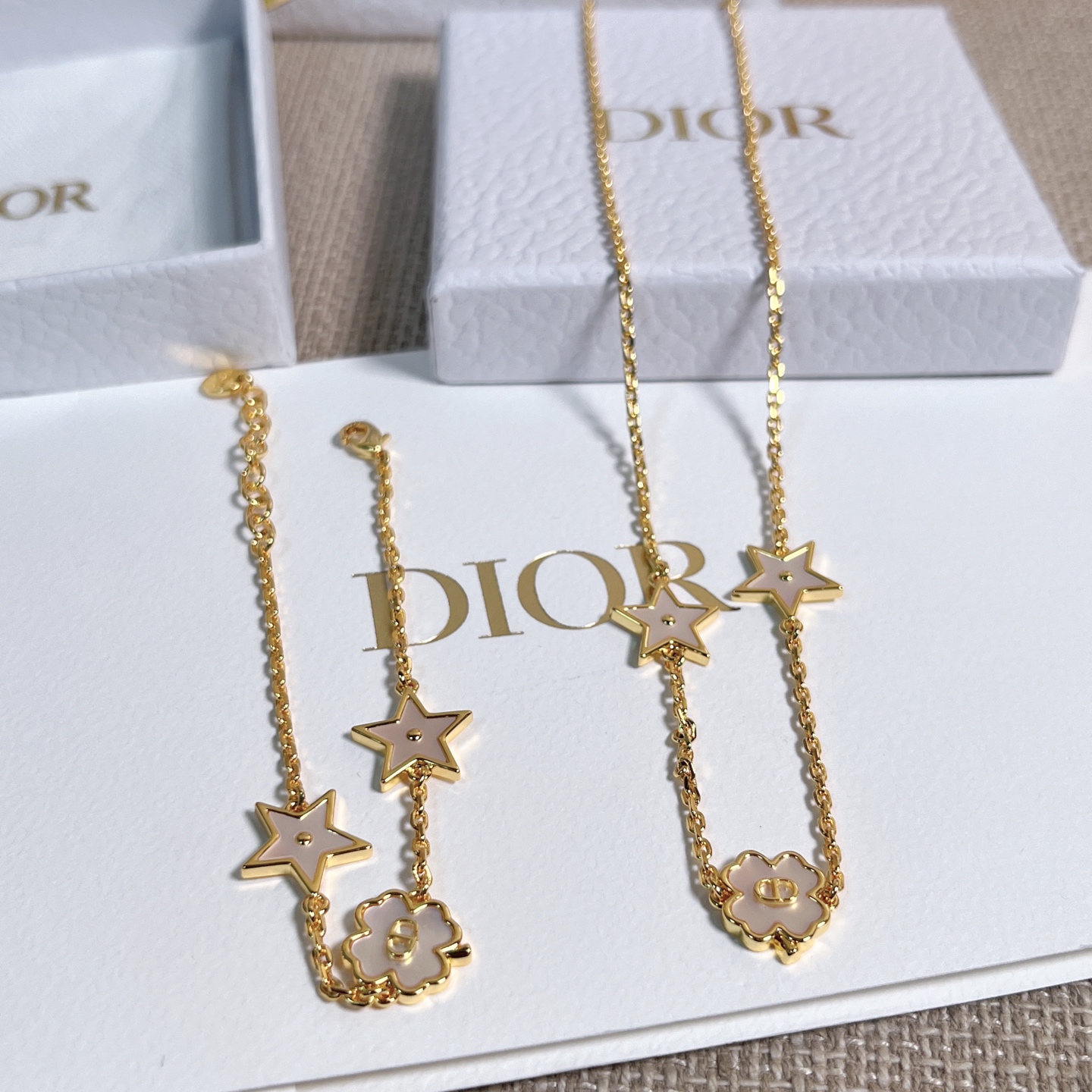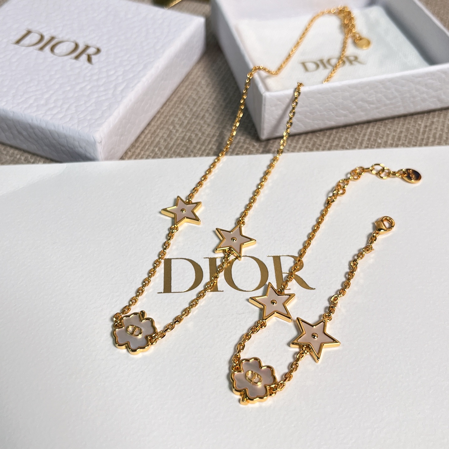 這條項鍊結合了品牌經典的 CD logo 與幸運四葉草設計,星星與四葉草皆採用天然貝殼打造,每一顆都有獨一無二的紋理與光澤。從不同角度看,都能折射出細緻變幻的色彩層次,溫柔又閃耀,像是把星光與月色都鎖進了項鍊裡。