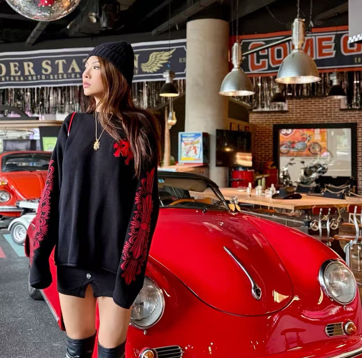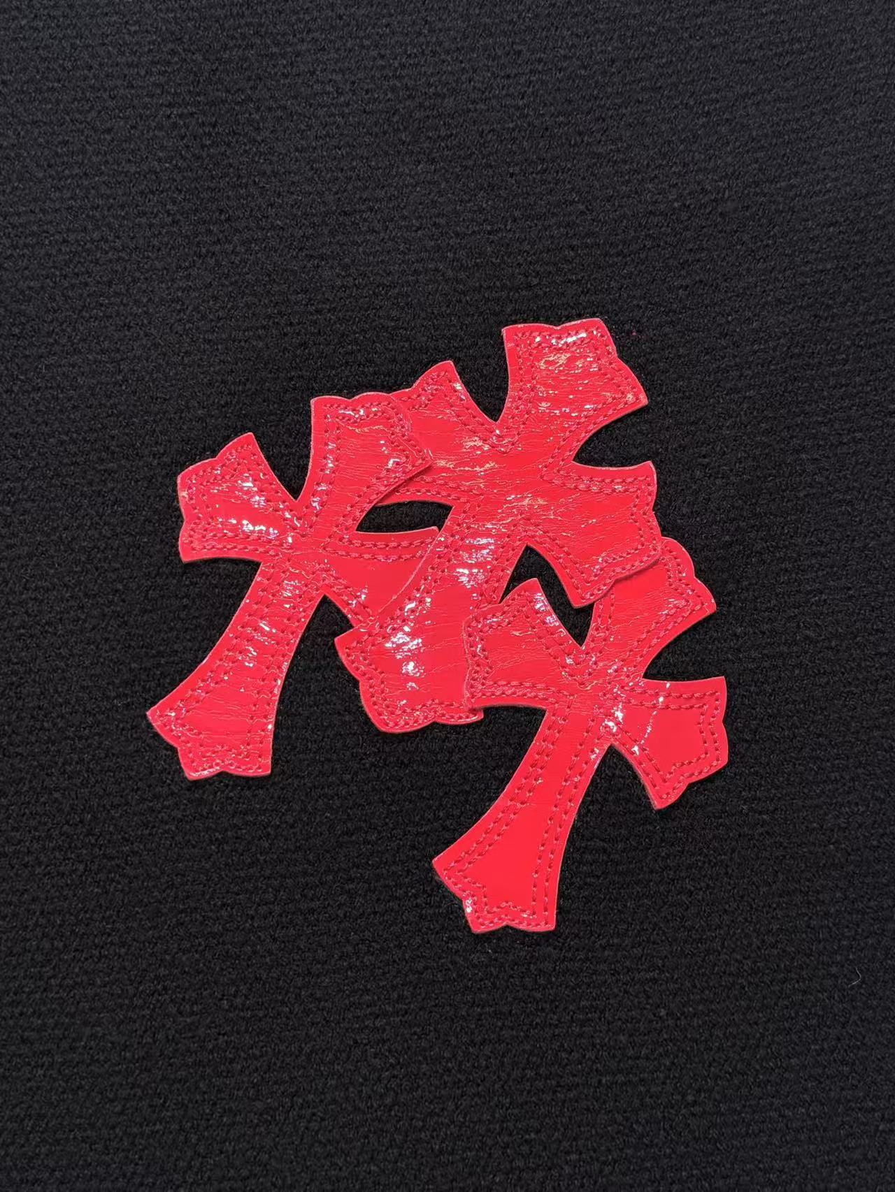 最令人驚豔的細節在於鮮紅色的皮革十字架貼飾,與衣身織紋形成強烈的異材質碰撞,賦予了這件針織衫鮮明的層次感。