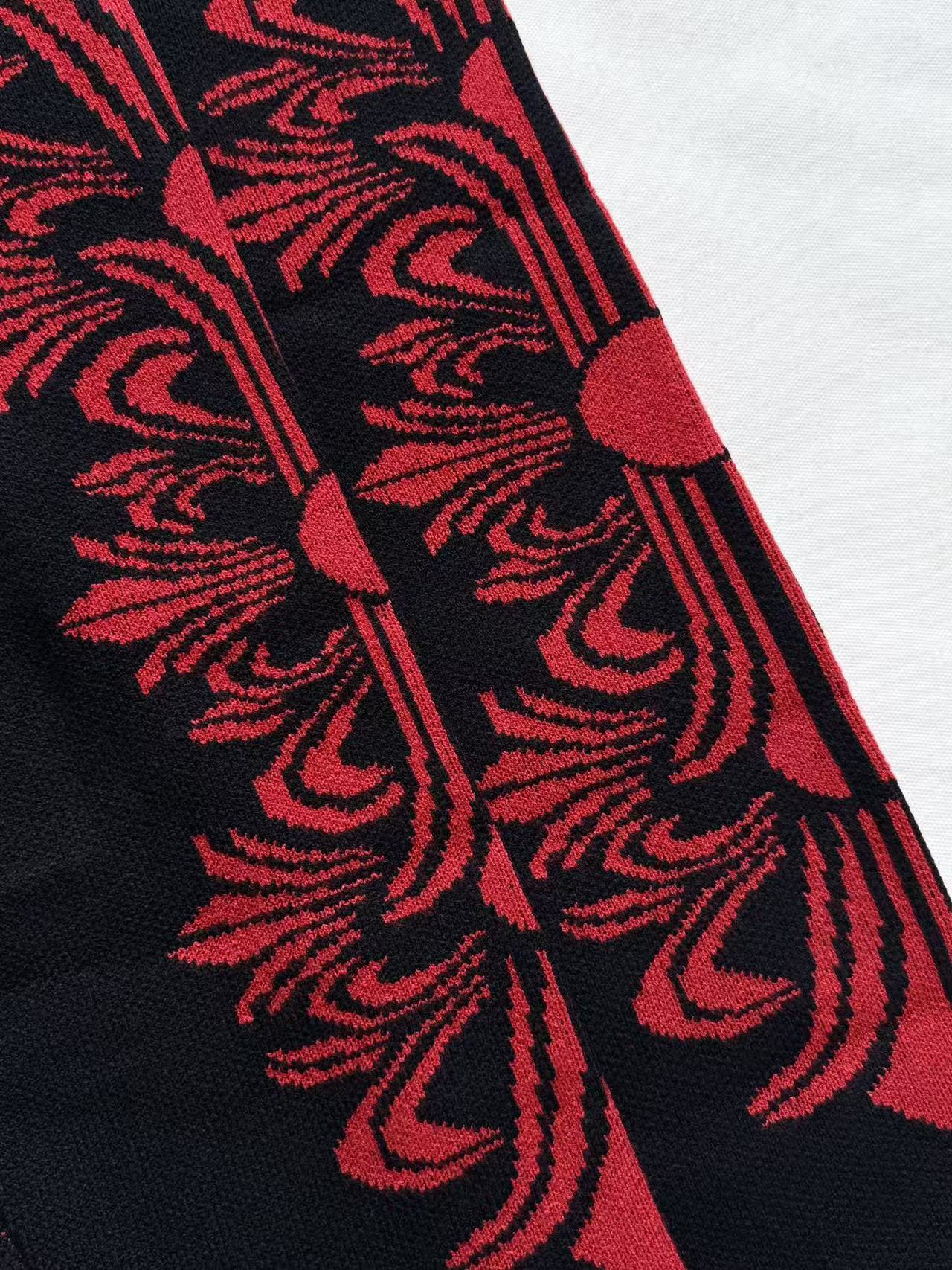 視覺衝突的叛逆交響:十字架紅色皮標撞色提花針織衫