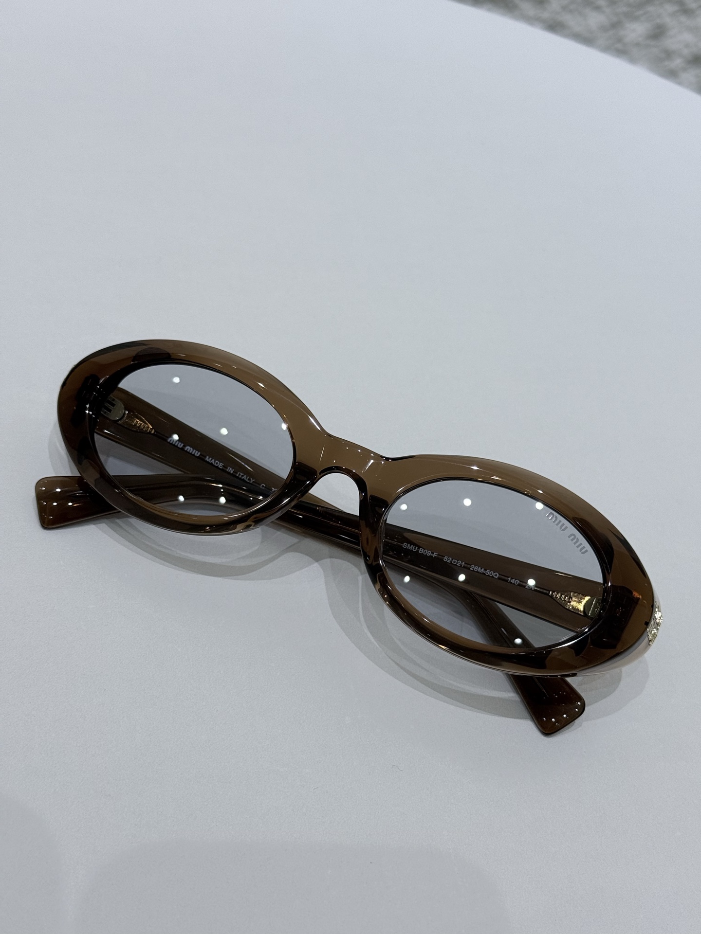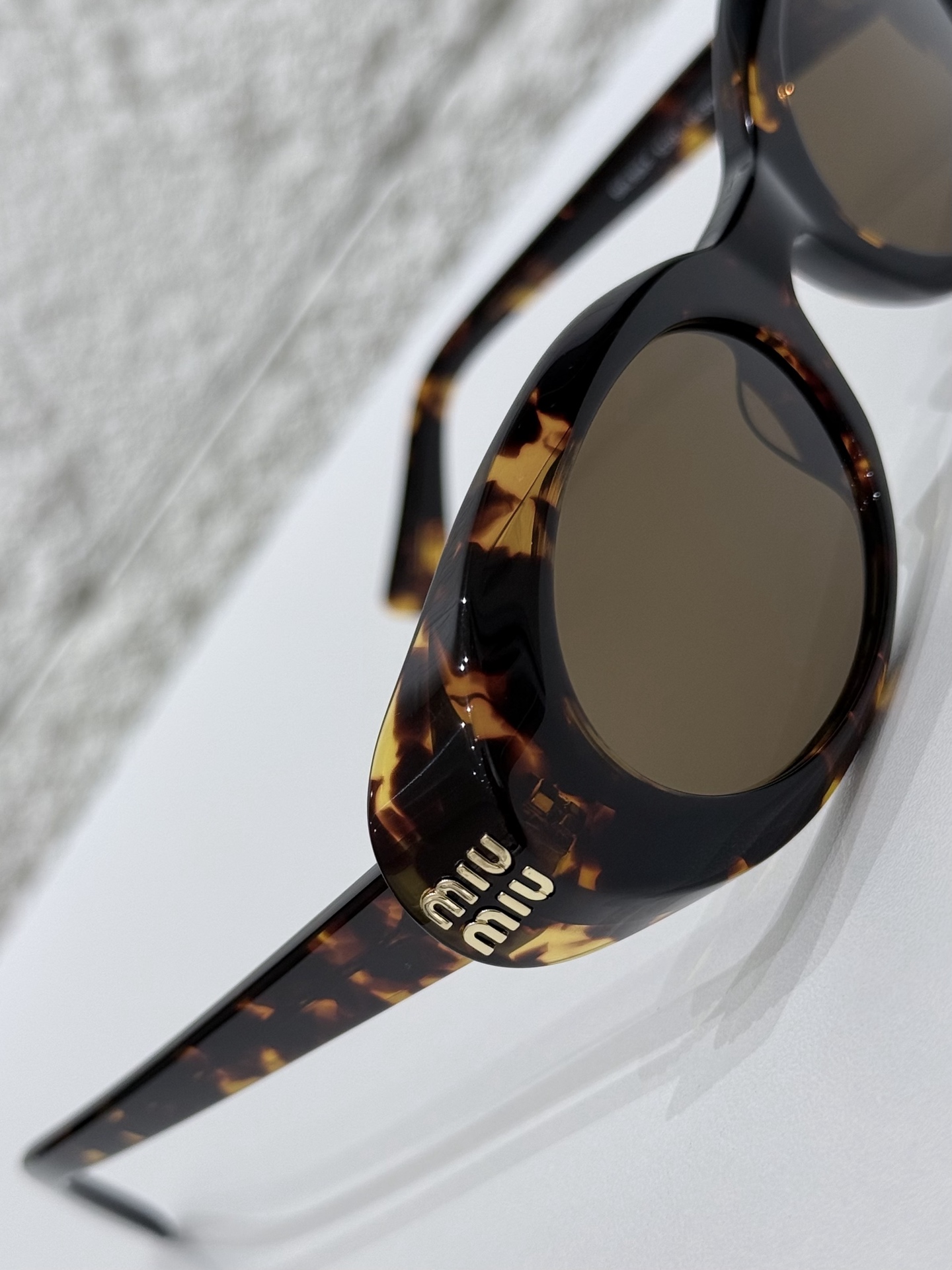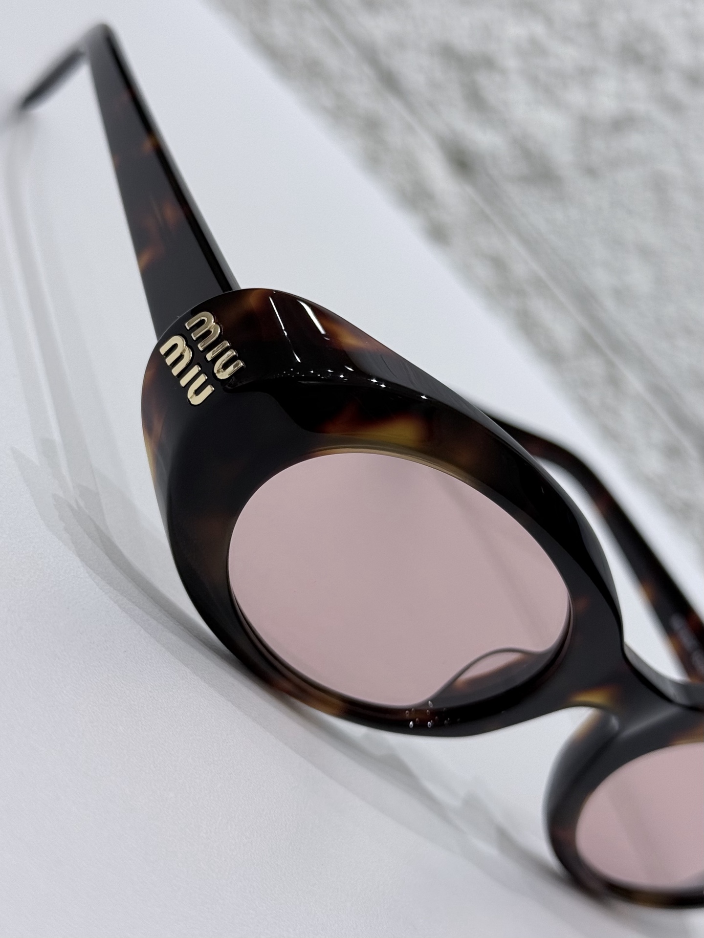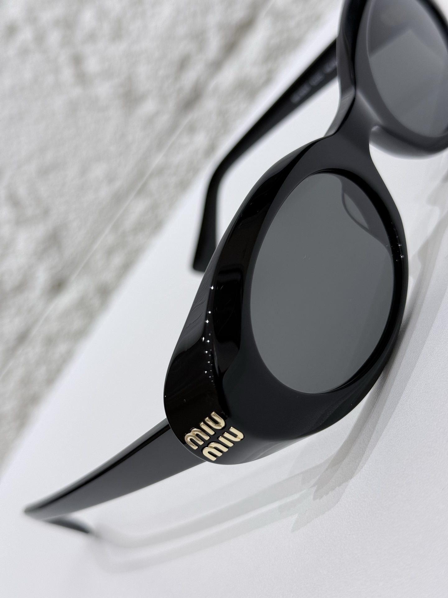 細節更是這副墨鏡的靈魂所在。鏡腿融入金屬質感飾件,縱向鐫刻的Miu 徽標低調卻有辨識度,搭配精密鉸鏈結構,開闔順暢、支撐力佳。