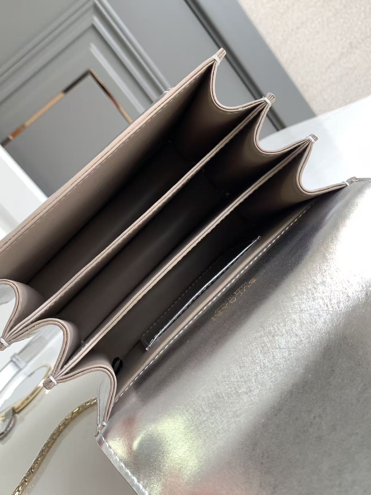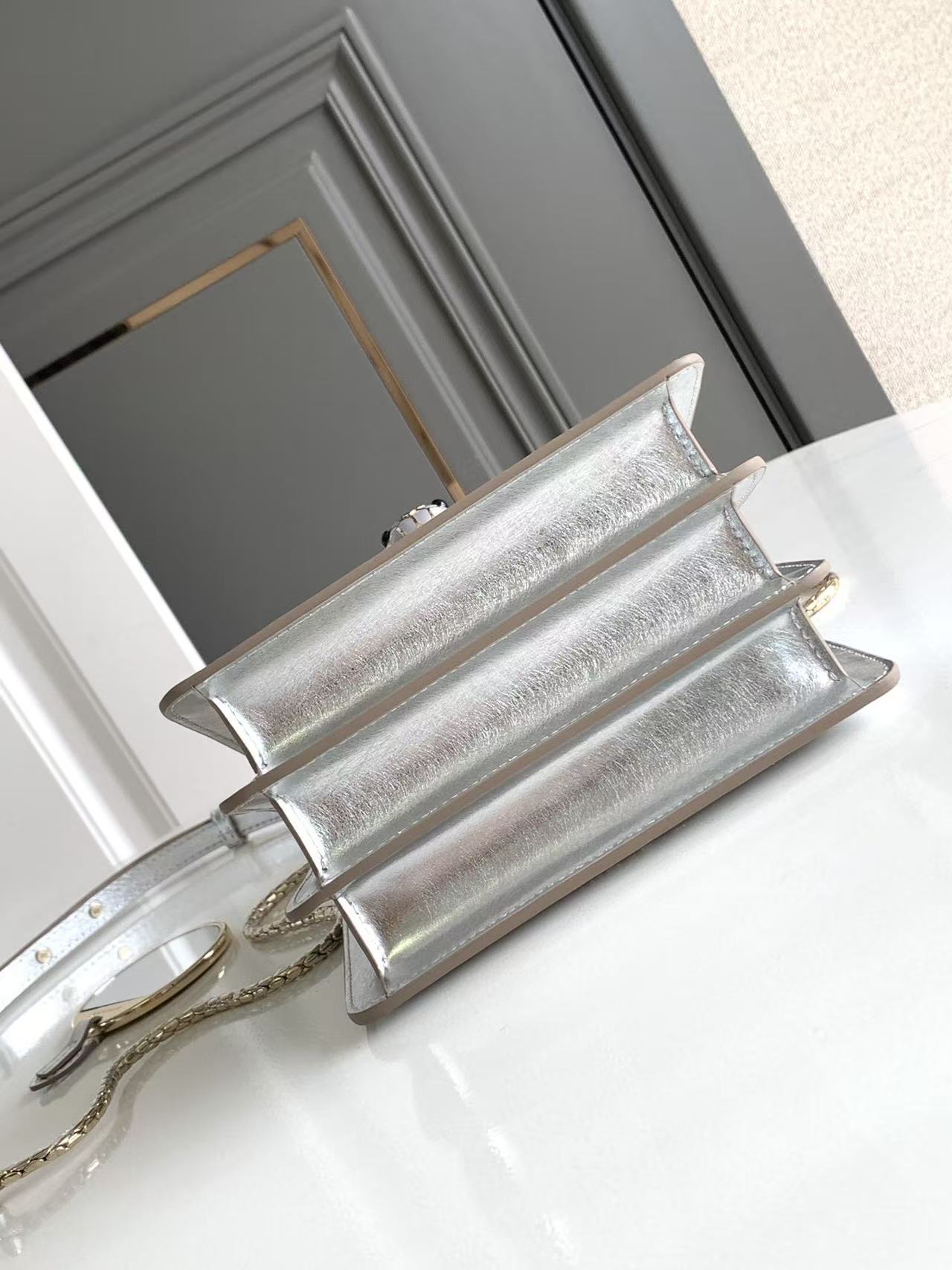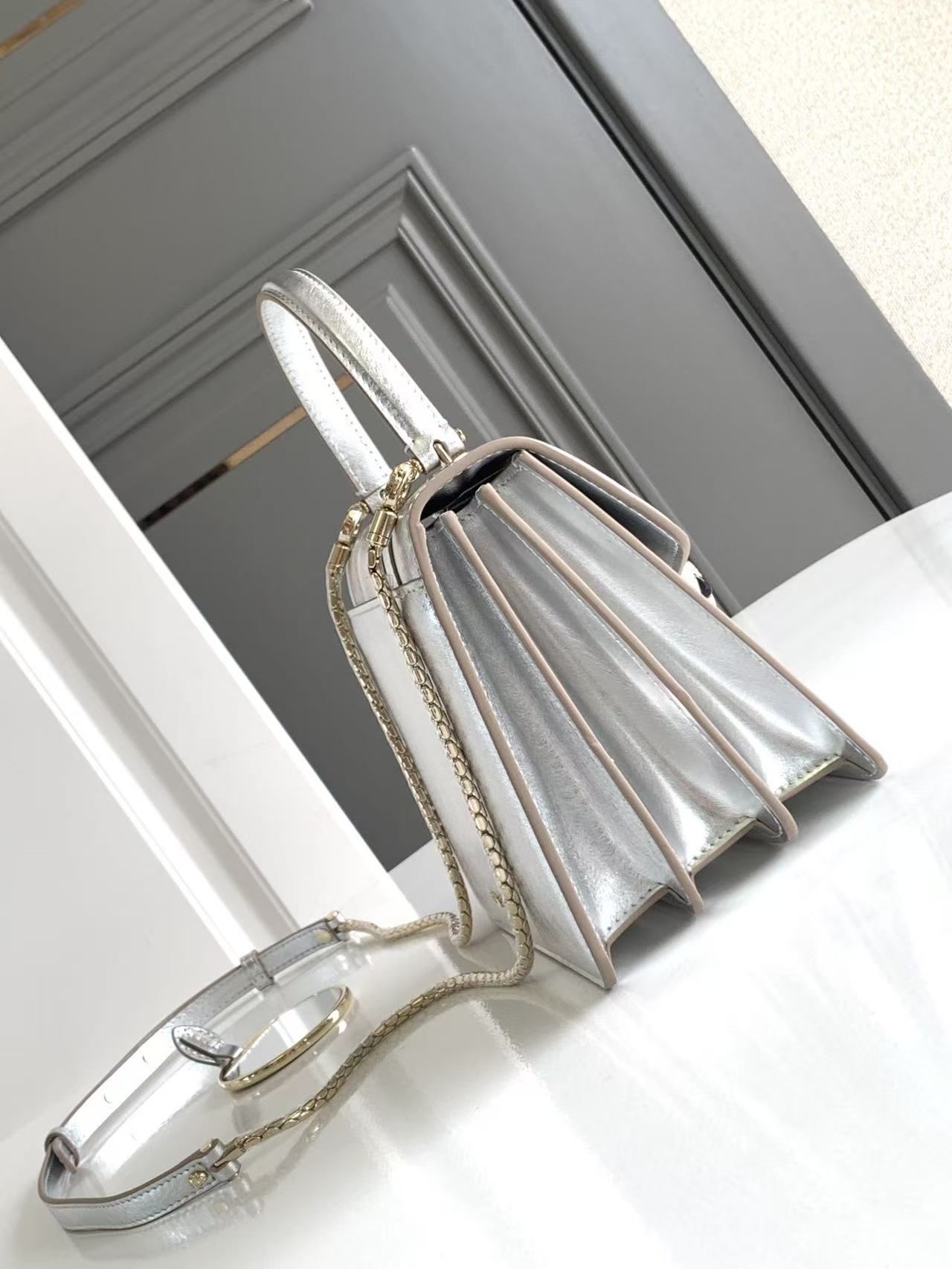 這款包的材質真的非常特別!它採用了銀色的紋理小牛皮製作而成,這種獨特的處理工藝,不僅完美彰顯出高級的金屬質感,那精緻的紋路更是讓人聯想起鑽石原石美麗的內含物,充滿了視覺的享受。搭配上淺金鍍金的黃銅配飾,整體奢華感瞬間拉滿。