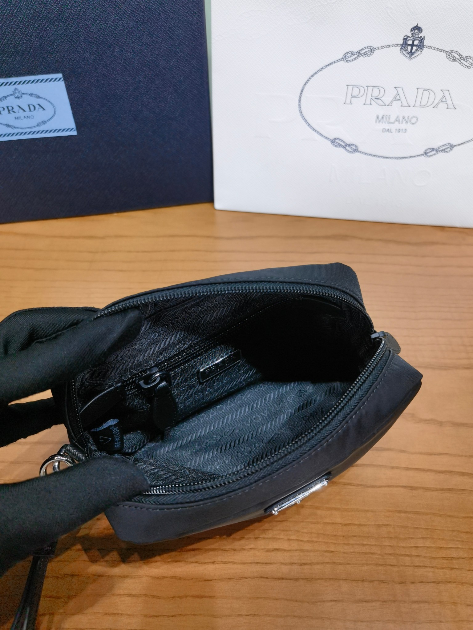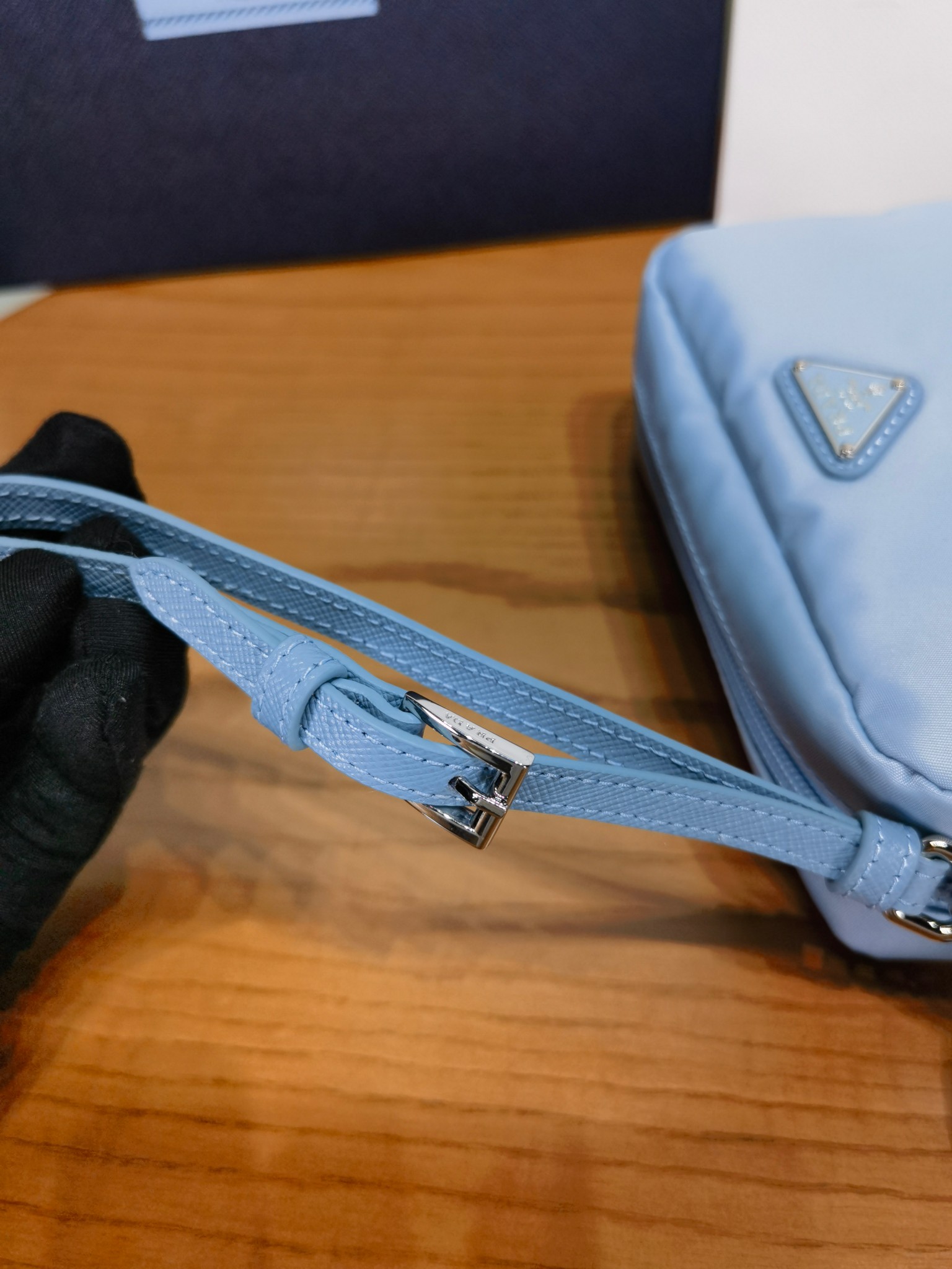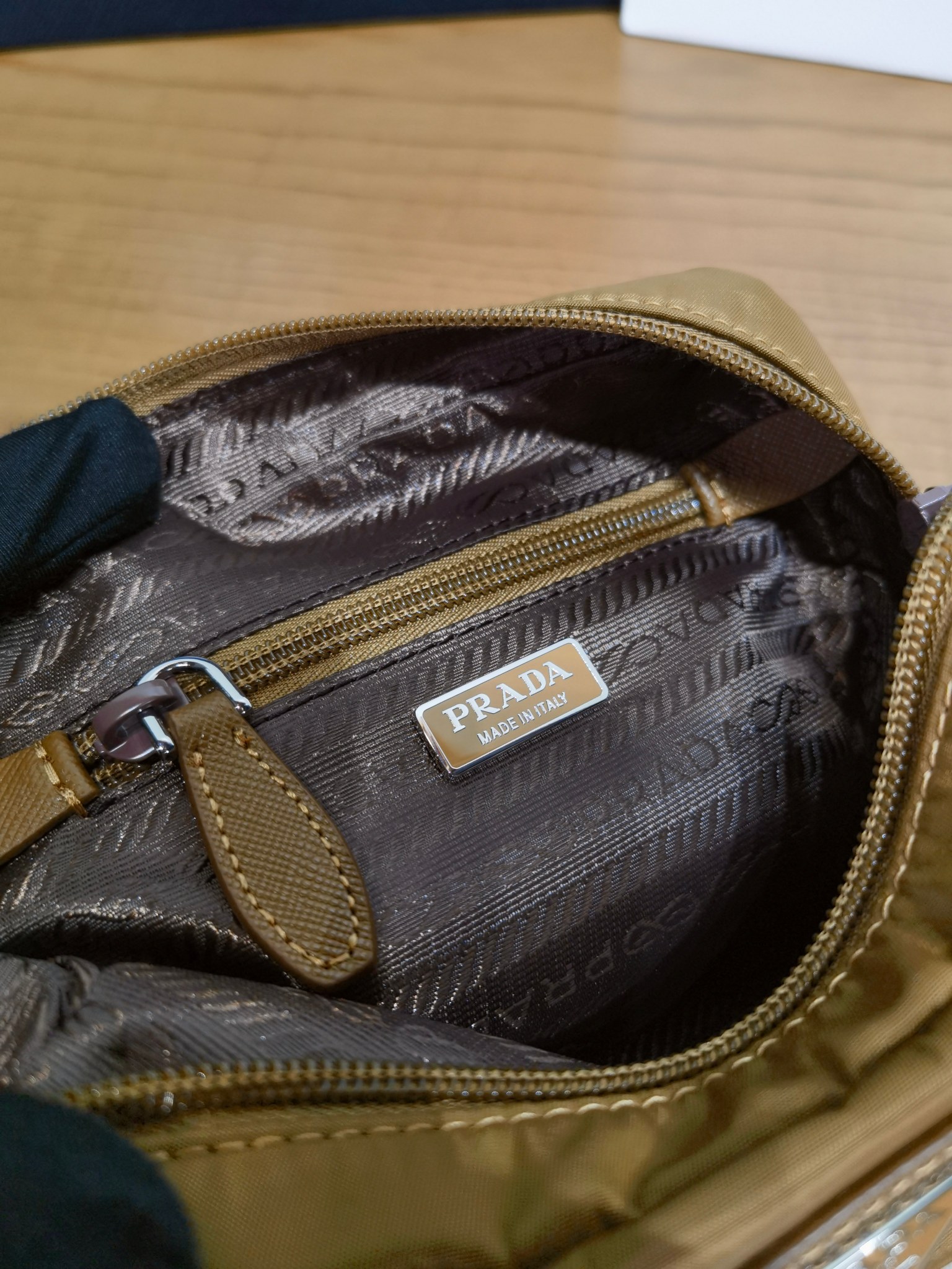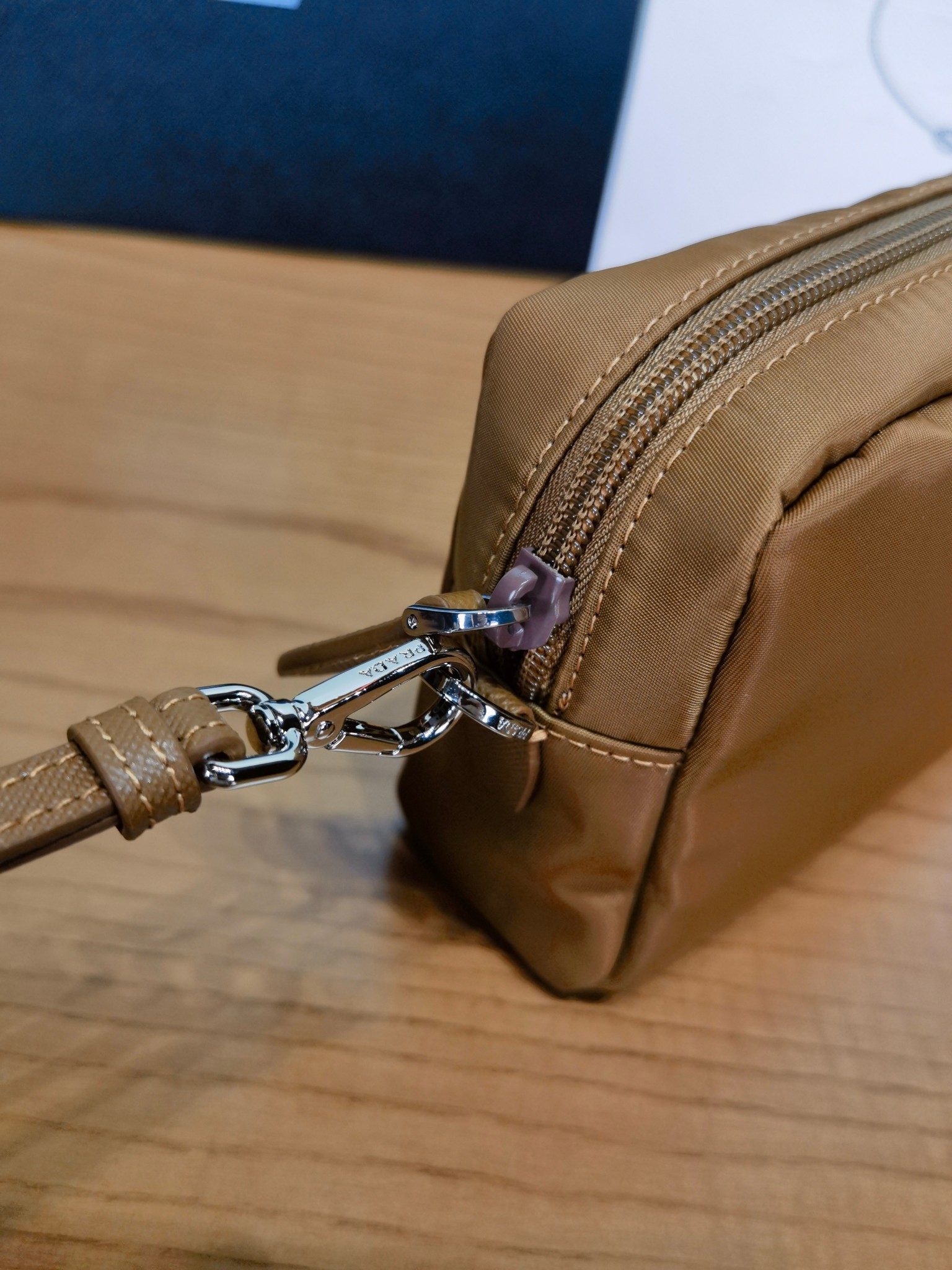 包身正面飾有經典琺瑯金屬三角形徽標,低調卻極具辨識度。內裡同樣採用 Re-Nylon 再生尼龍襯裡,並附有拉鍊口袋,方便收納零碎物品。搭配可拆卸皮革腕帶,無論手拿或收納於大包中都非常方便。