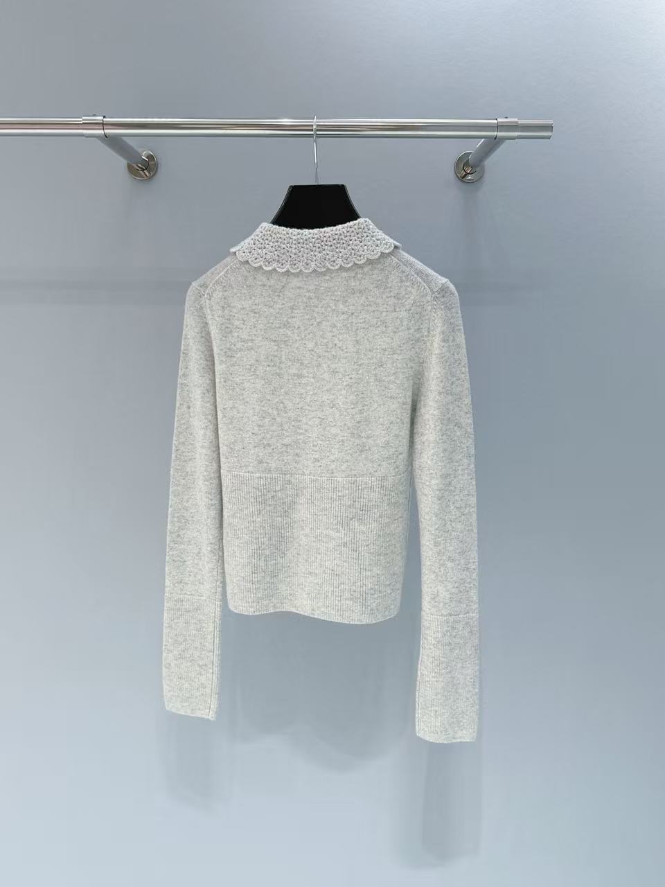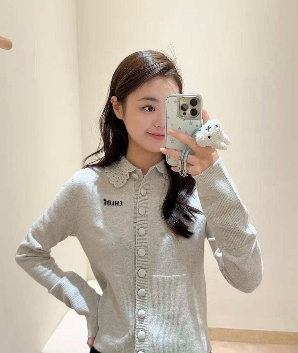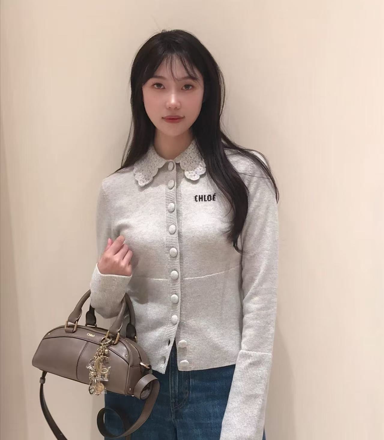 設計上,娃娃領是最大亮點,搭配蕾絲細節增添浪漫氣息,正面還有品牌刺繡 Logo,低調卻有辨識度。