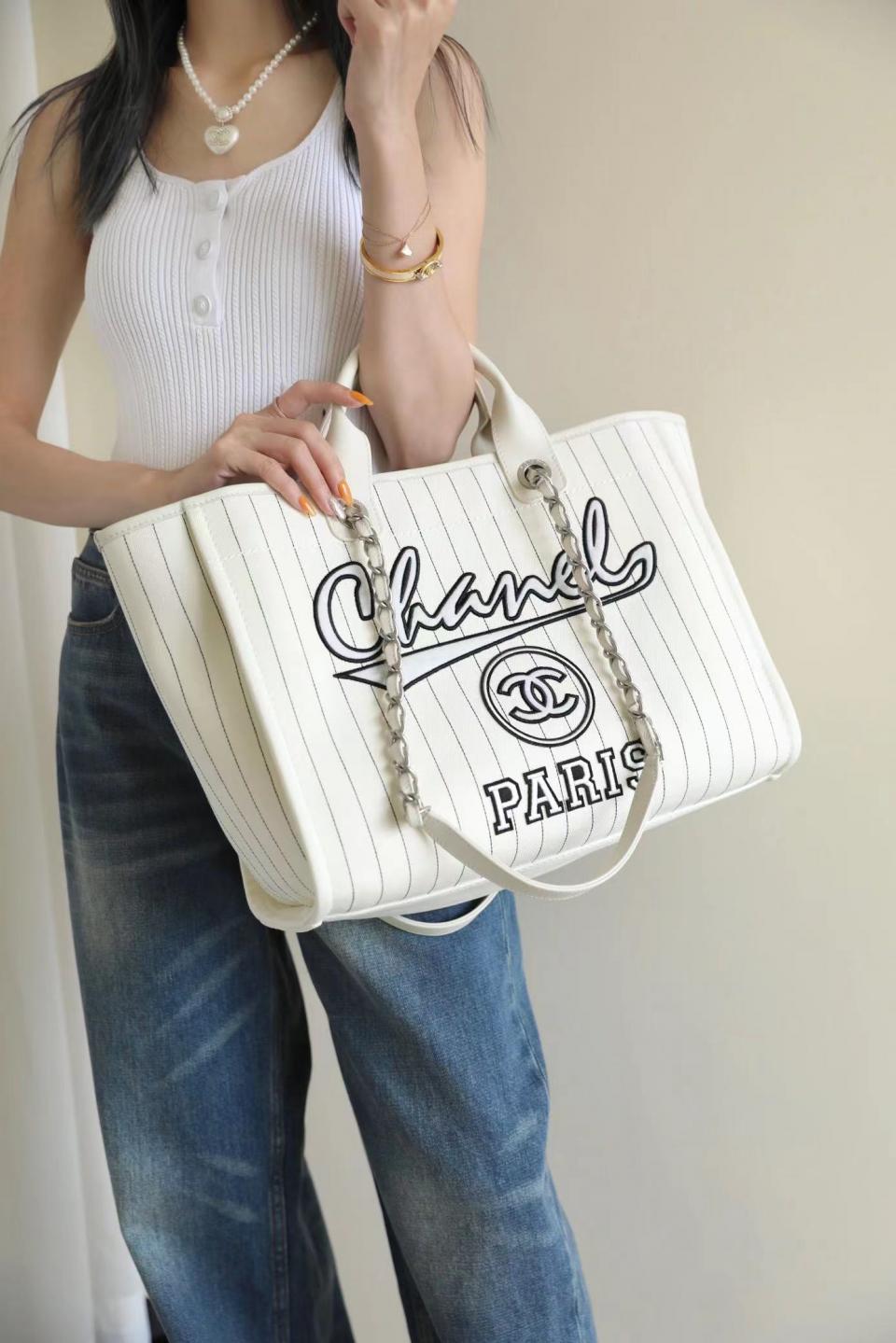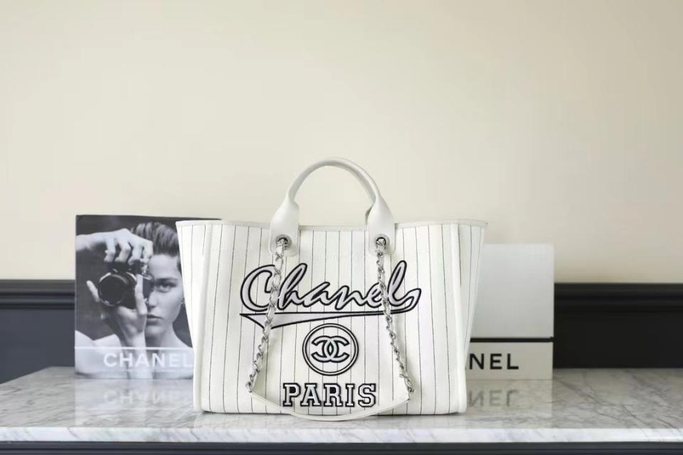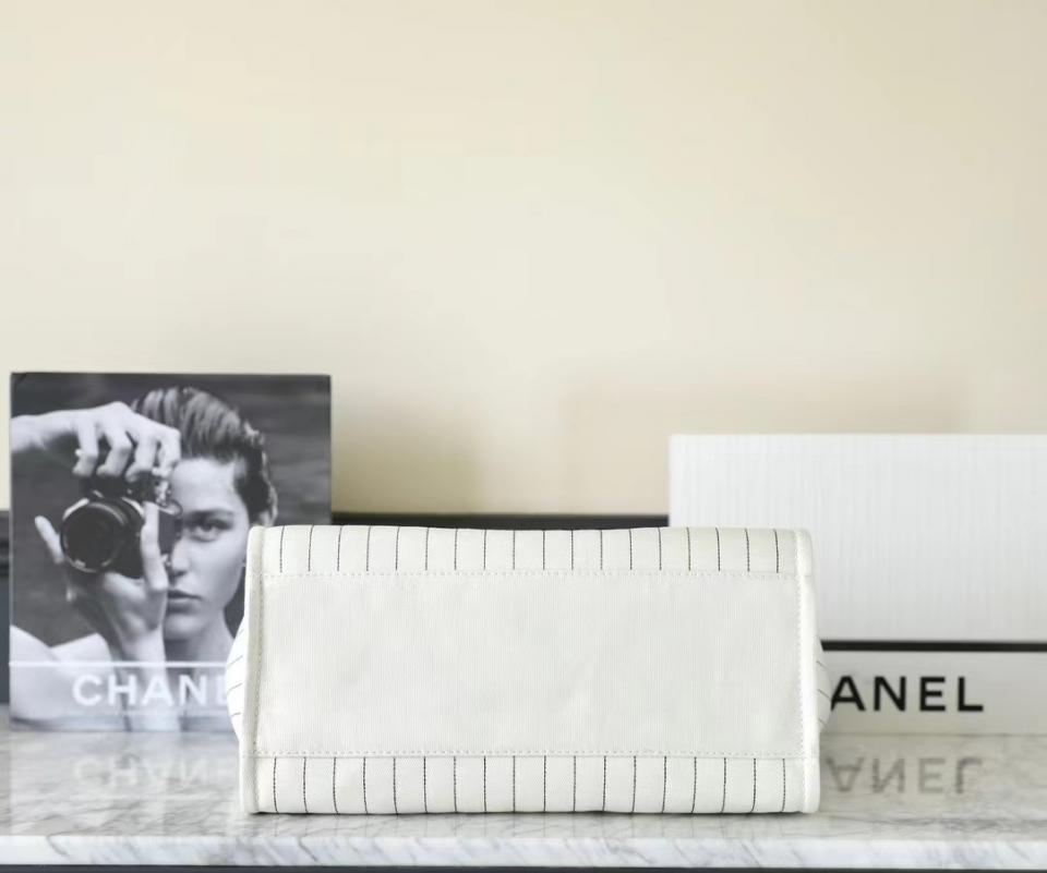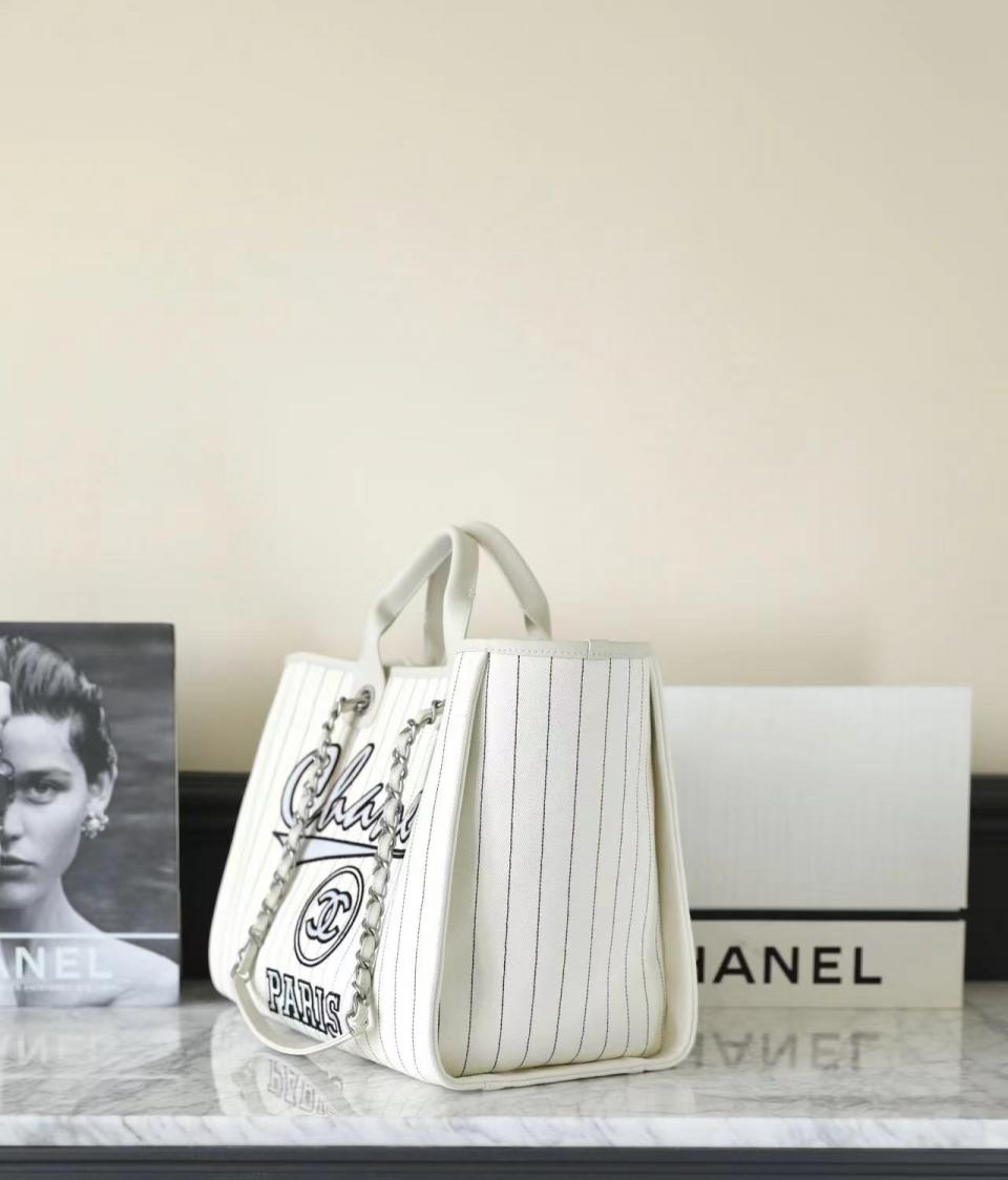 2023夏季新品 C家23p刺繡字母沙灘包(白色大號) 條紋設計 容量超大