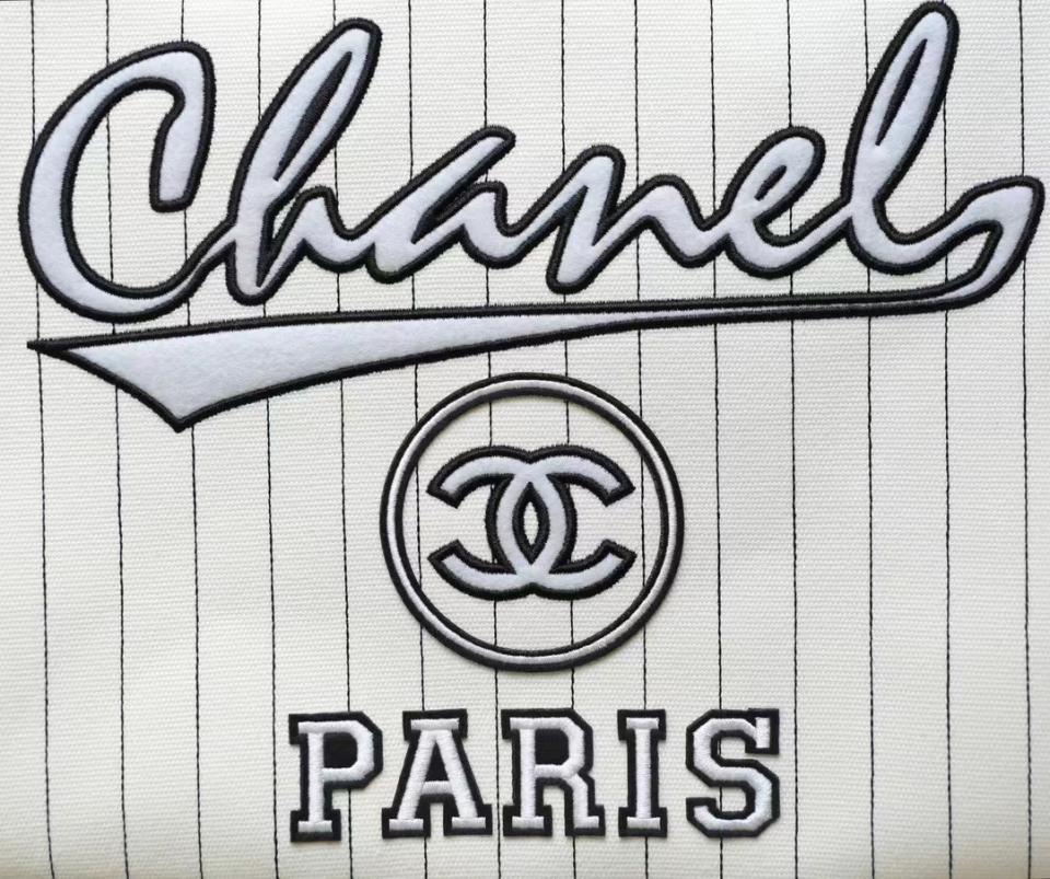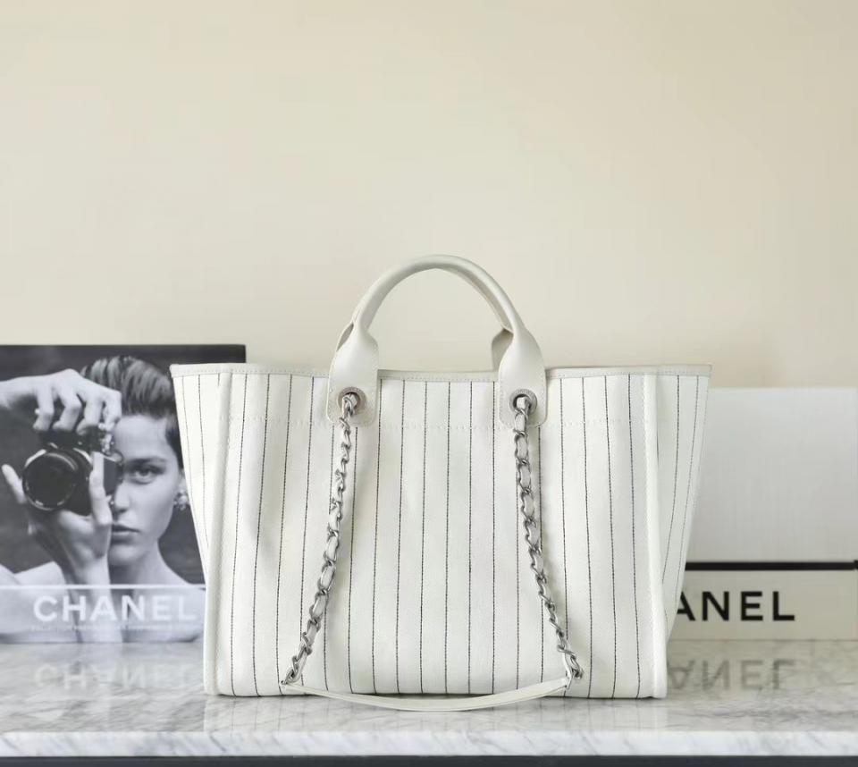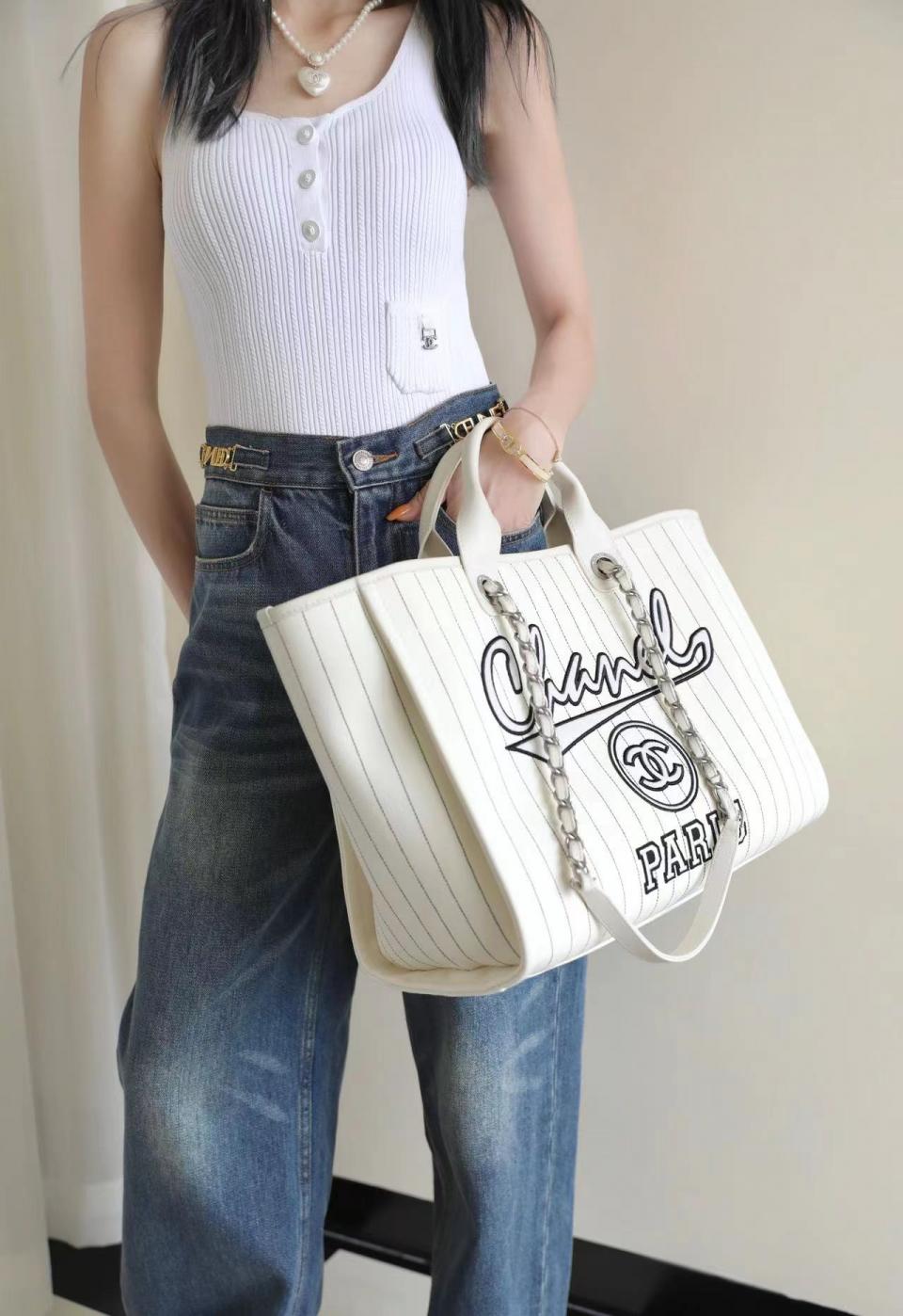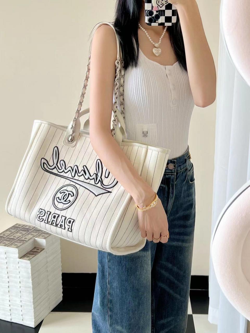 2023夏季新品 C家23p刺繡字母沙灘包(白色大號) 條紋設計 容量超大