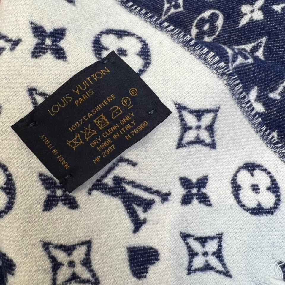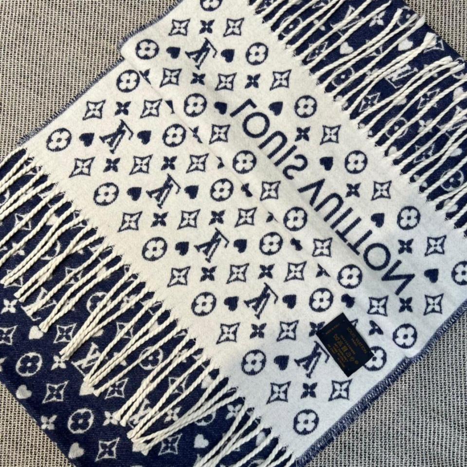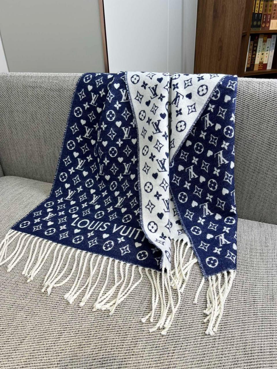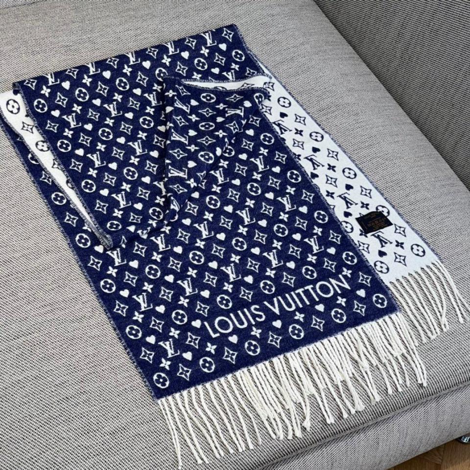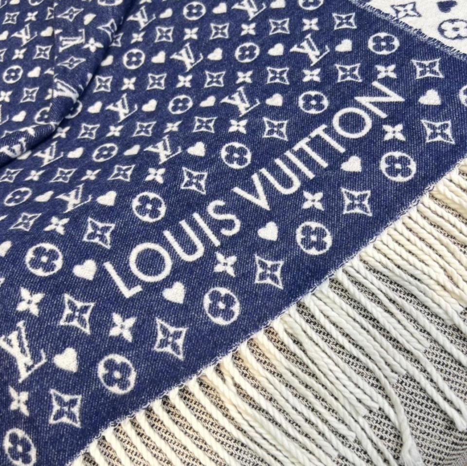 2022秋冬新品 L家滿版老花愛心圖案圍巾(牛仔藍) 羊絨材質保暖舒適