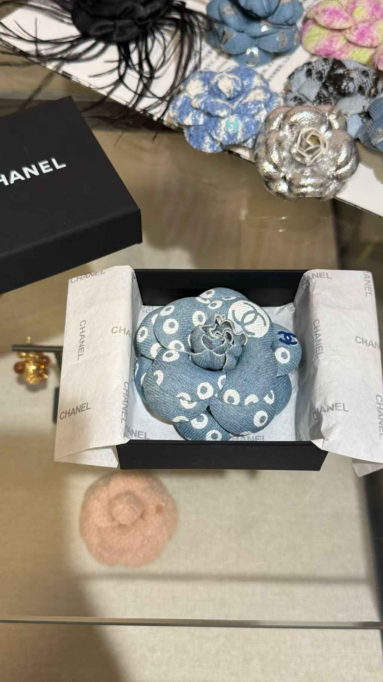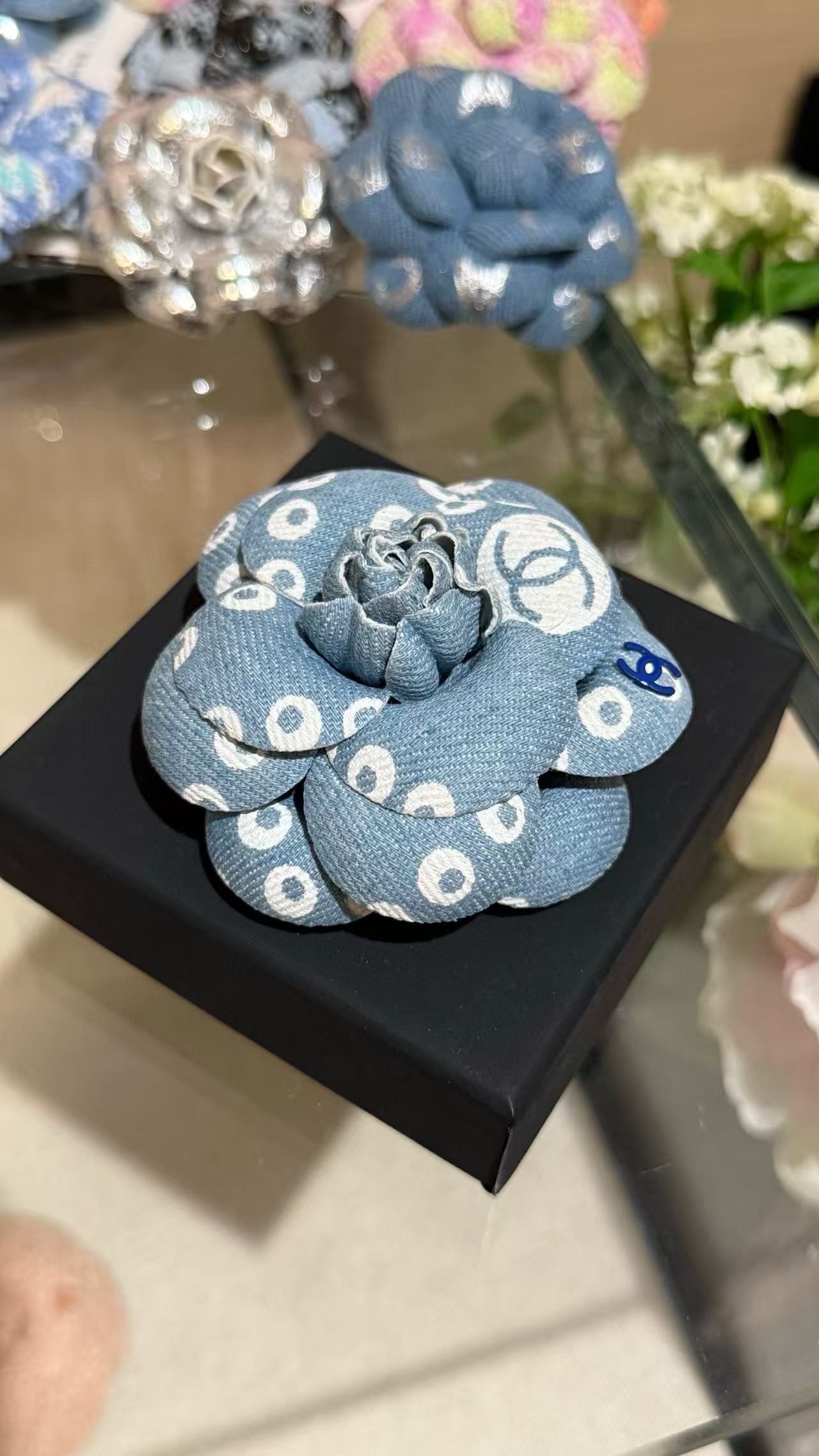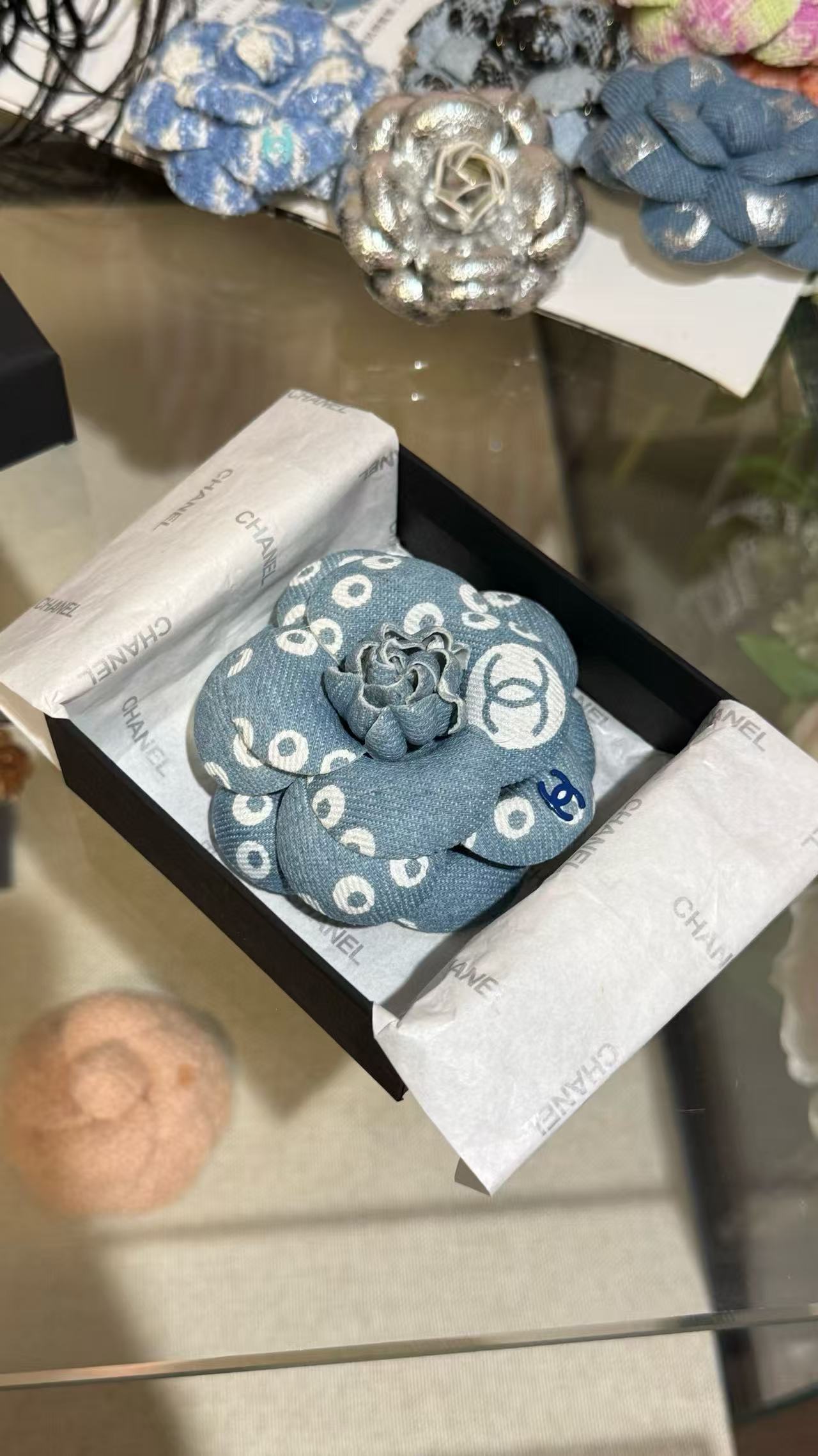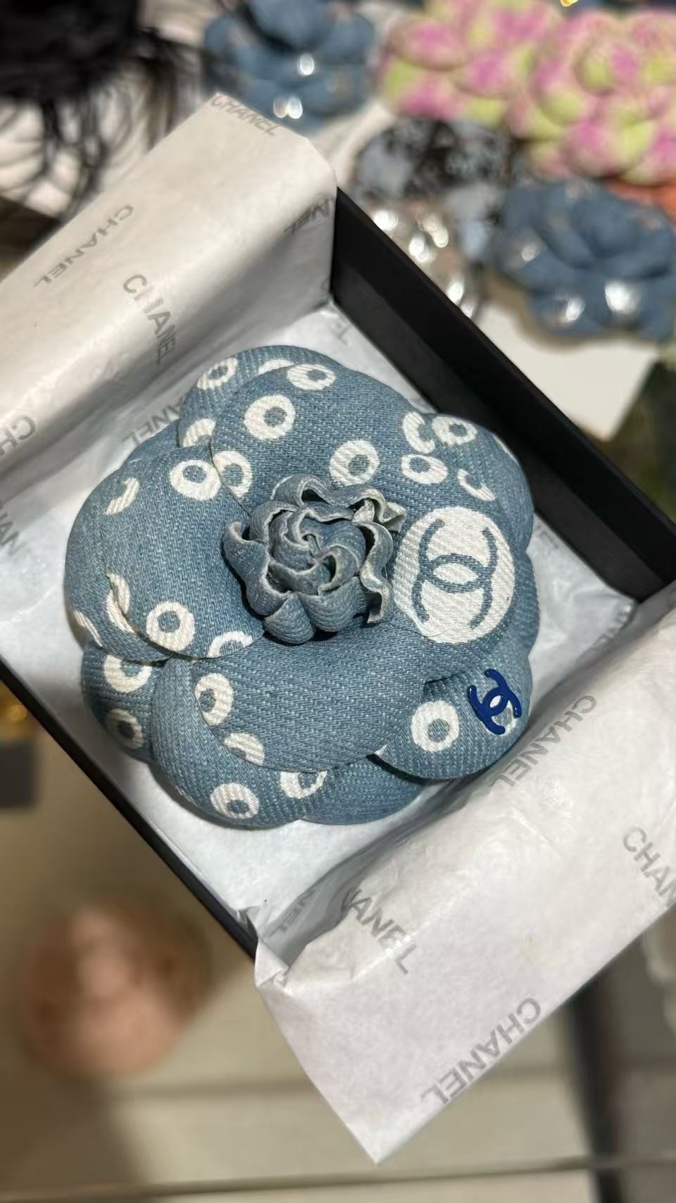 這款丹寧牛仔珍珠印花山茶花雙C胸針,以清新藍丹寧為基調,融合白色珍珠印花與標誌性山茶花及雙C設計,瞬間帶來復古濾鏡般的魅力。