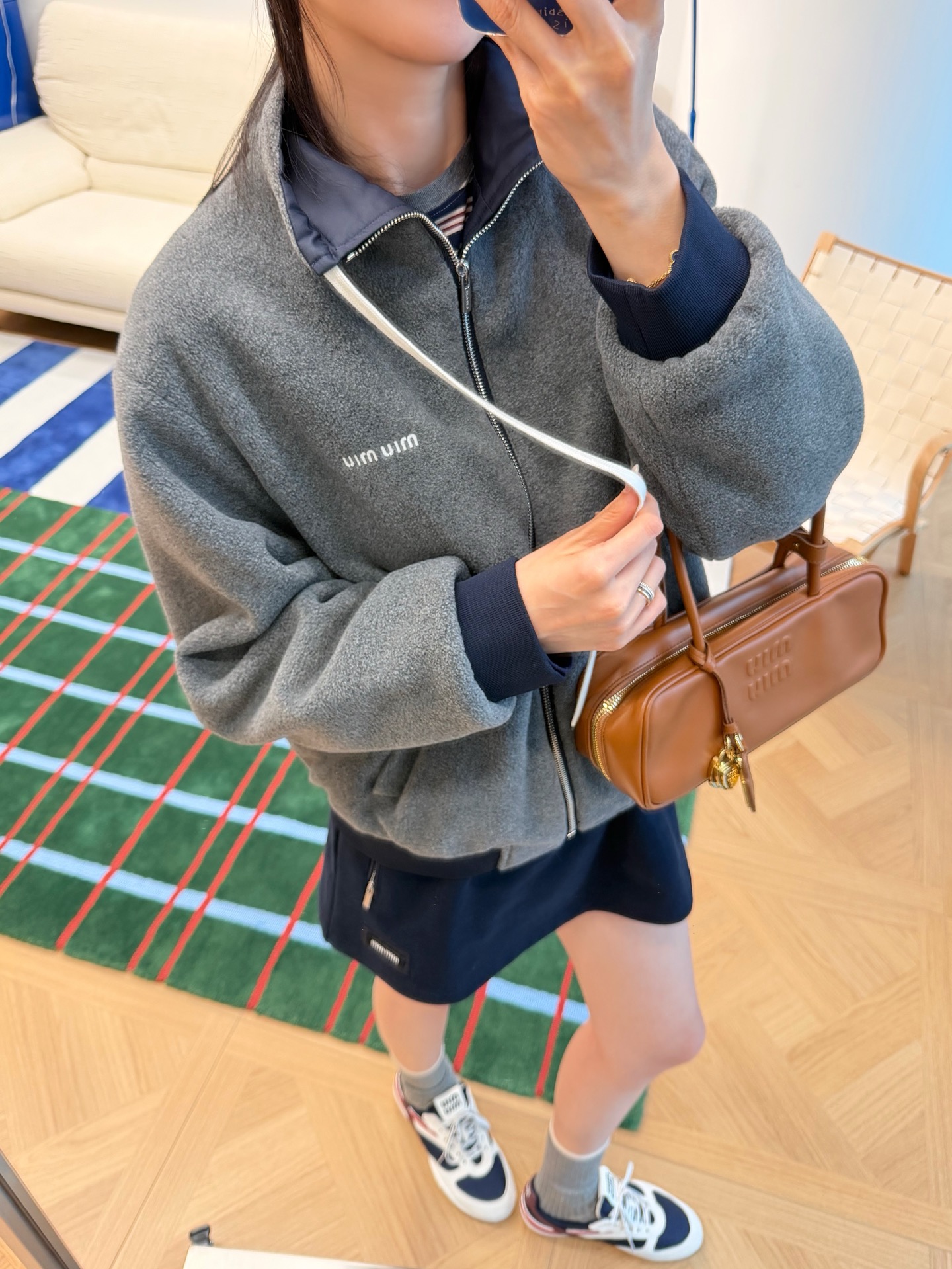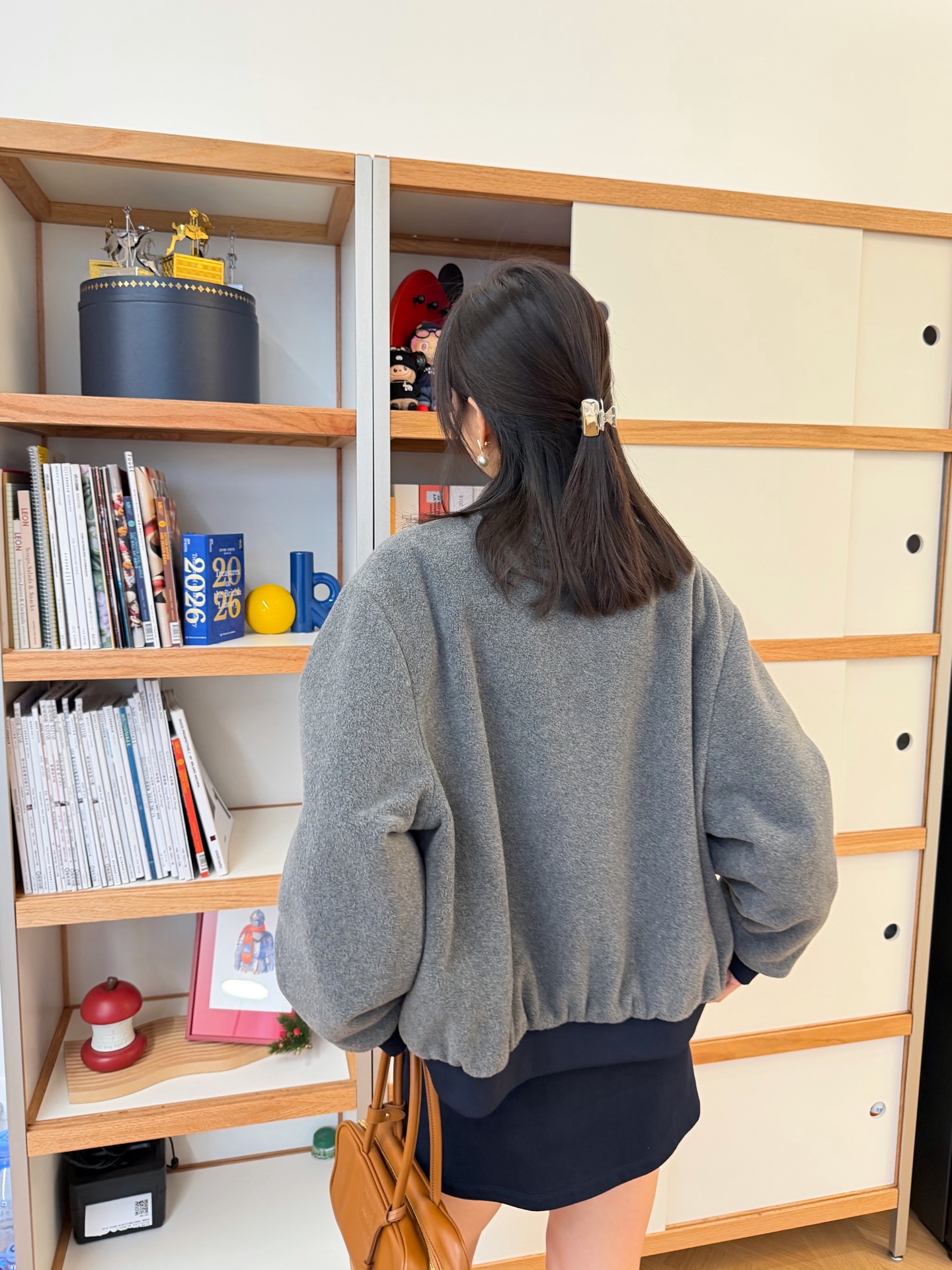 ・灰色絨面朝外,搭配針織褲或牛仔褲,溫柔又有鬆弛感