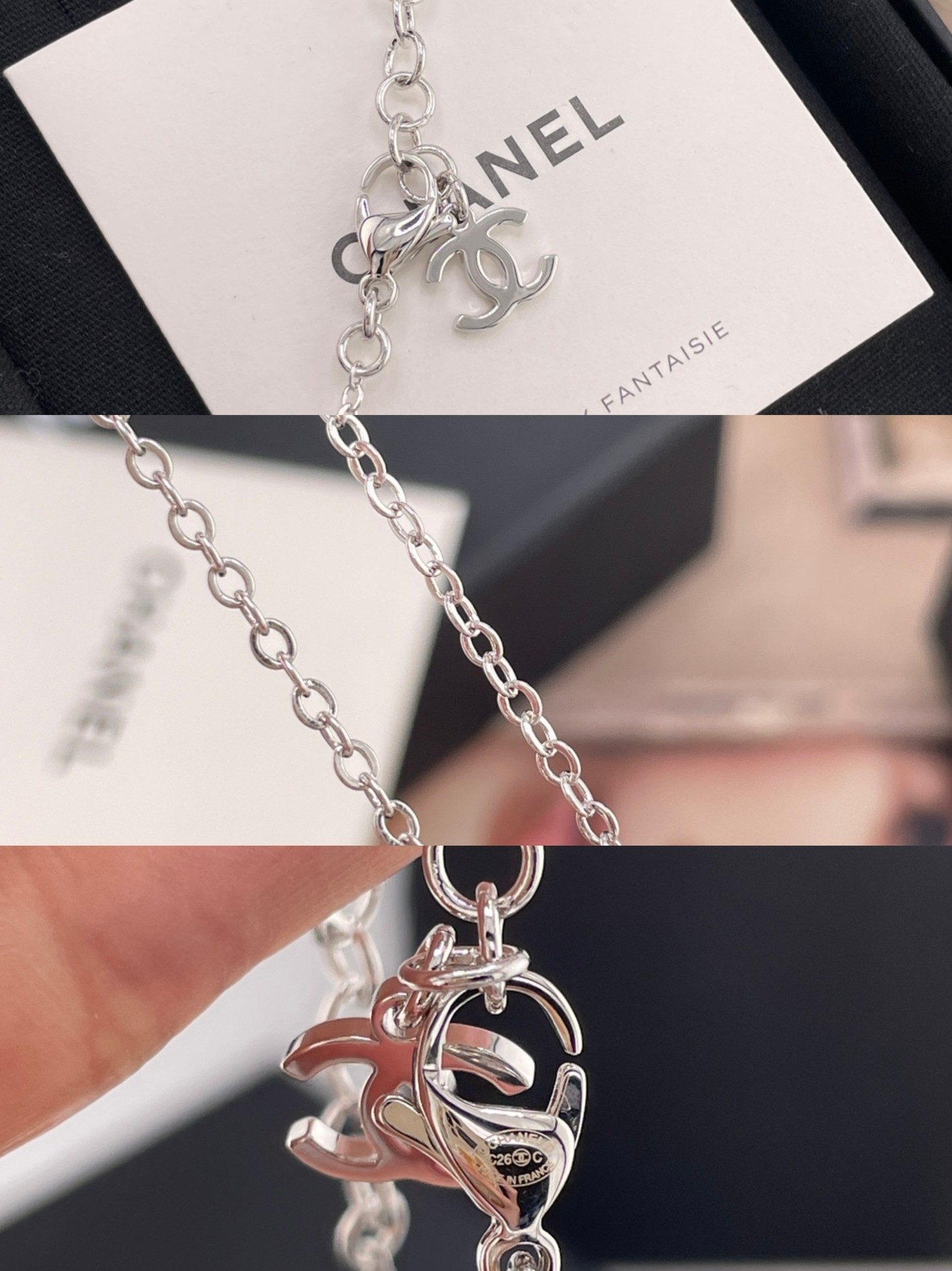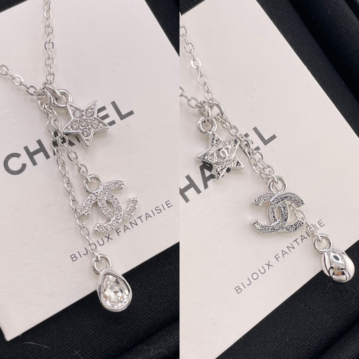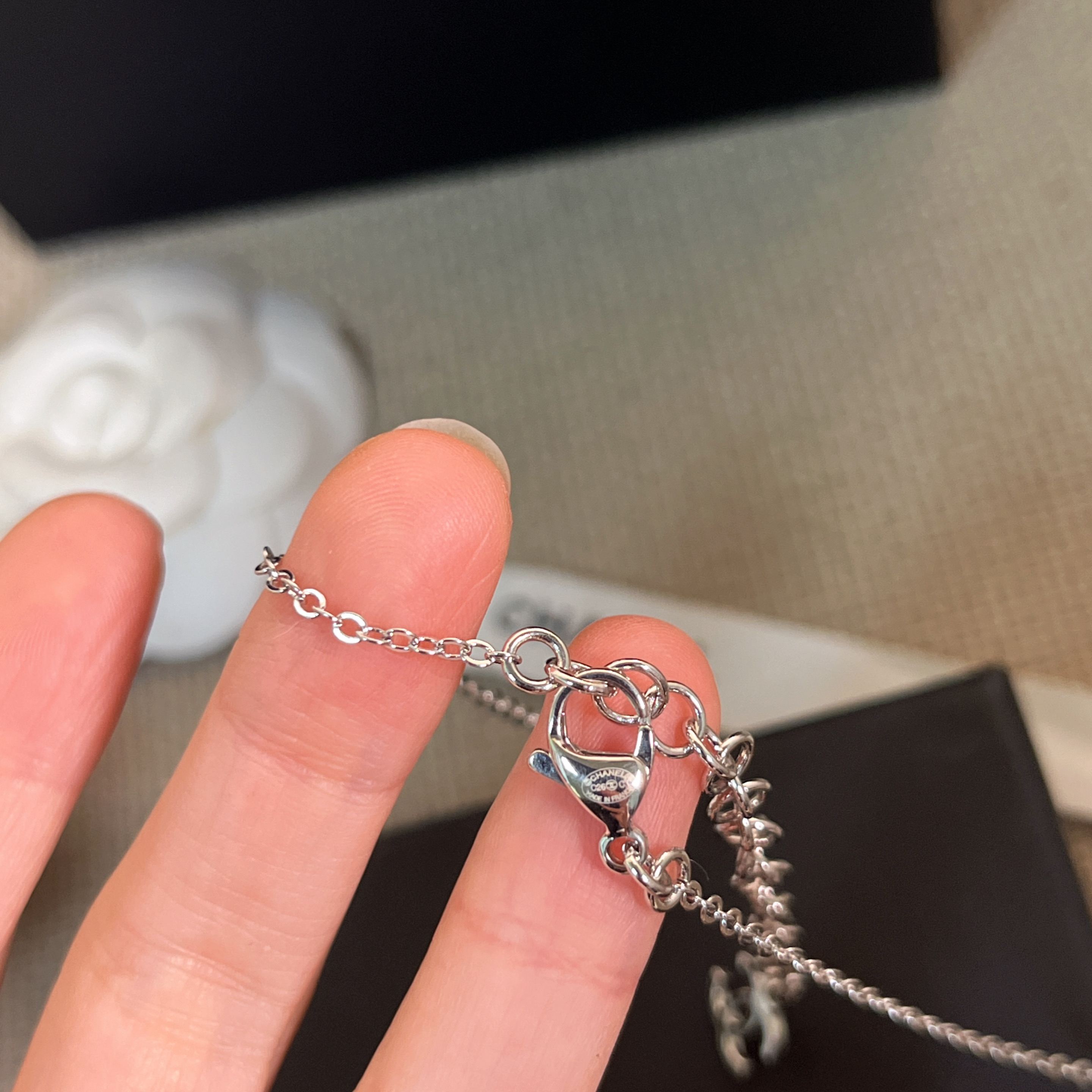 銀色配白鑽 / 鏈長約40 cm(含 8 cm 延長鏈),吊墜高約 4 cm,雙 C 寬約 1 cm / $ 1,780