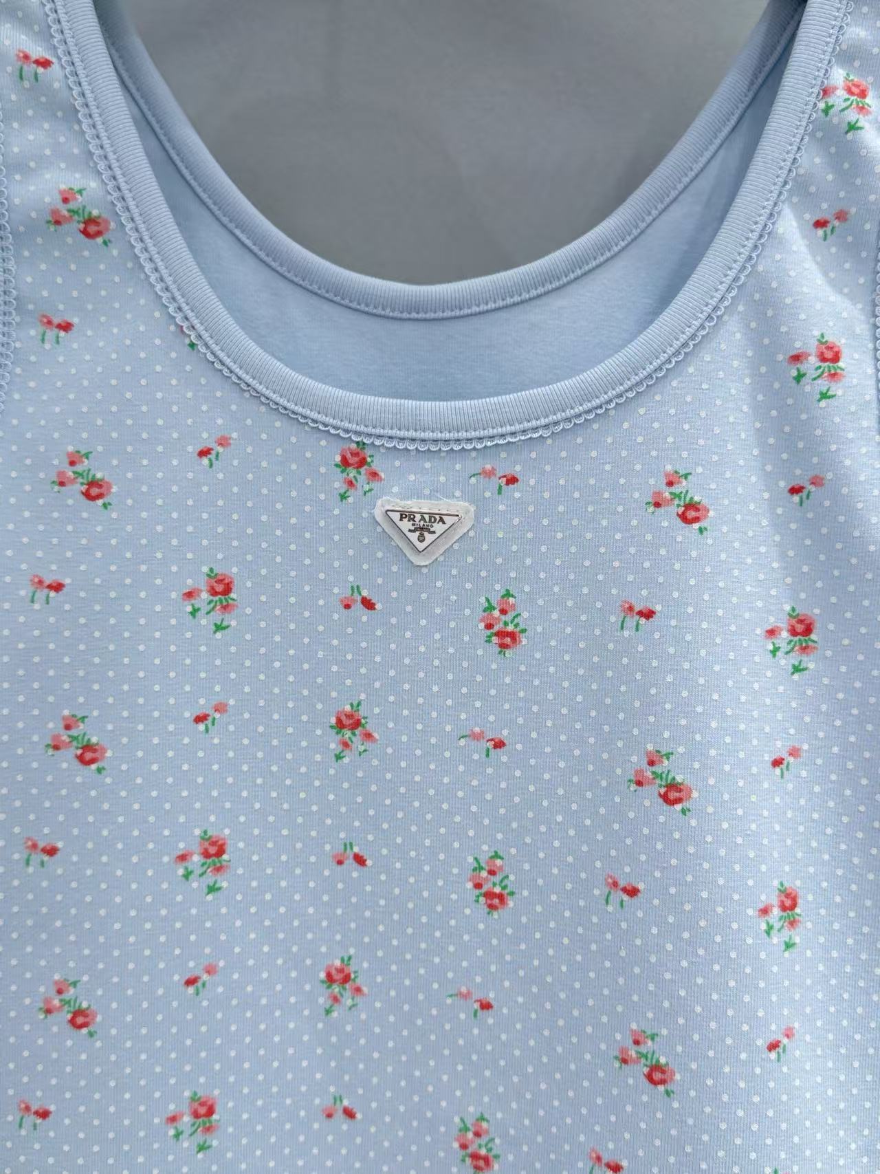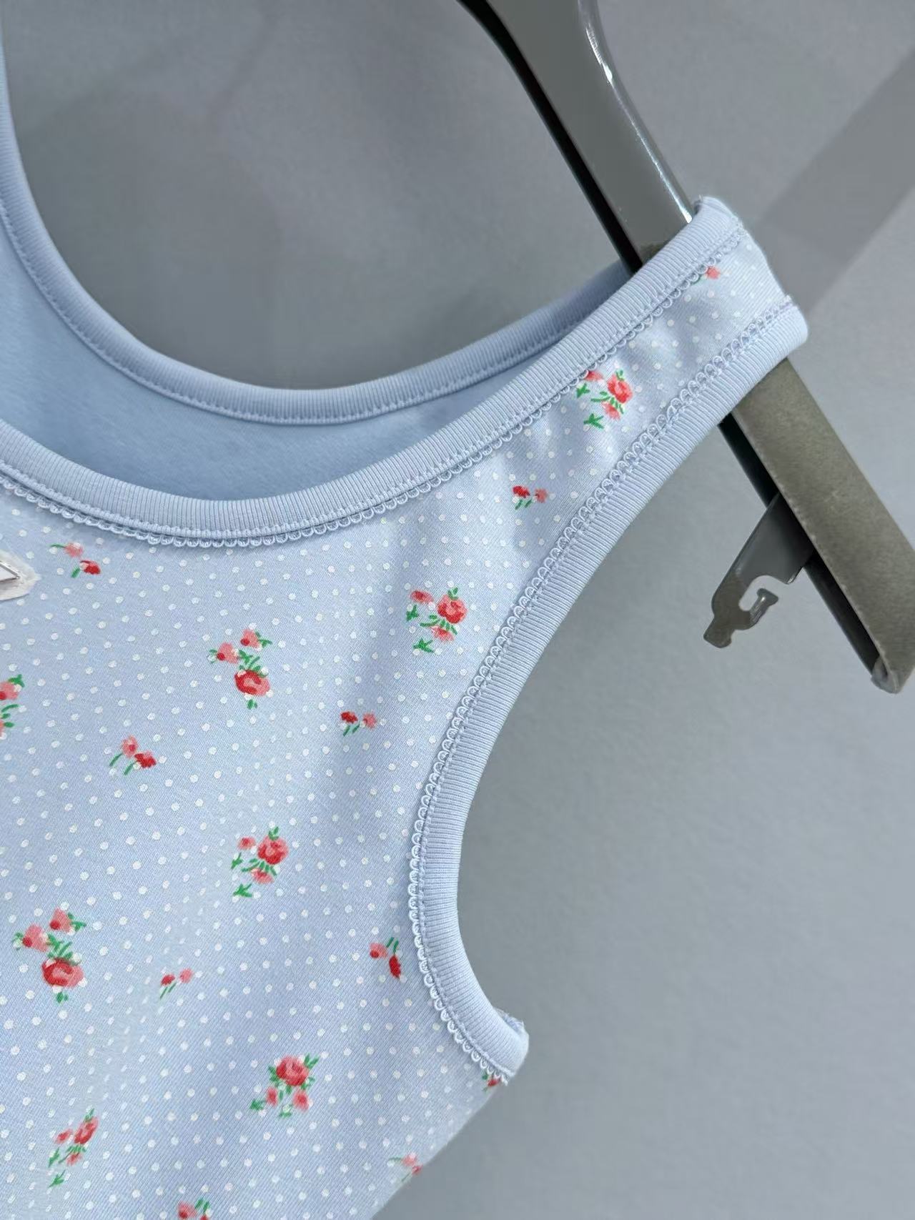 淺藍、純白與小紅花的交織設計 賦予了整件衣服極強的層次感,而領口與肩帶處的同色羅紋包邊,更是把精緻的少女靈魂直接拉滿。