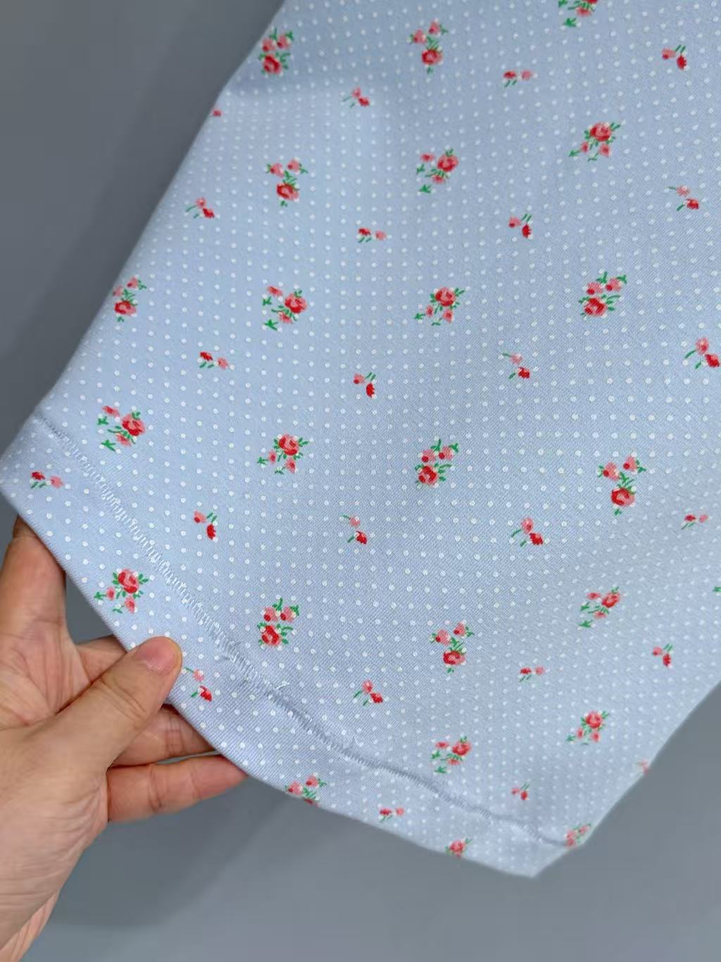 重工級碎花波點噴繪: 採用高精密數位印染技術,將藍底、白點與紅花還原得色彩飽和、過渡自然。印花色彩與布料纖維完美融合。
