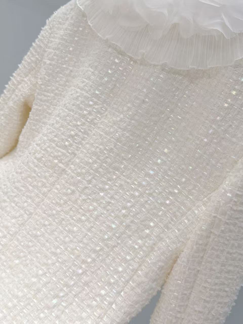 整體是仙女系名媛風,領口大面積的歐根紗褶皺花邊超級浪漫,把溫柔氛圍直接拉滿。