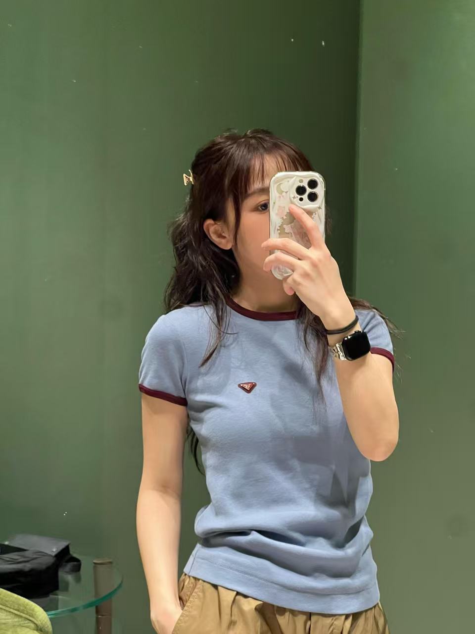 標誌性金屬倒三角徽標: 胸前的三角標採用了特供高品質五金,色澤瑩潤且鑲嵌精密。金屬質感與霧霾藍針織相互對襯,展現出藝術品等級的視覺層次。
