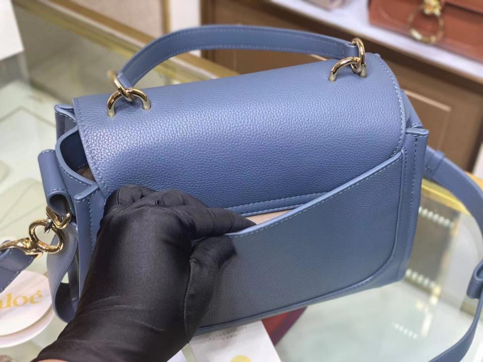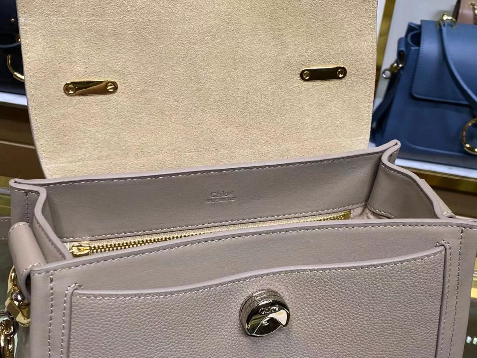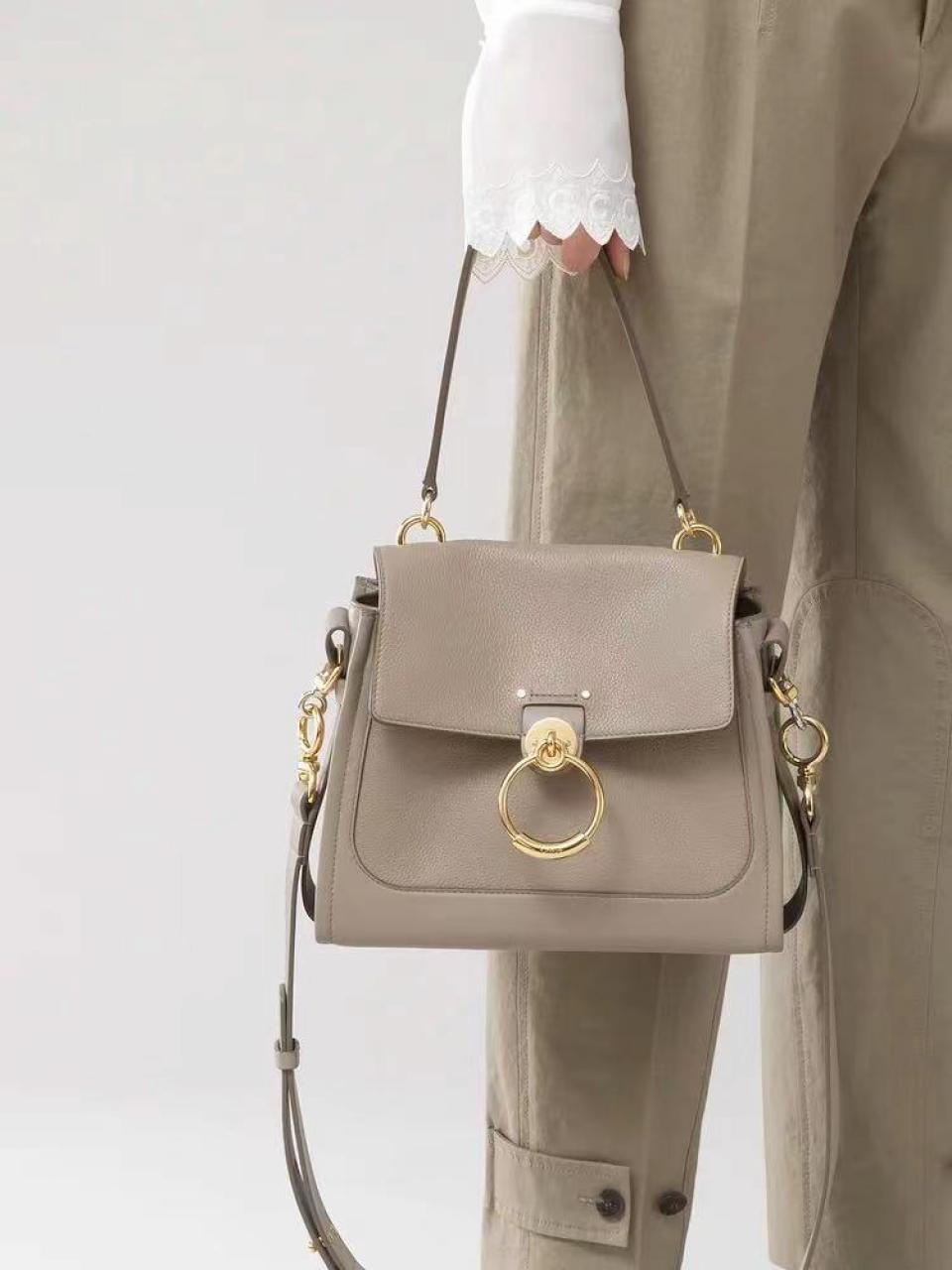 這款包採用光滑和柔軟顆粒小牛皮精製而成,和引人注目的正面環扣