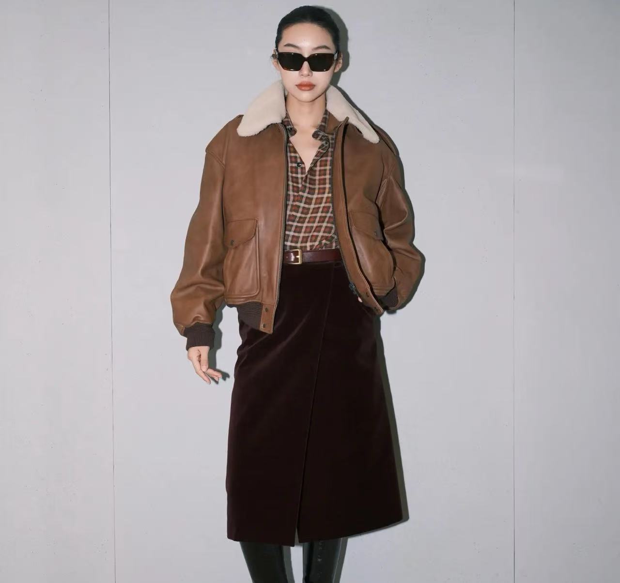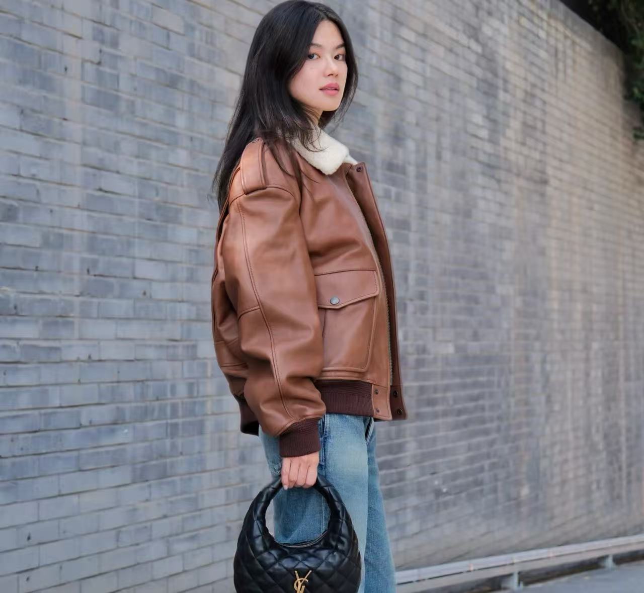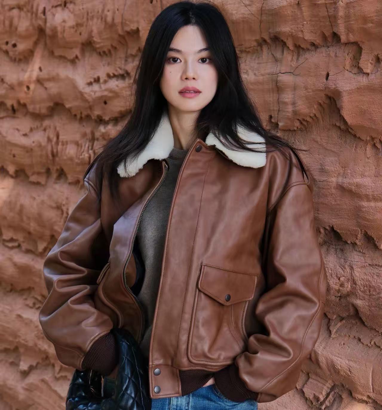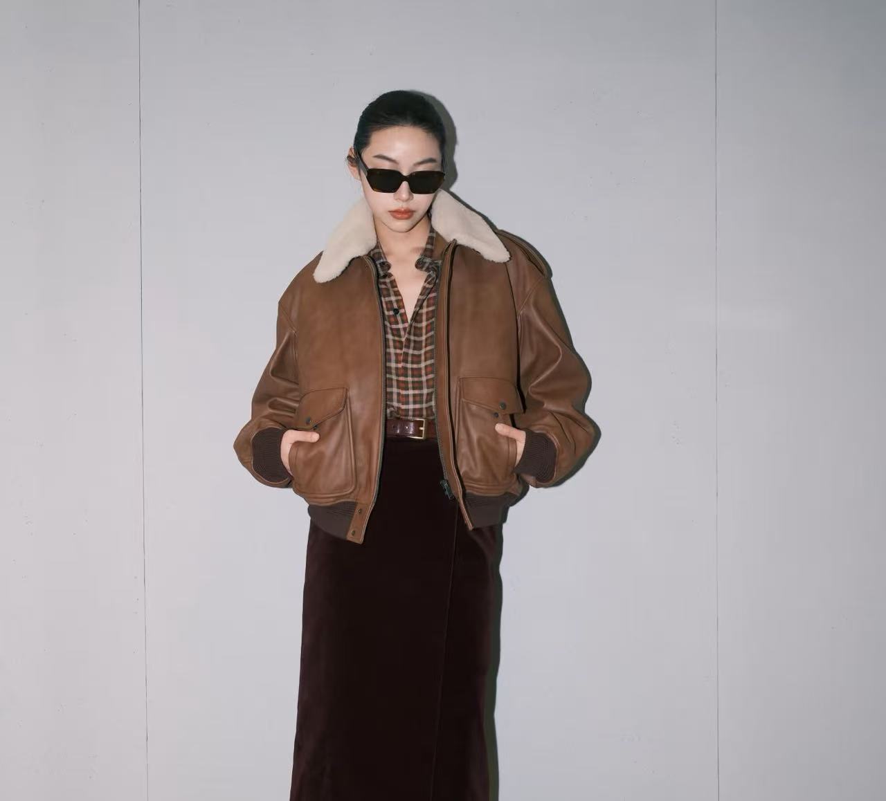 這件皮衣的版型實在是「賊正」,採用經典標誌性的飛行員夾克版型,整體挺括俐落,屬於寬鬆休閒款。一上身,那種高級的腔調感瞬間拉滿,讓妳走路自帶氣場,妥妥地變身時尚大女主!