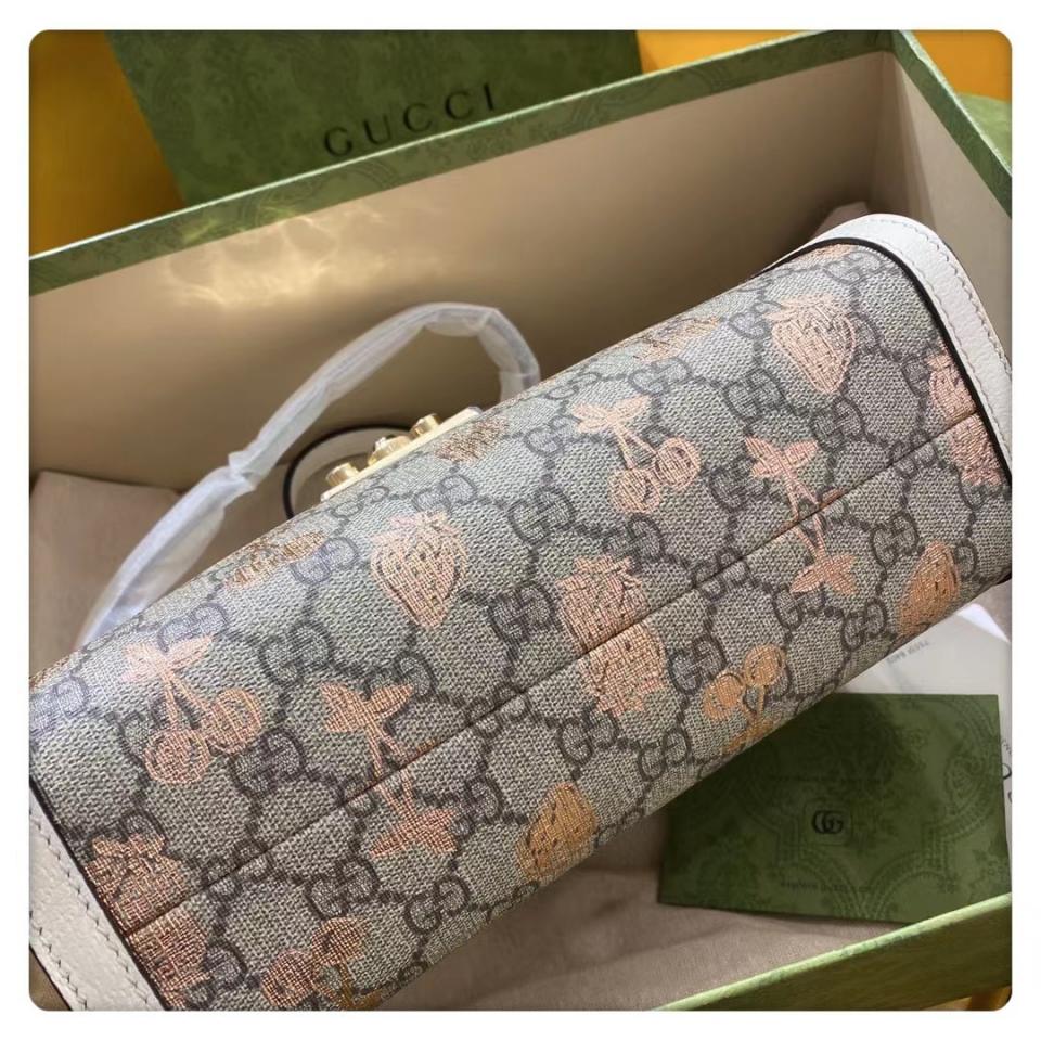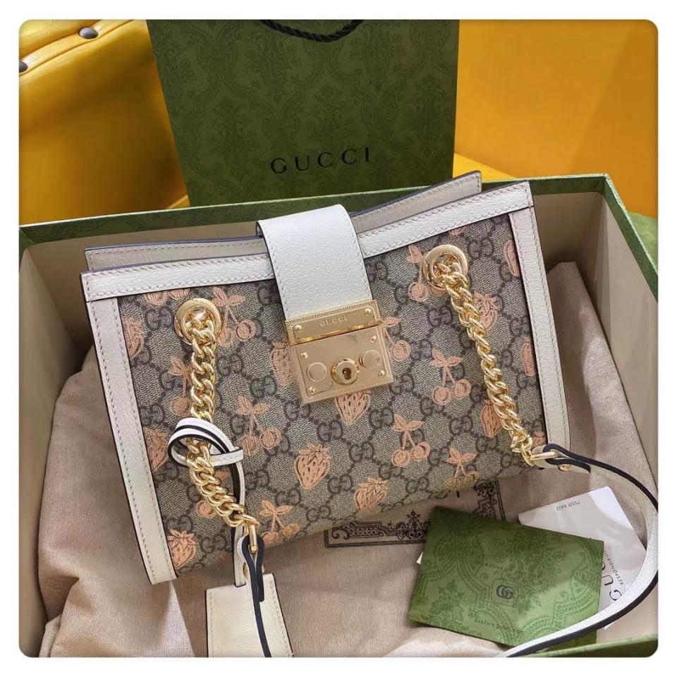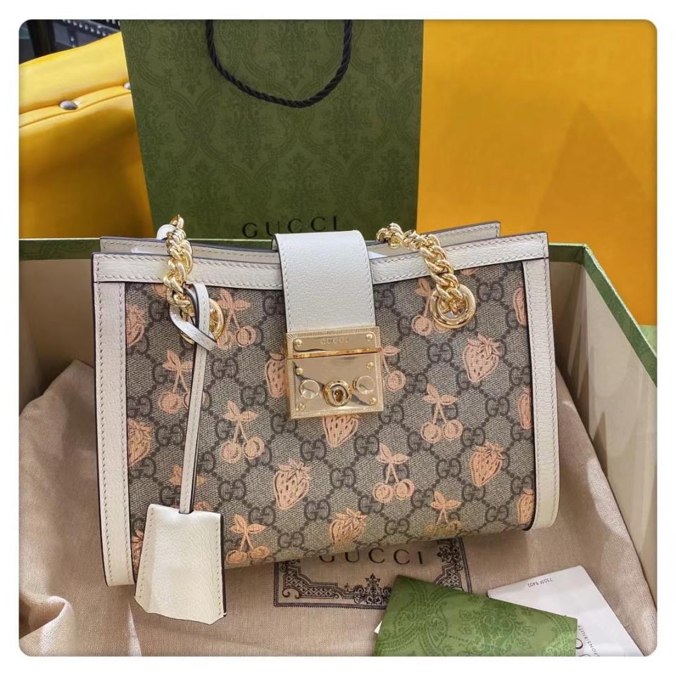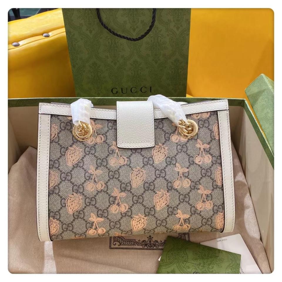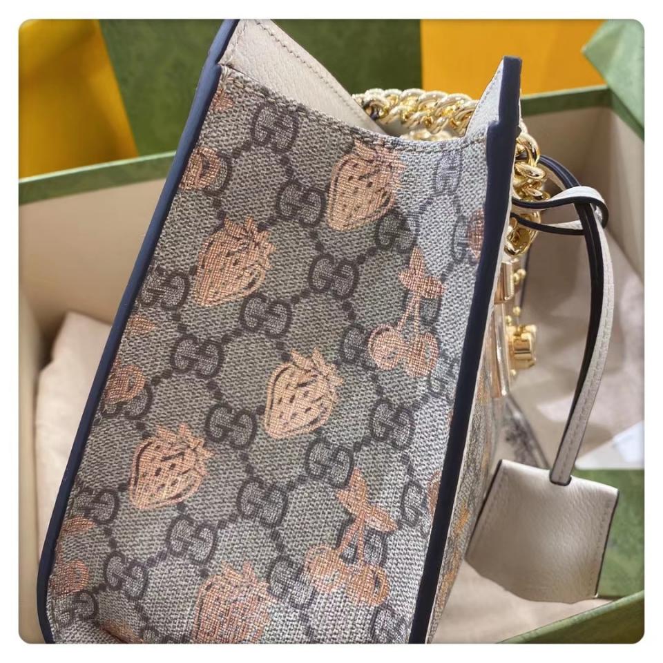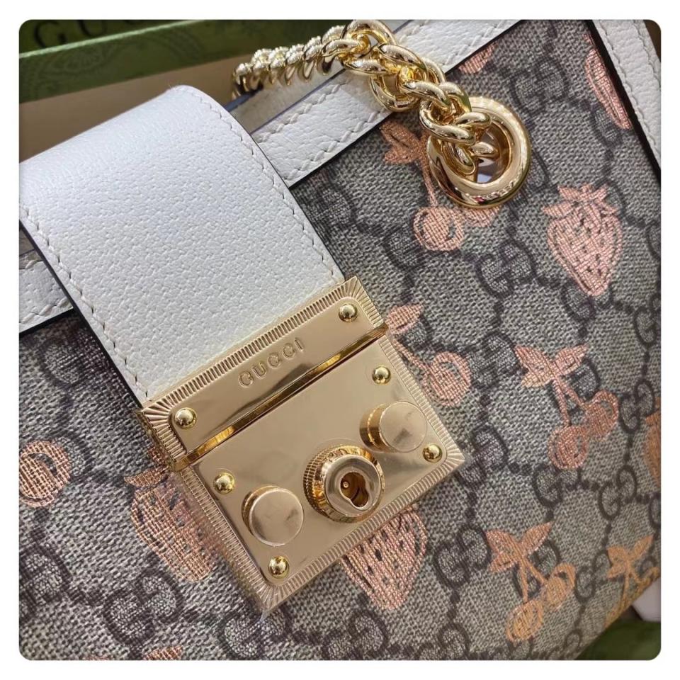 這款Padlock系列手袋從典藏單品中汲取靈感,融入諸多現代時尚細節,匯聚了品牌不同歷史篇章中的經典元素。手袋煥新演繹為托特包造型,飾以該系列標誌性的鑰匙和鎖扣配件。金屬風格的櫻桃和草莓印花圖案