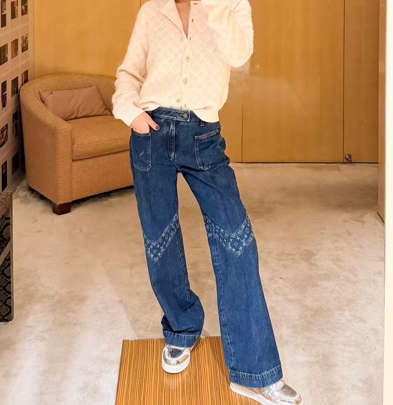 設計的核心在於膝蓋處大膽的 V 形線條拼接,結合品牌標誌性的 Monogram 老花圖騰,在視覺上創造出強烈的向內延伸感。