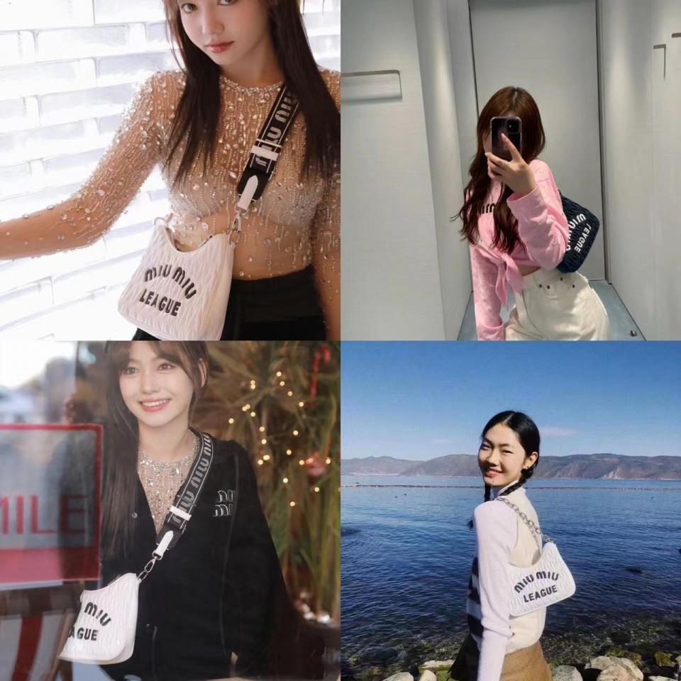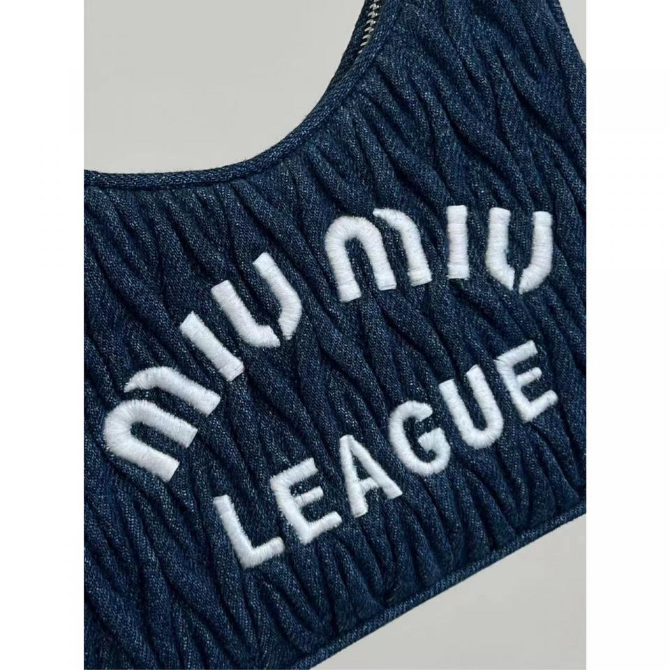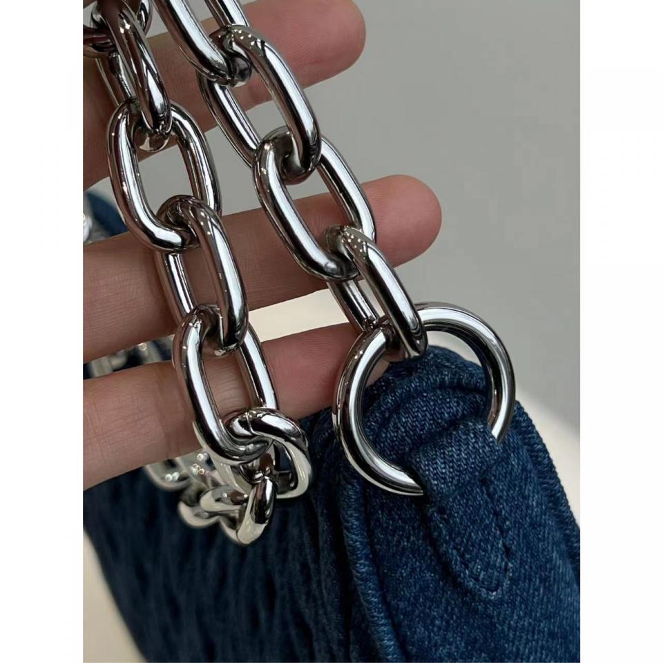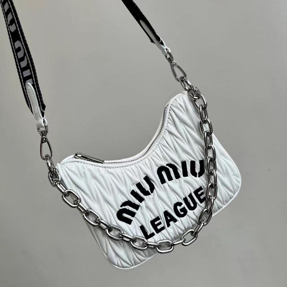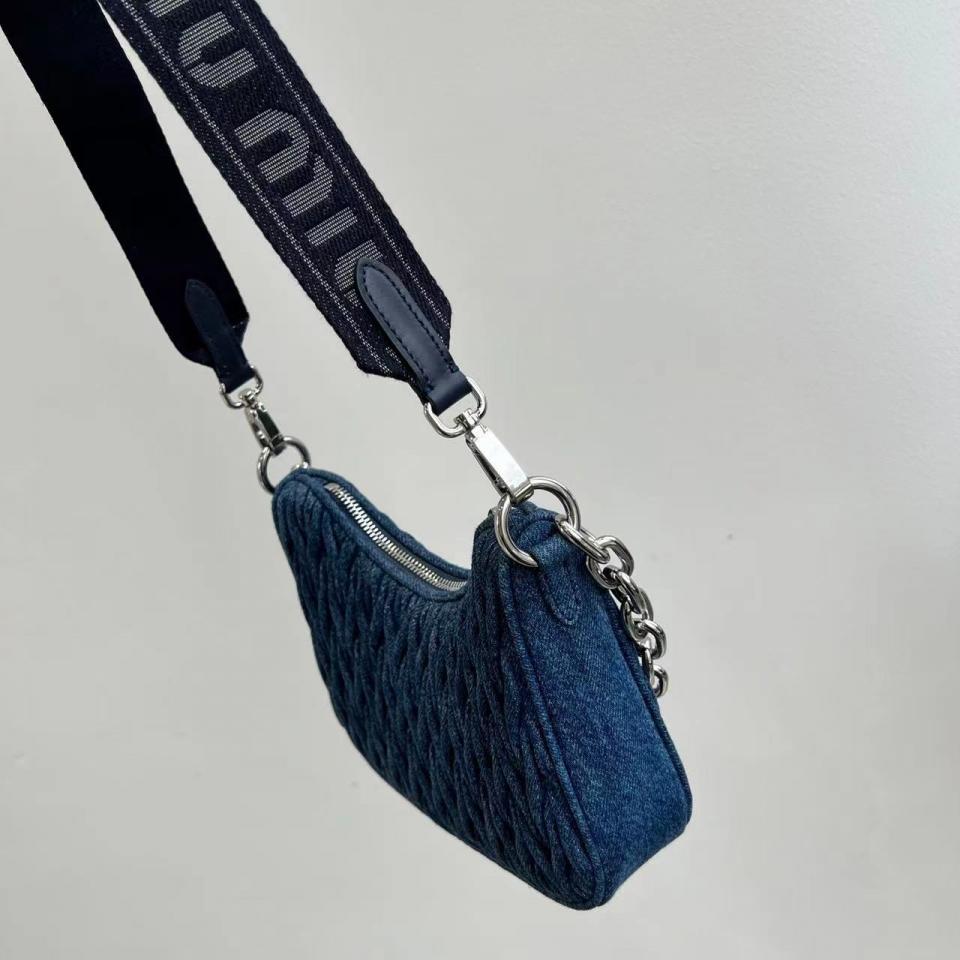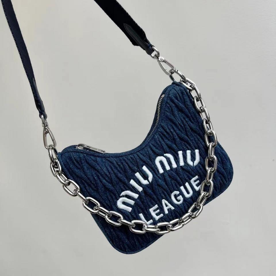 Miu家絎縫刺繡字母丹寧牛仔鏈條斜挎包