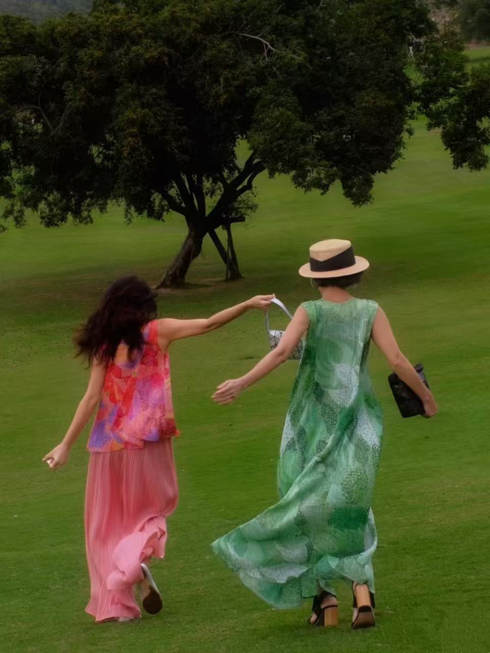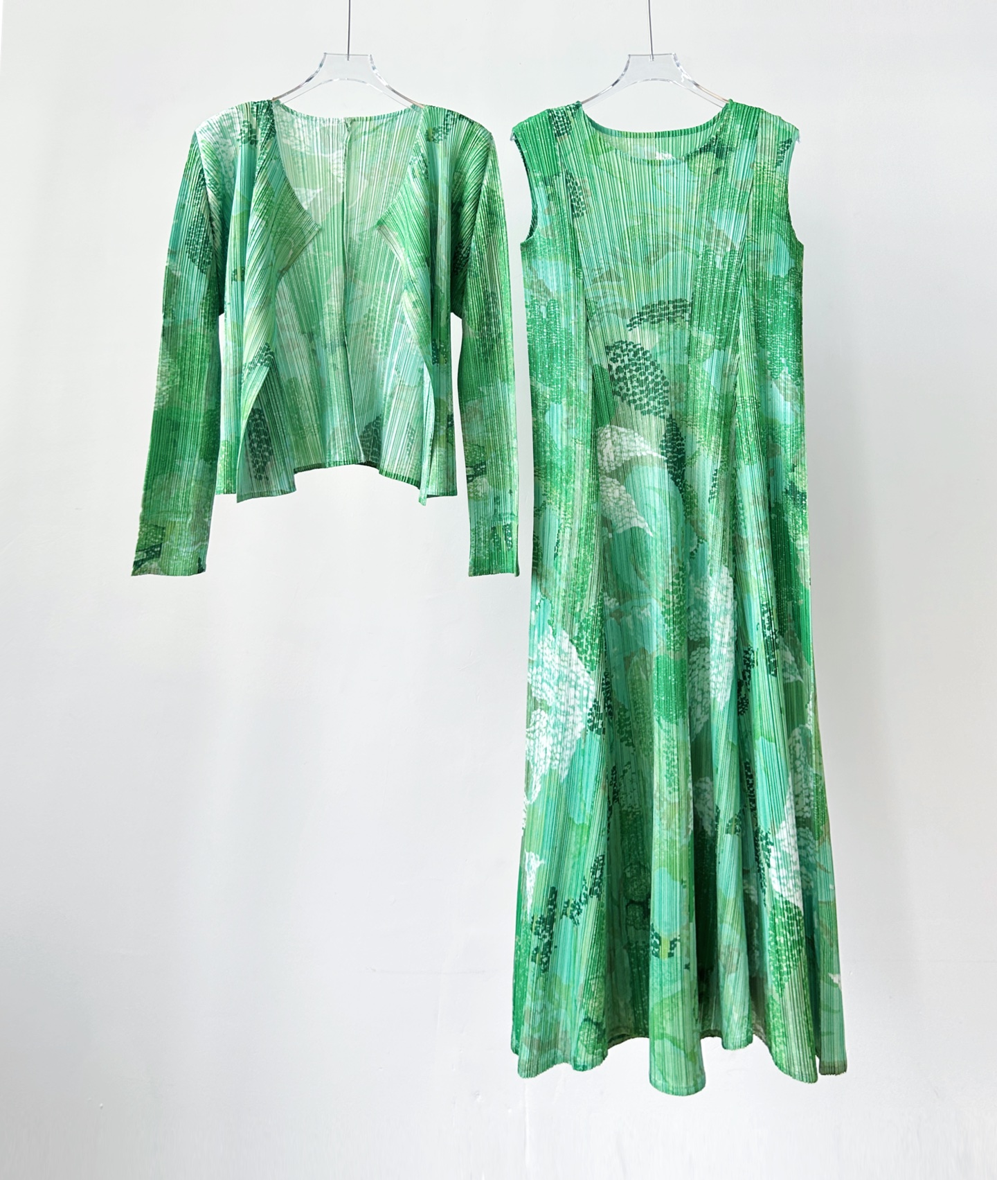 這套以柔和的粉色與綠色作為主調,透過花色的巧妙拼接,呈現出如森林晨霧般的夢幻層次,既清新又帶點藝術氣息,穿上瞬間自帶氛圍感。