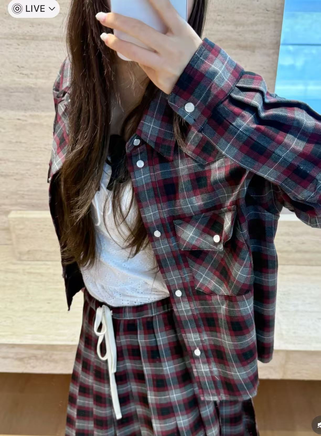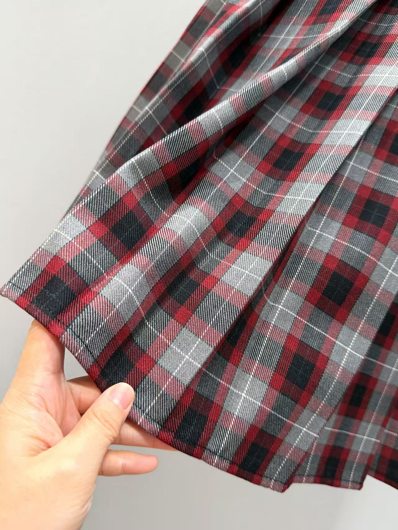 紅灰黑交織格紋復古吸睛,剪裁利落顯高。百褶半裙採羊毛材質,鬆緊腰頭配白色抽繩,舒適又帶造型感;裙長精準修飾腿線,甜酷學院風一次搞定,復古時尚完美平衡。