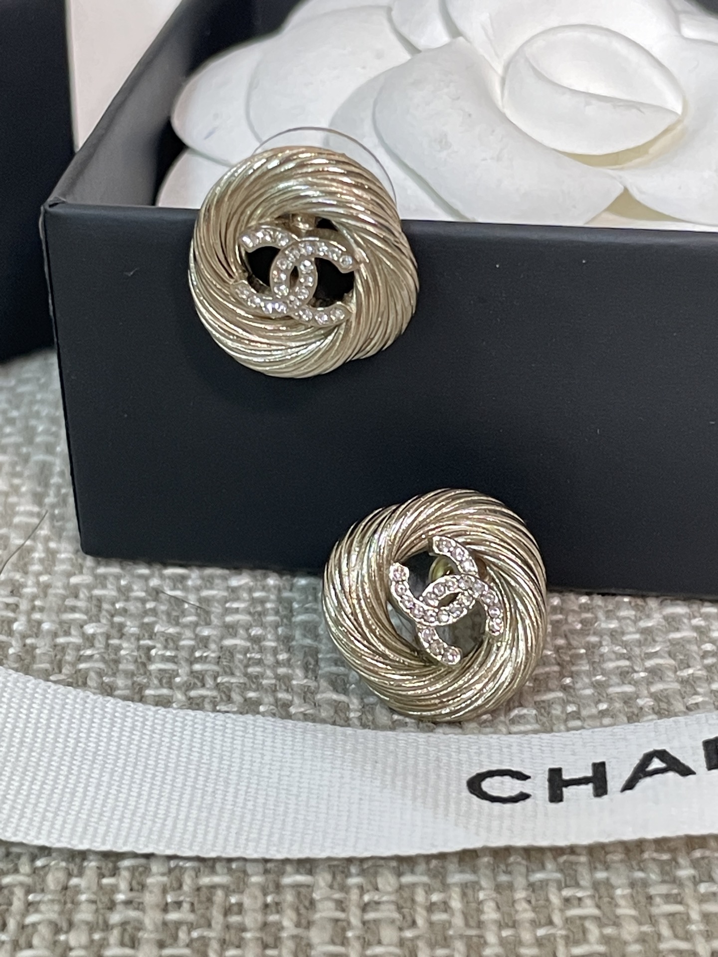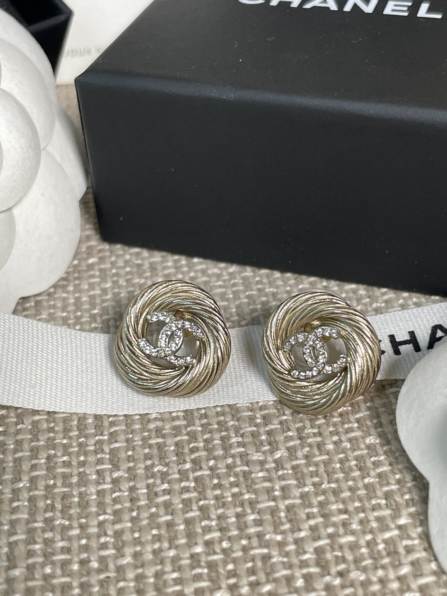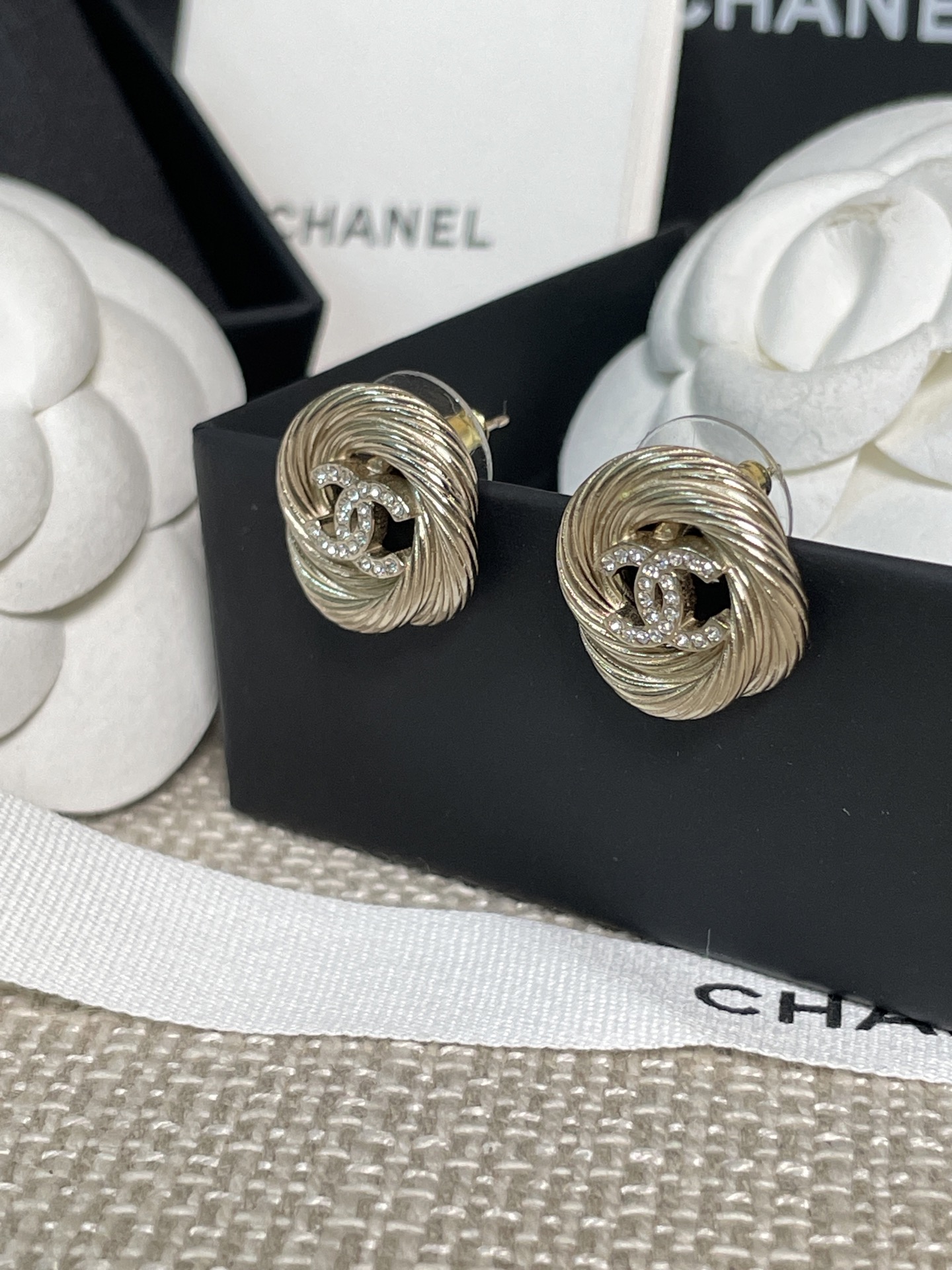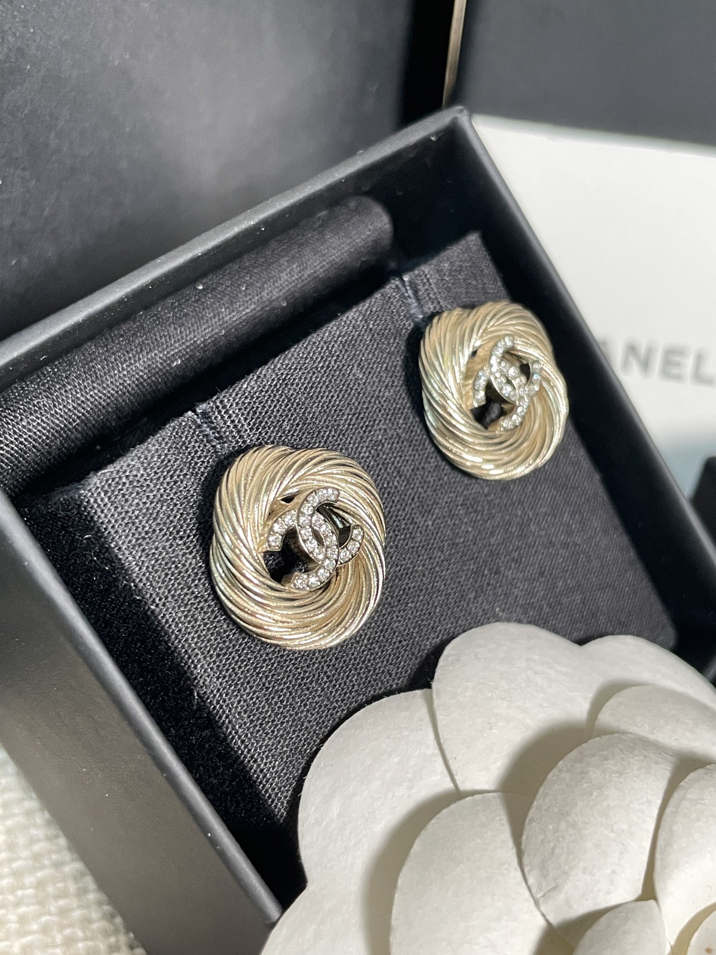 這款麻花圈C耳釘真的美得讓人移不開眼!採用低調的淺金色調搭配經典雙C設計,再以細緻的施華洛水晶鑽點綴,整體質感既溫婉又高級。