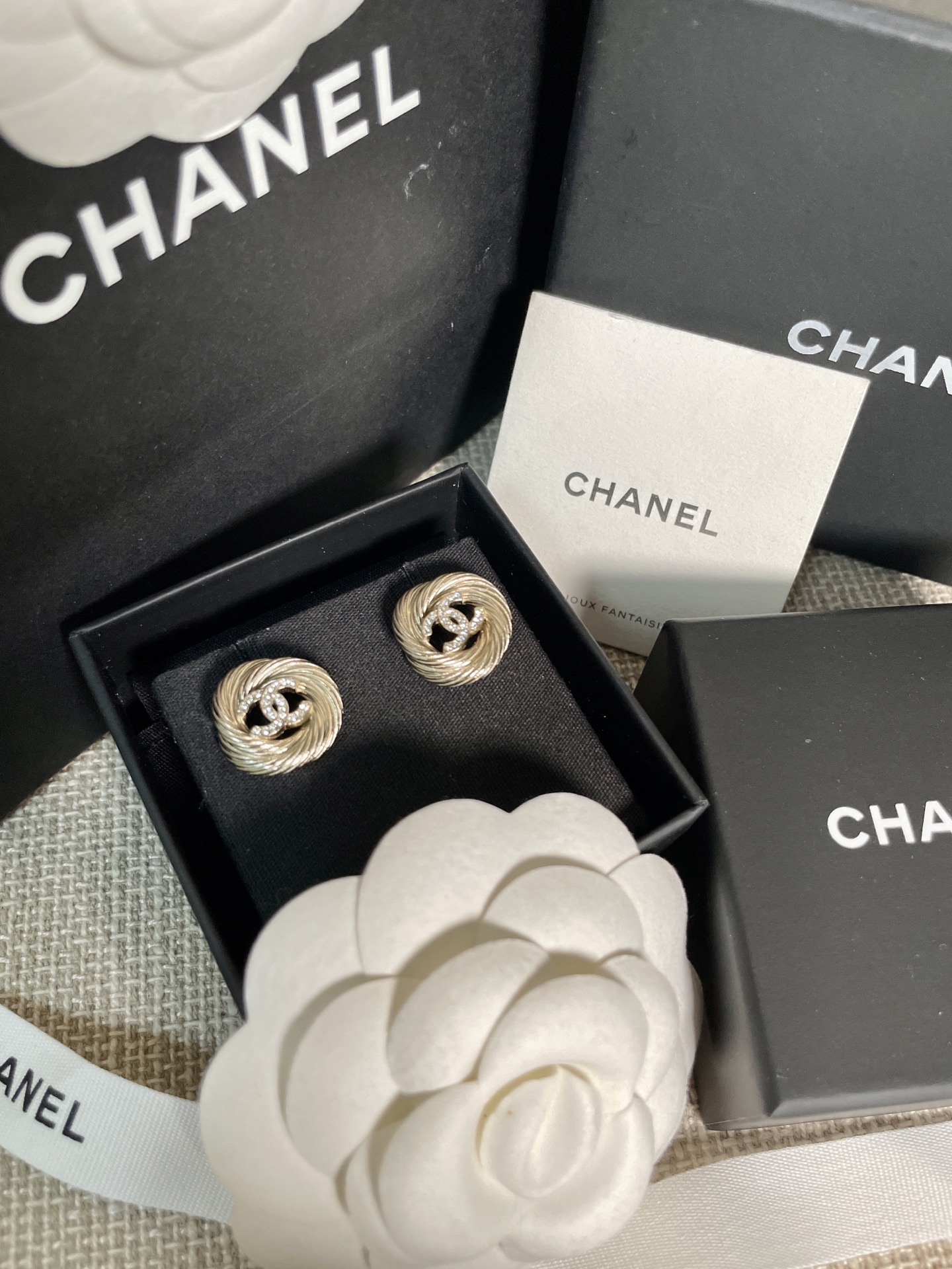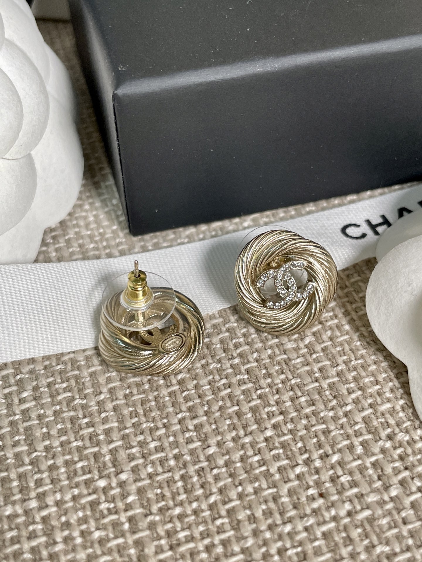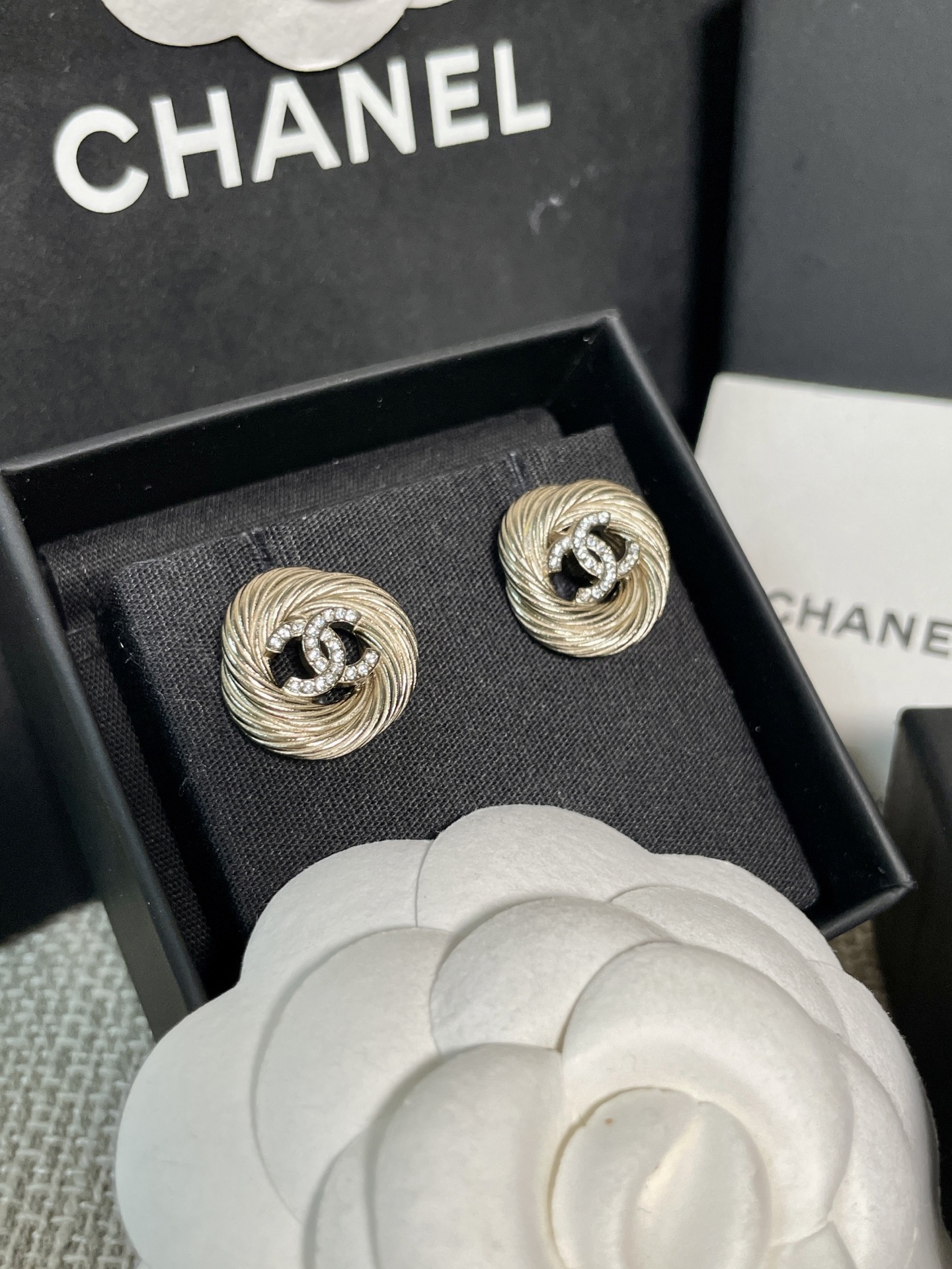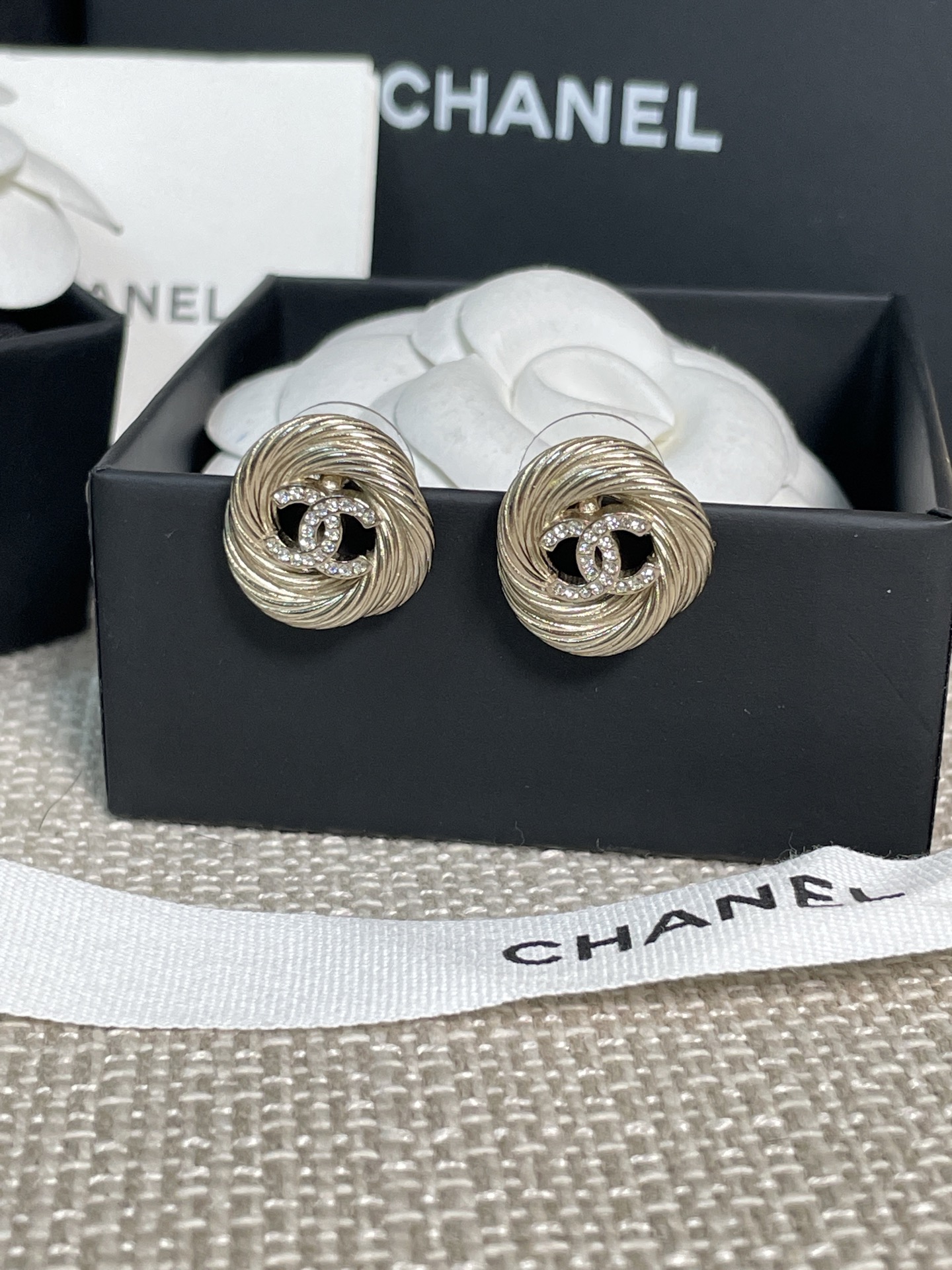 這款麻花圈C耳釘真的美得讓人移不開眼!採用低調的淺金色調搭配經典雙C設計,再以細緻的施華洛水晶鑽點綴,整體質感既溫婉又高級。