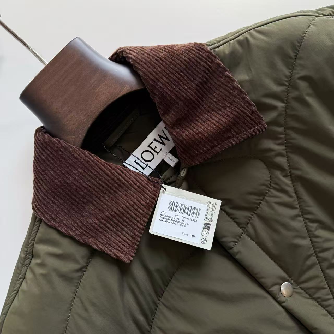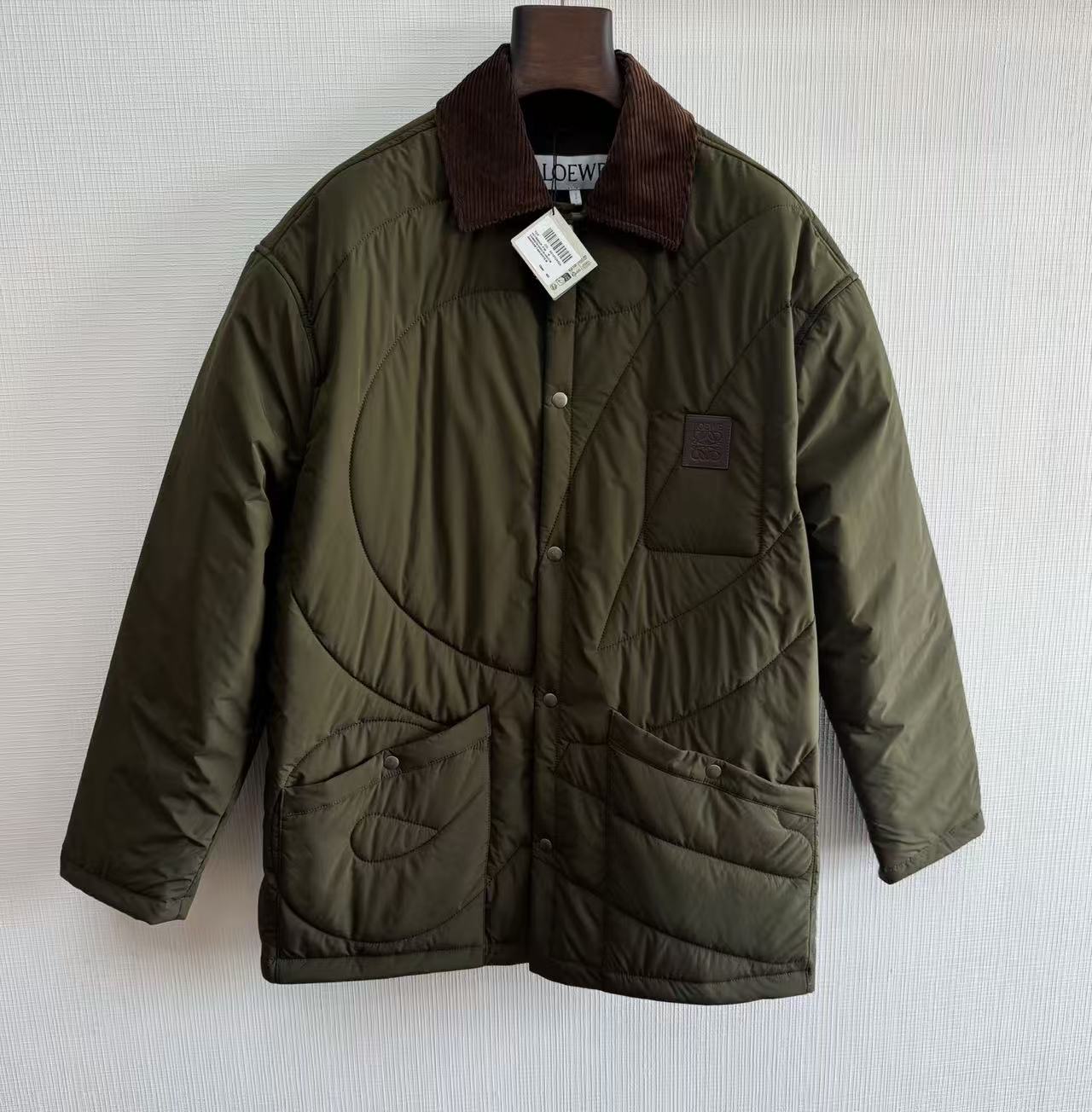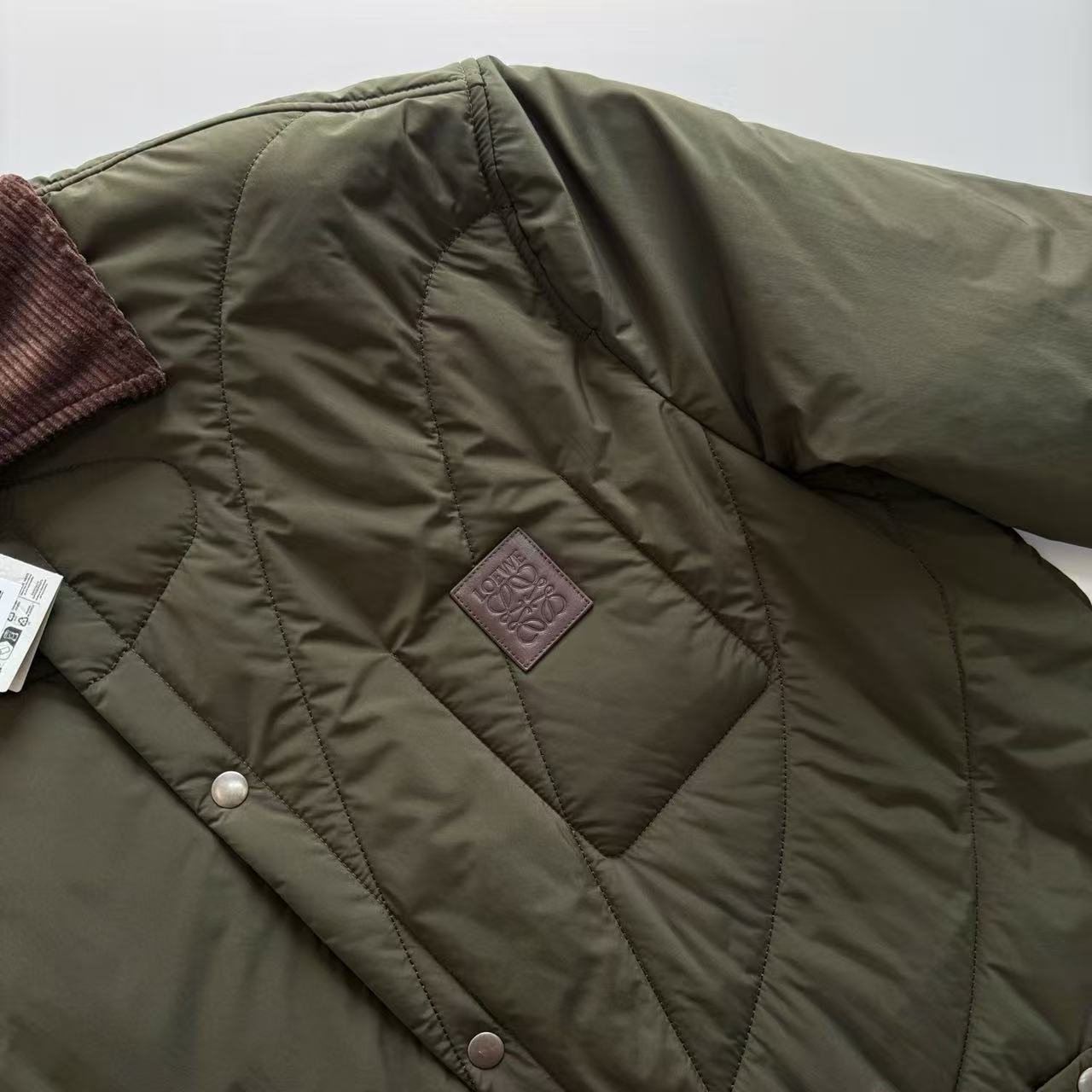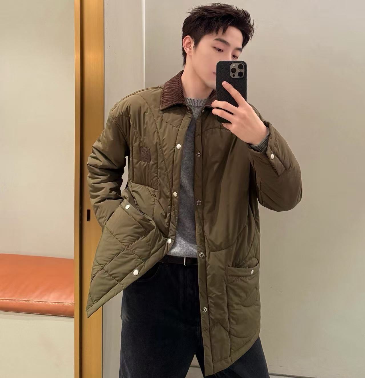 最瘋狂的當然是那「绗縫品牌圖騰」+「燈芯絨壓紋絨領」!绗縫不是隨便縫幾條線,而是每一針都精準對位組成標誌性幾何,摸起來平整卻超級立體;領子更加分,用燈芯絨效果壓紋革做成,翻起來暖到脖子、立領秒變貴婦!全件按扣設計(前襟、袖口、側衩全部按扣),一扣一解超療癒,胸前還有壓紋皮革三角貼片,低調閃到不行~