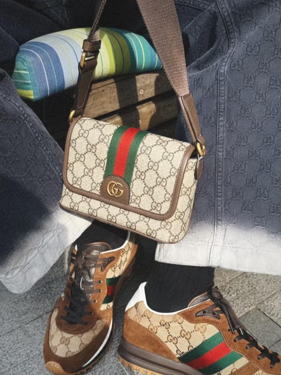 標誌性的 雙 G 與織帶細節,讓包包更添辨識度,不論是休閒穿搭還是正式場合,都能自然融入其中。