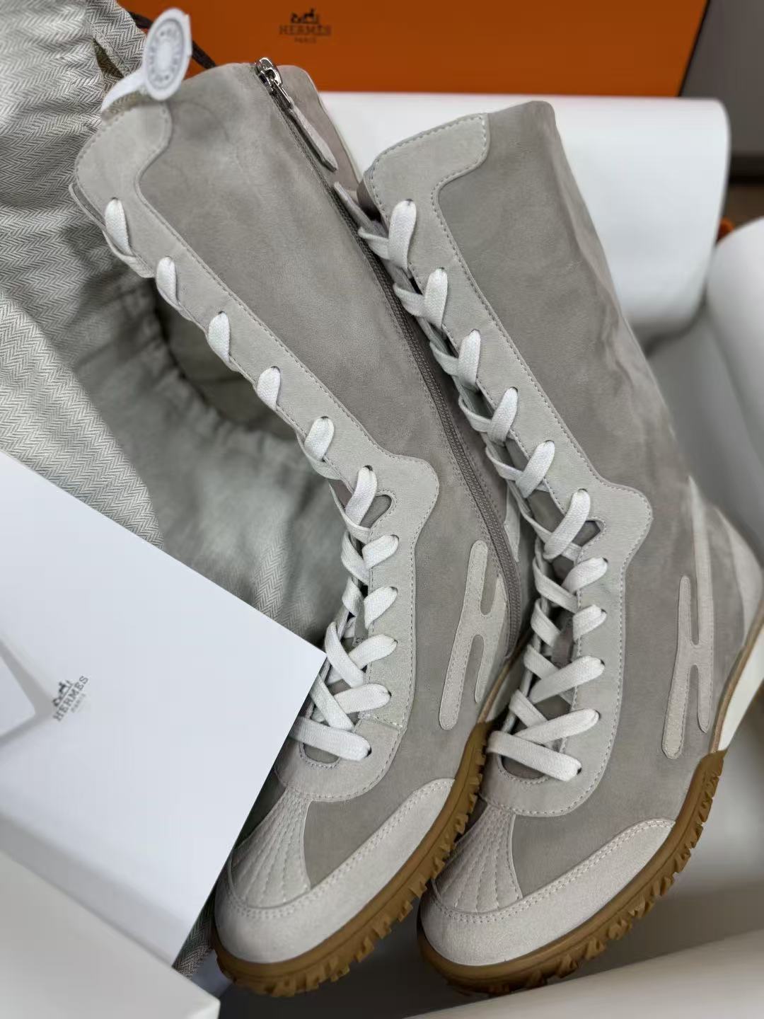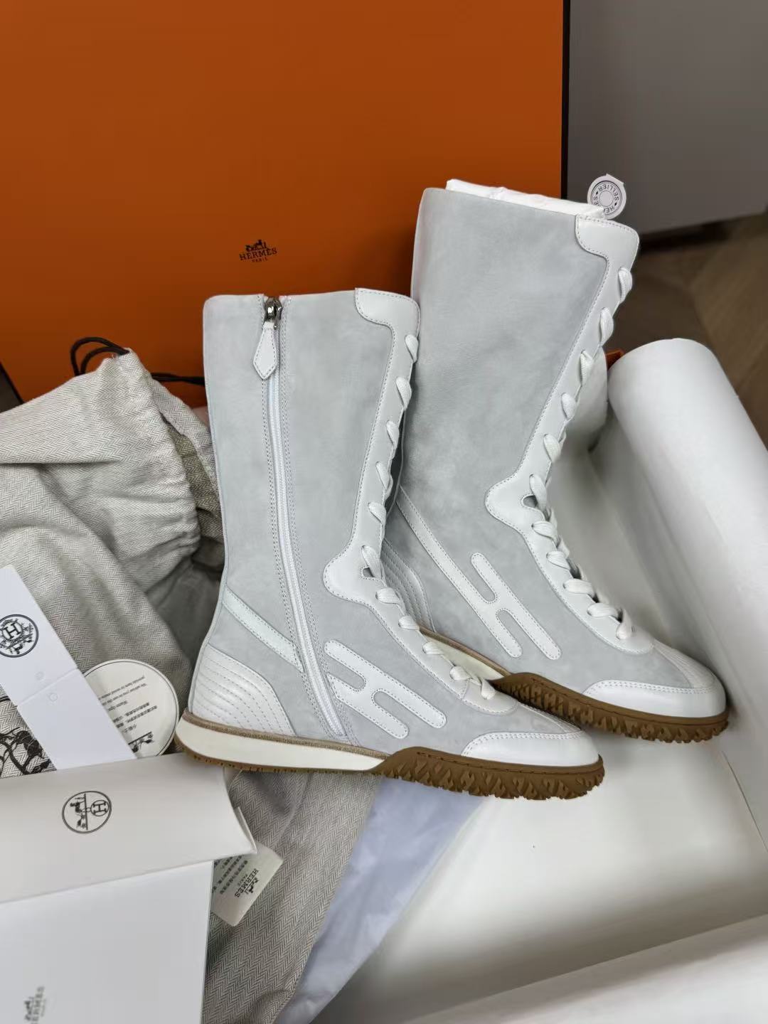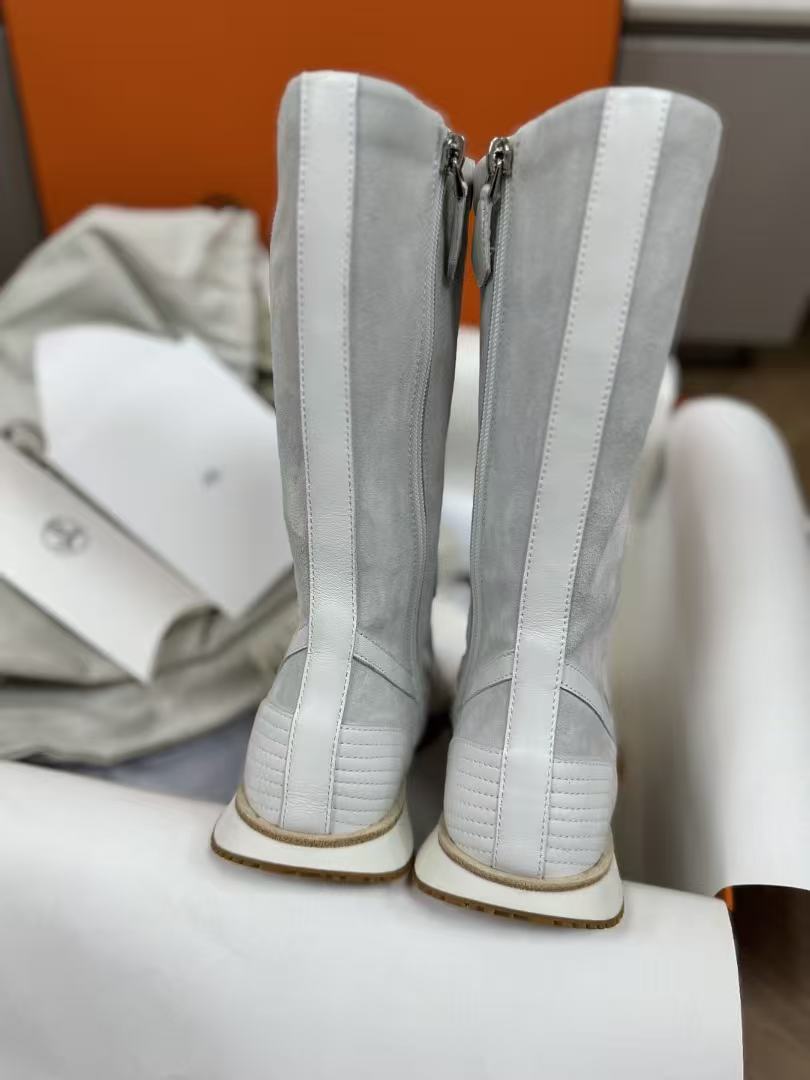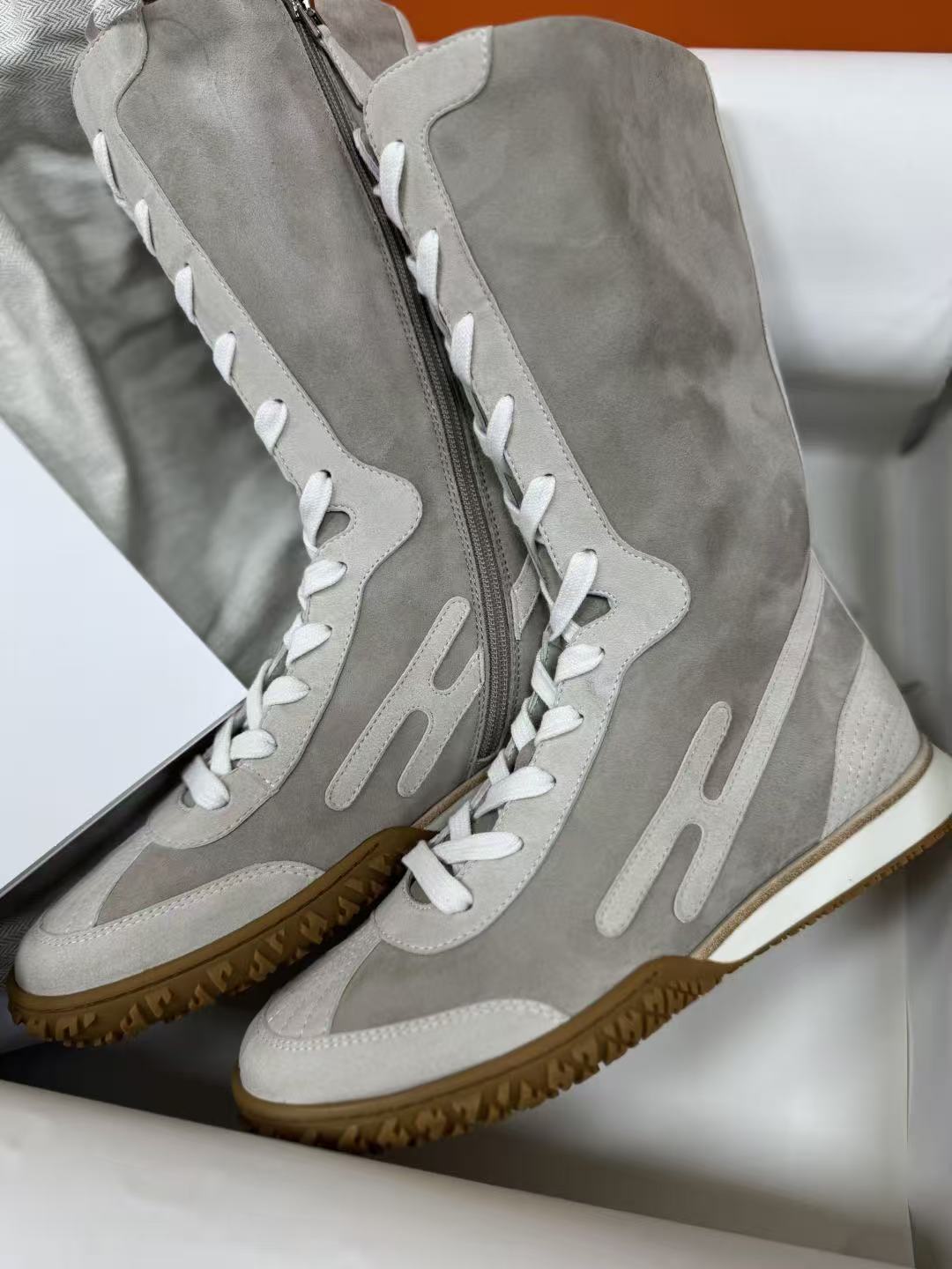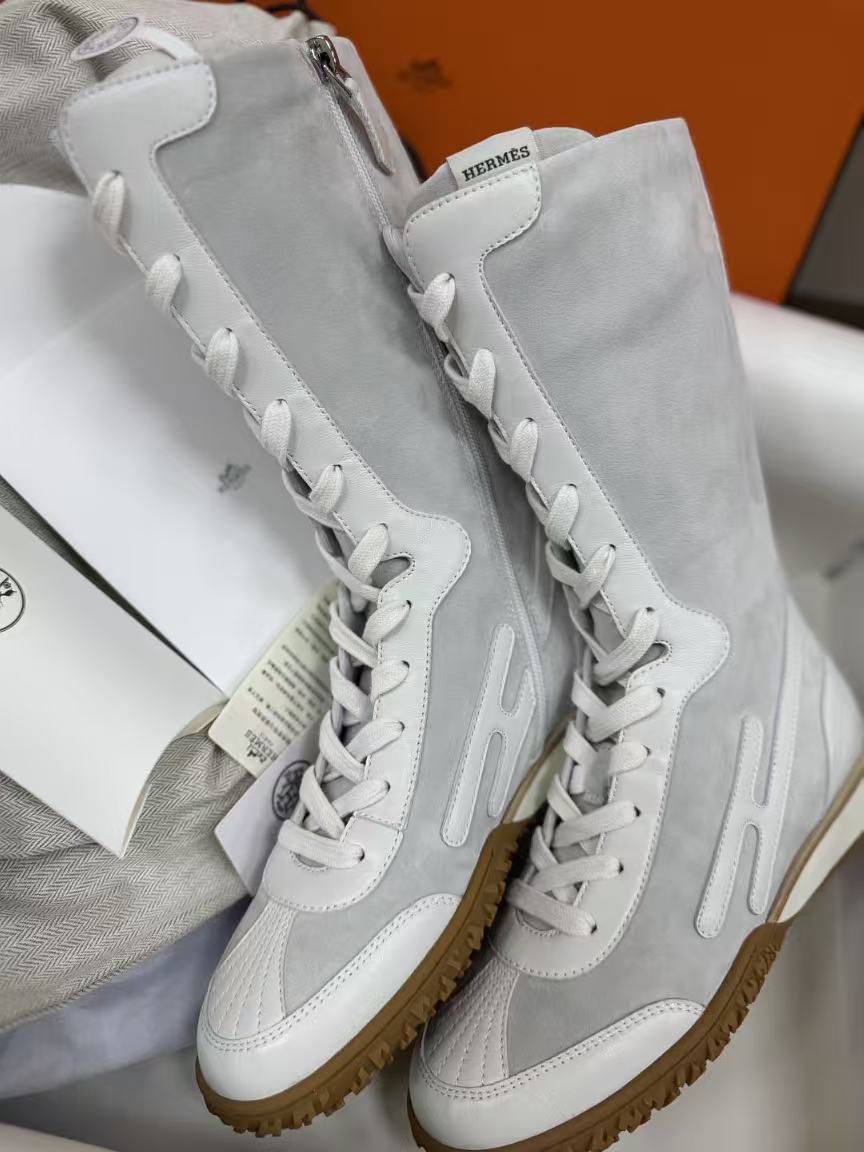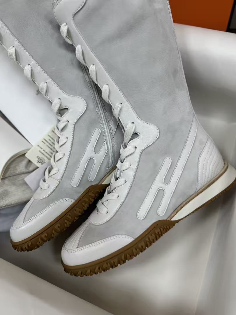 麂皮小牛皮與Nappa皮革高幫設計,撞色圖案+H字細節低調閃耀,前衛復古風直接拉滿!快來一起看看這雙靴子的致命魅力吧!