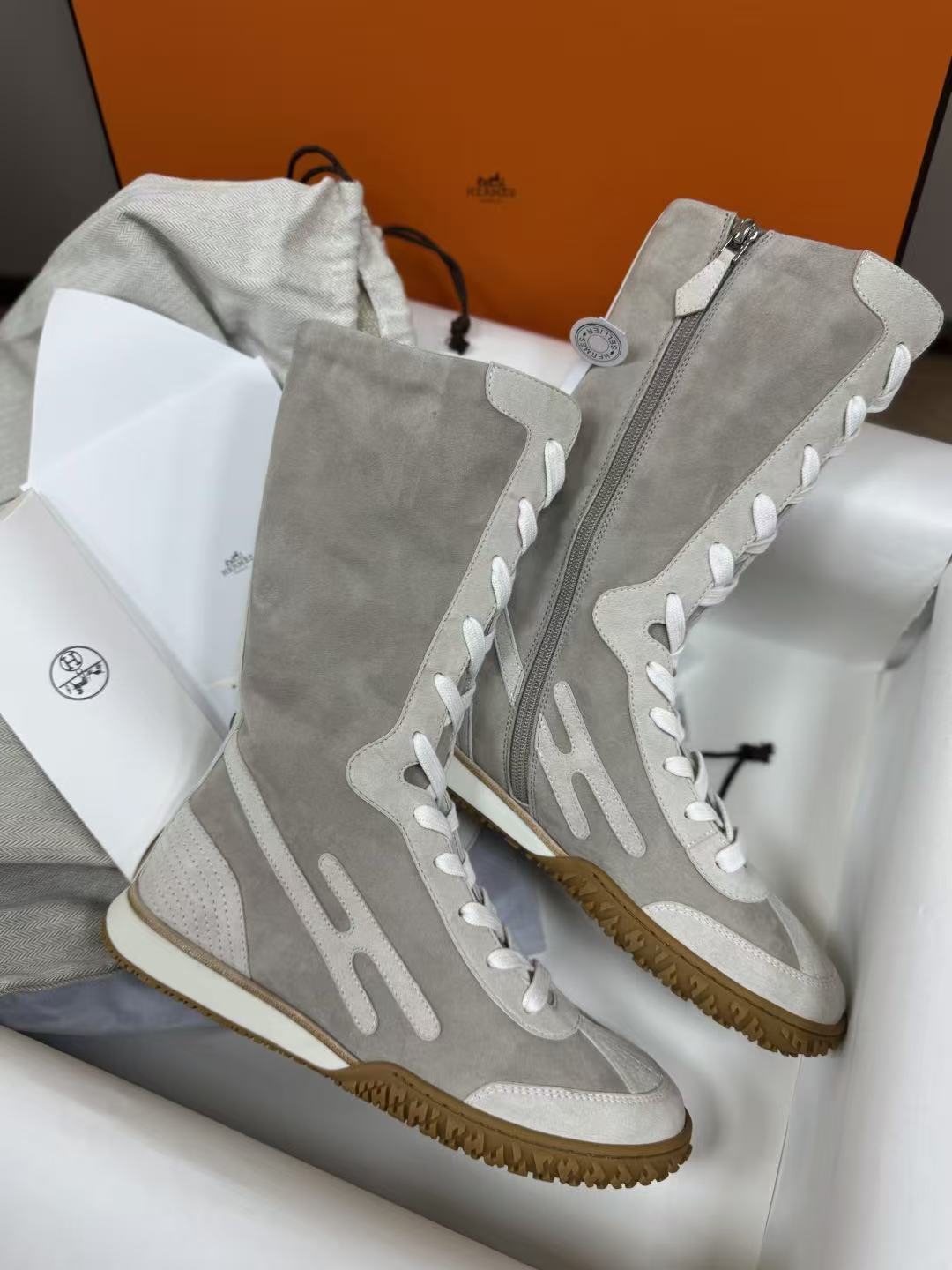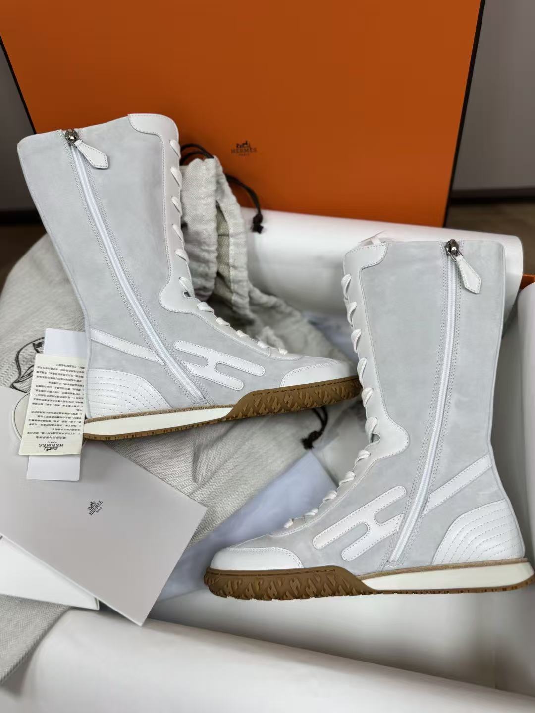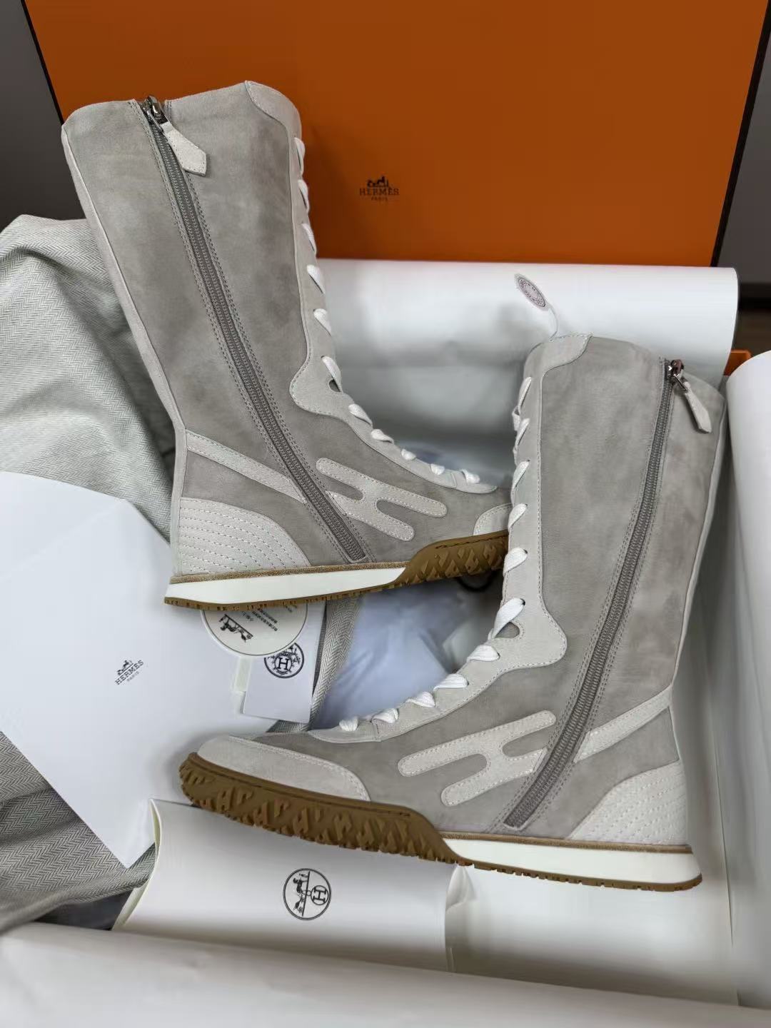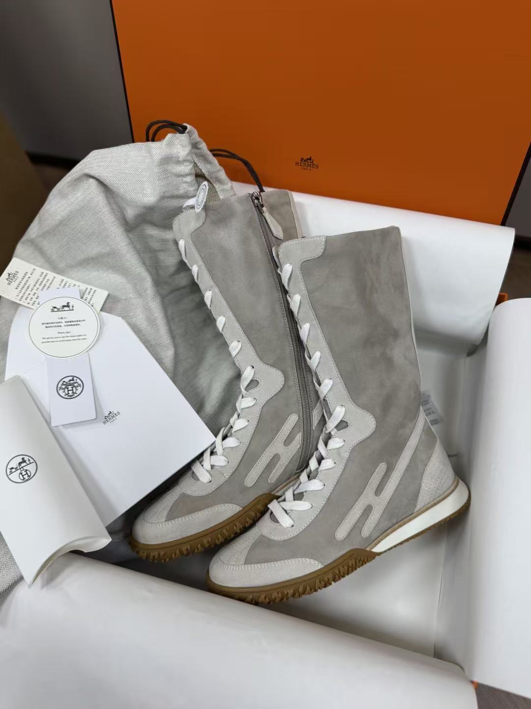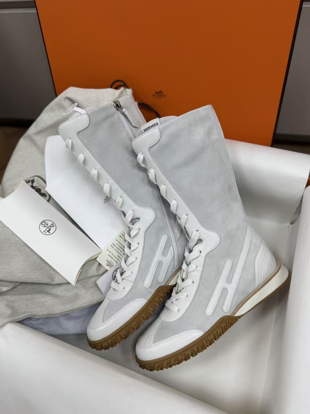 麂皮小牛皮與Nappa皮革高幫設計,撞色圖案+H字細節低調閃耀,前衛復古風直接拉滿!快來一起看看這雙靴子的致命魅力吧!