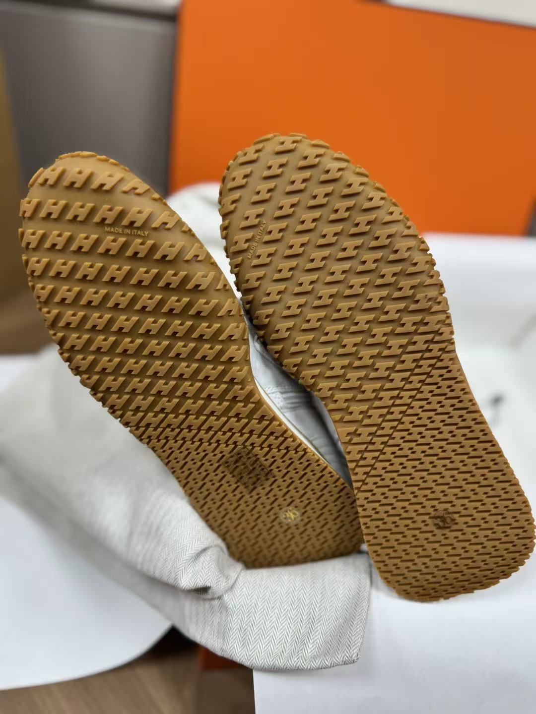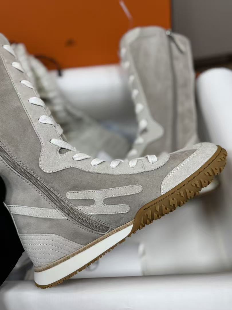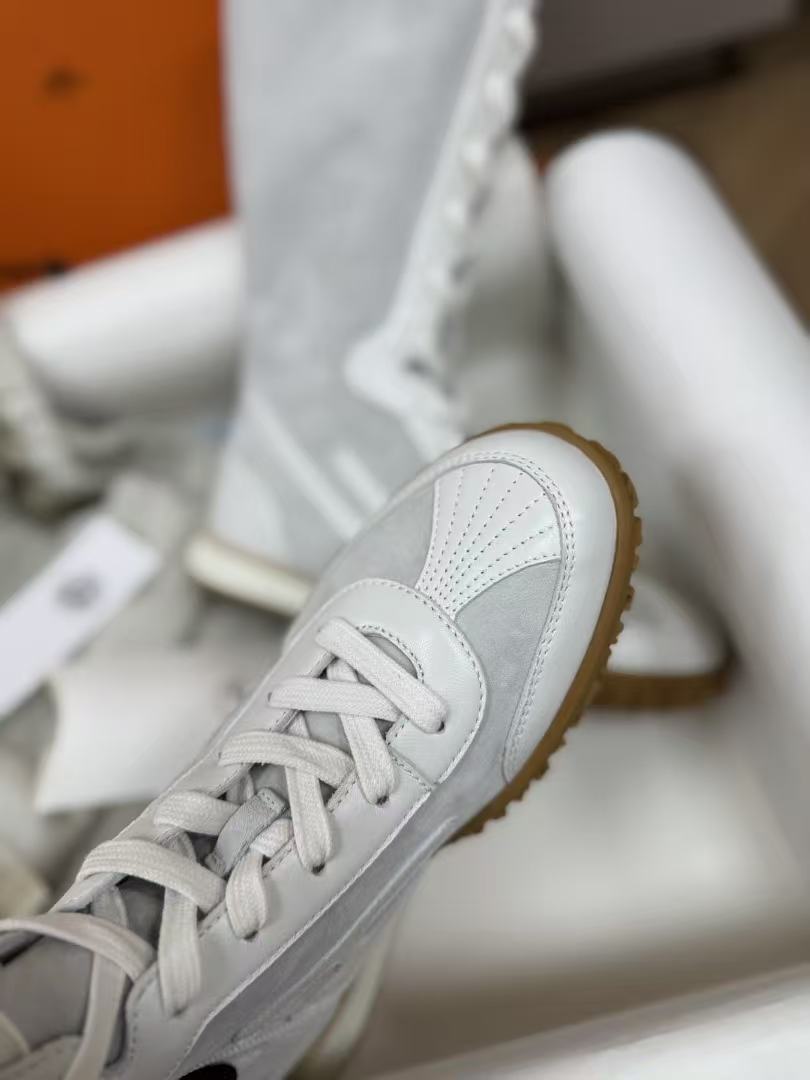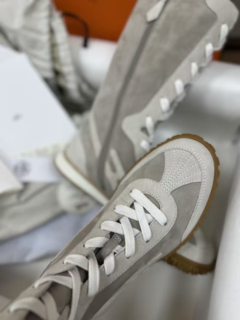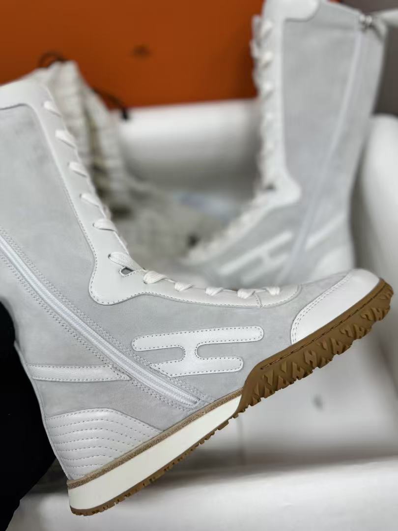 這款拳擊靴以高幫綁帶設計為核心,版型俐落挺括,鞋頭圓潤卻不失力量感,撞色圖案與標誌性H字細節點綴鞋身,品牌辨識度爆表!附贈第二副鞋帶,隨心切換風格,從街頭到輕奢一鍵搞定。蜂蜜色橡膠鞋底+白色橡膠中底層次豐富,踩地穩健又顯高,穿上瞬間拉長腿部比例。無論是搭配運動褲還是半裙,都能輕鬆駕馭前衛復古的多元造型!