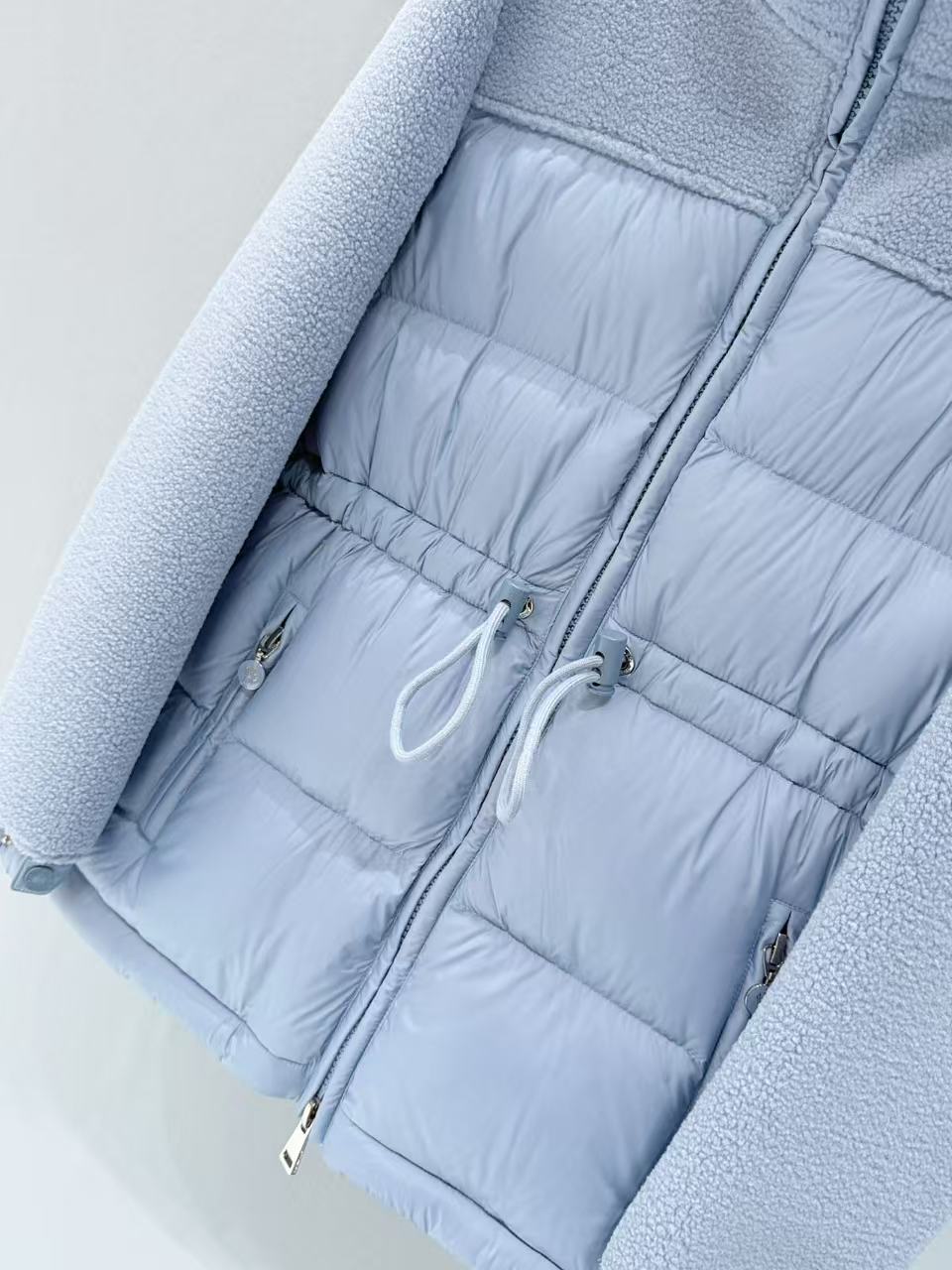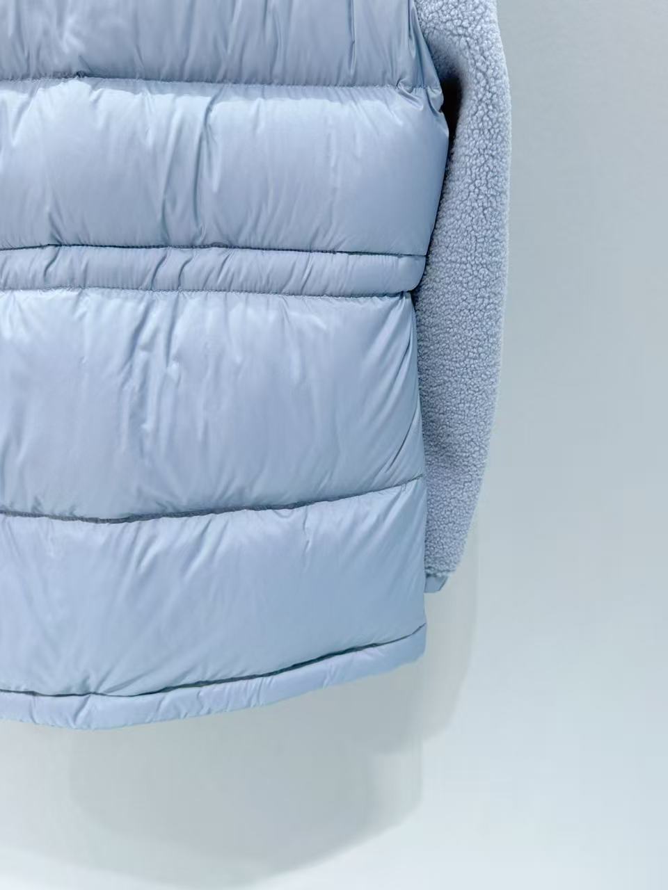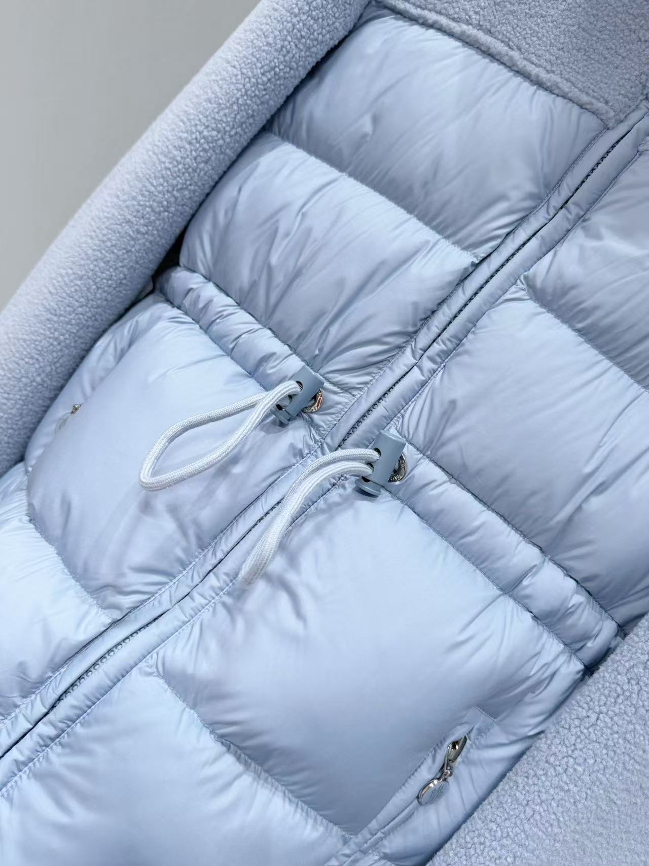 填充90%白鵝絨,每一格都飽滿勻稱,輕盈不厚重卻保暖力滿分,手感超軟糯,羊羔毛拼接部分觸感細膩親膚,穿起來舒適度超好,一件輕鬆過冬不怕冷。