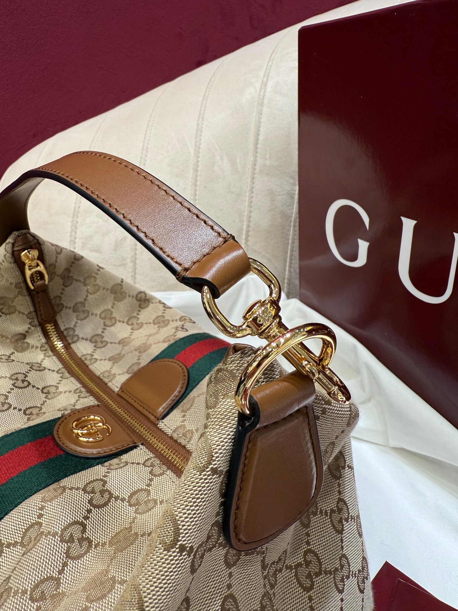 經典米色與棕色 GG 帆布搭配棕色皮革滾邊,整體視覺溫潤耐看,完全不挑季節、不挑穿搭。