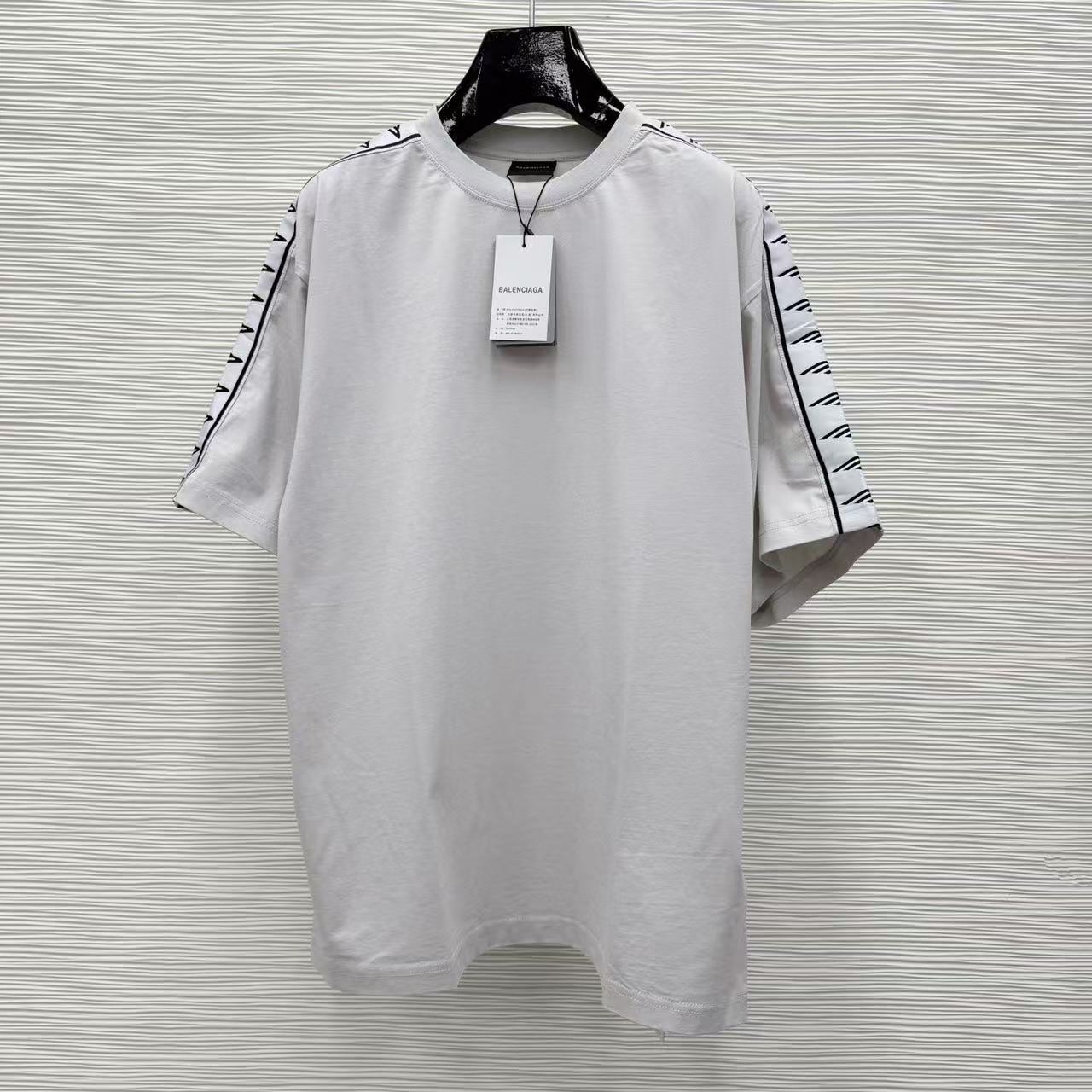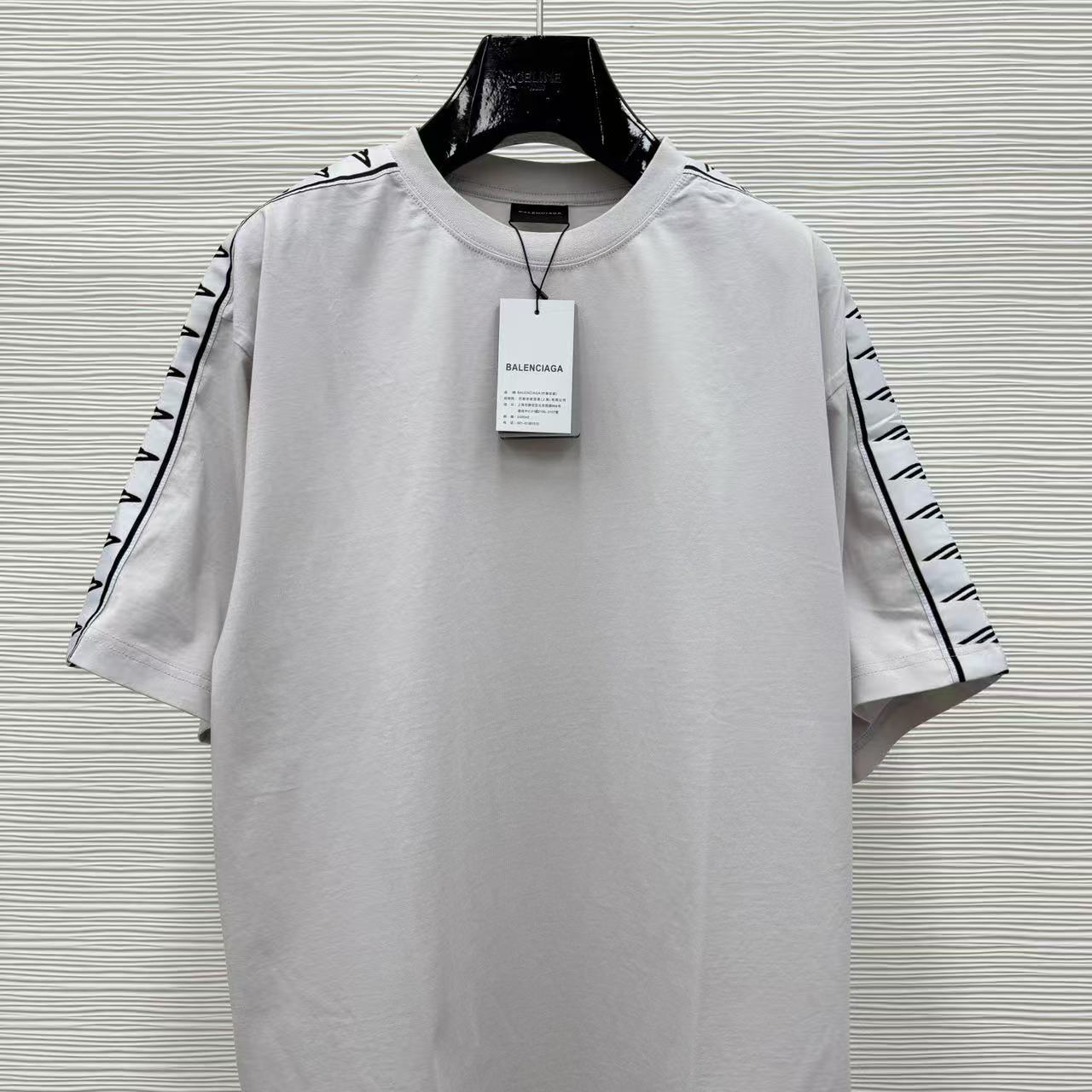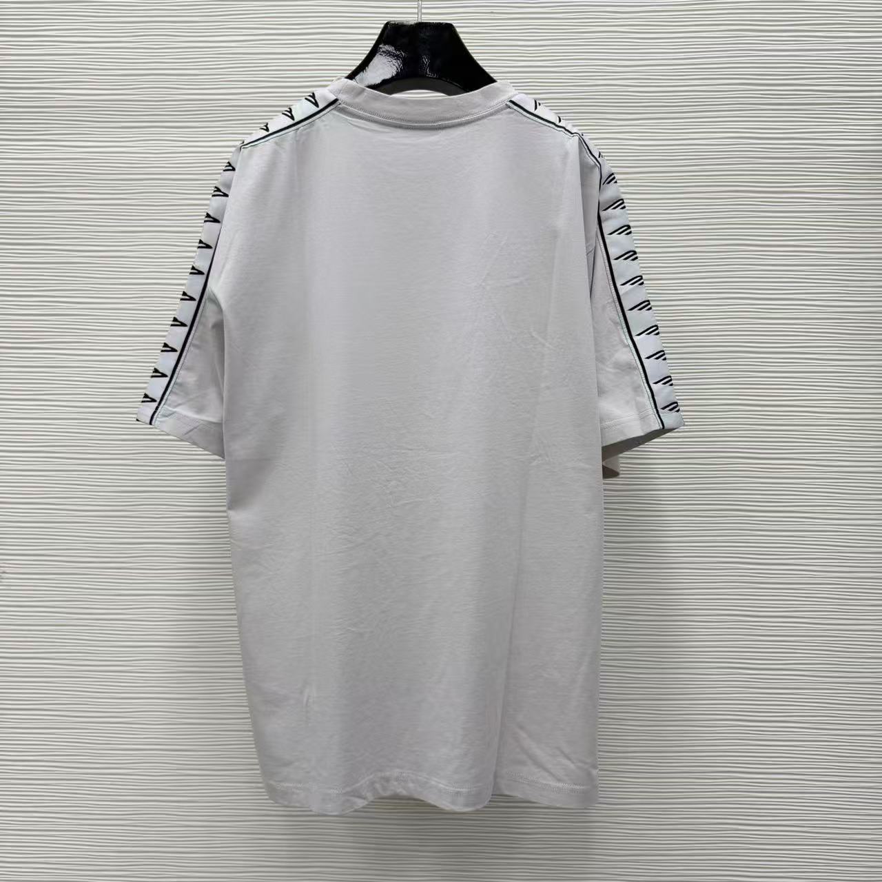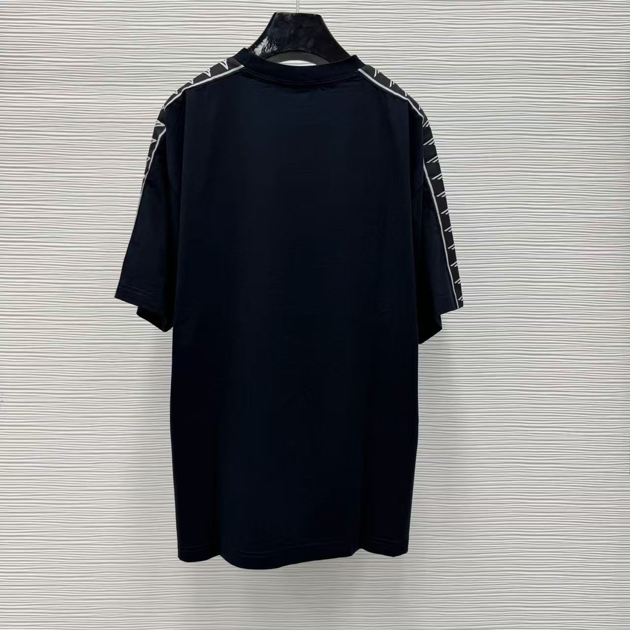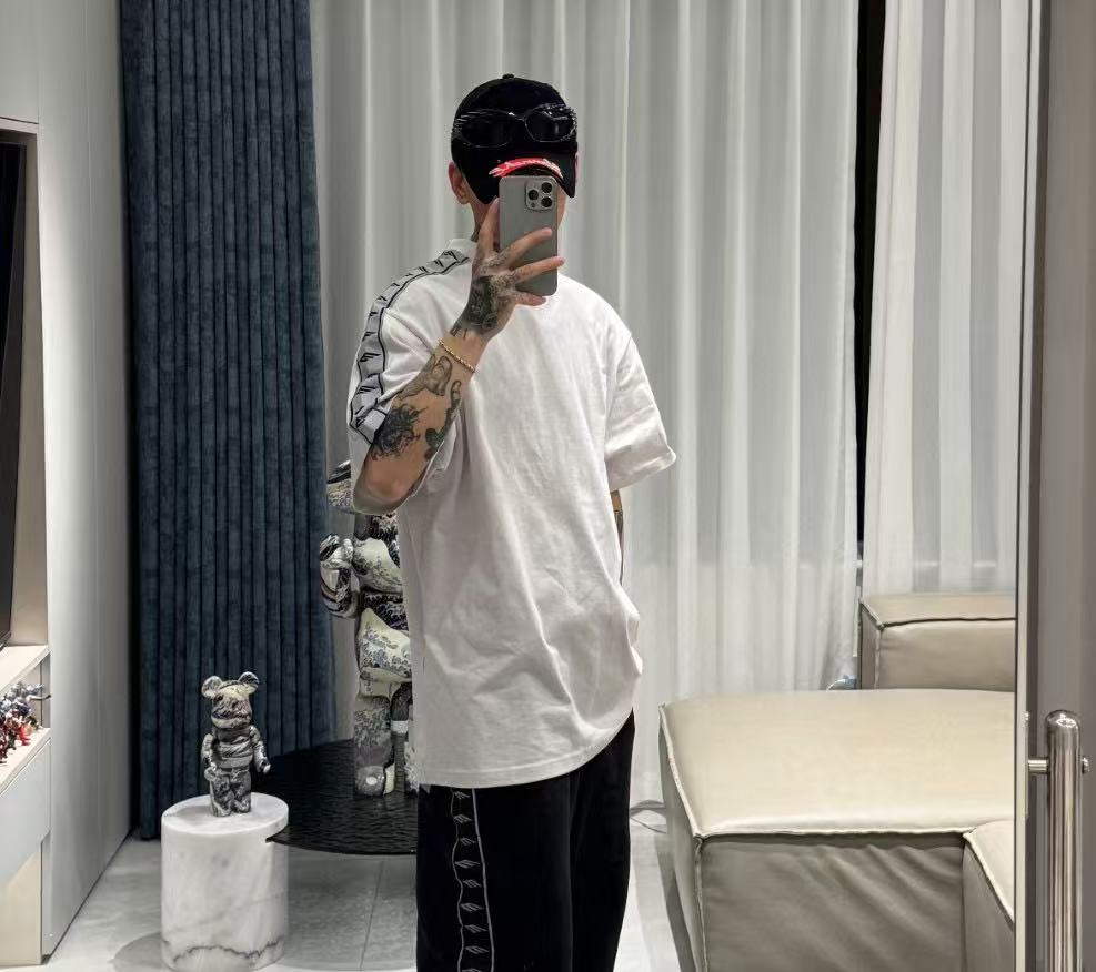 這款單品最迷人之處,在於其肩部與袖子側邊拼接的品牌字母織帶,不僅在視覺上拉長了肩線比例,更透過精緻的織紋層次,讓基本的 T 恤輪廓瞬間充滿時裝的建築感。