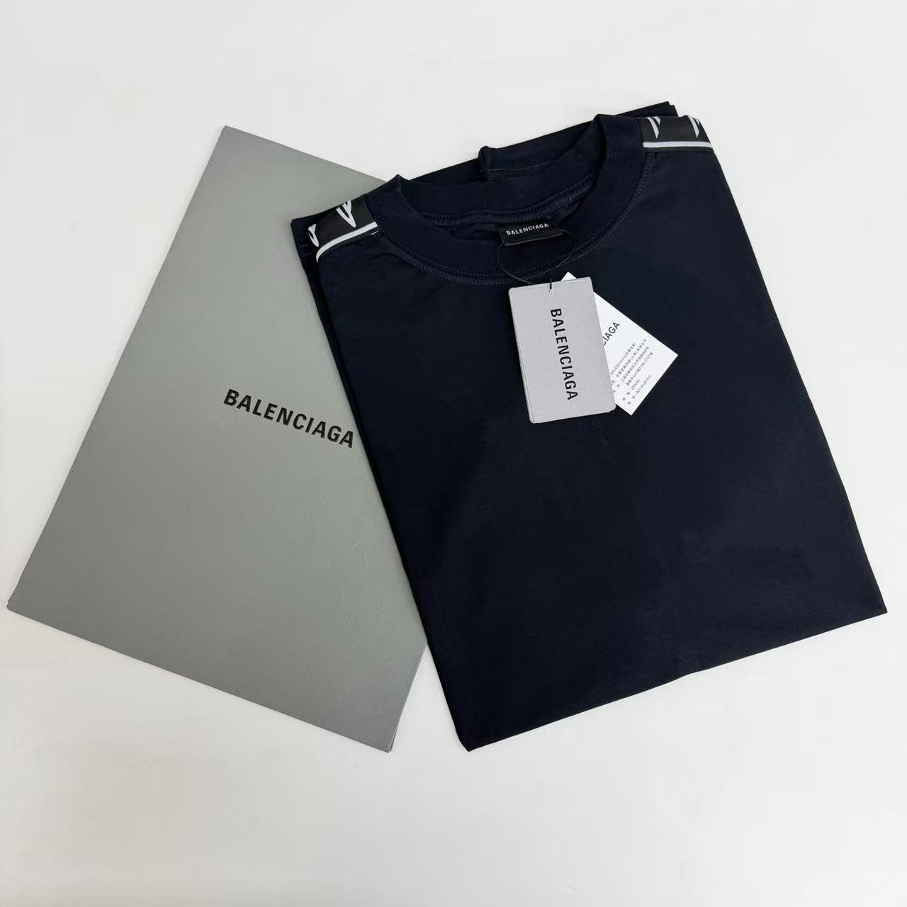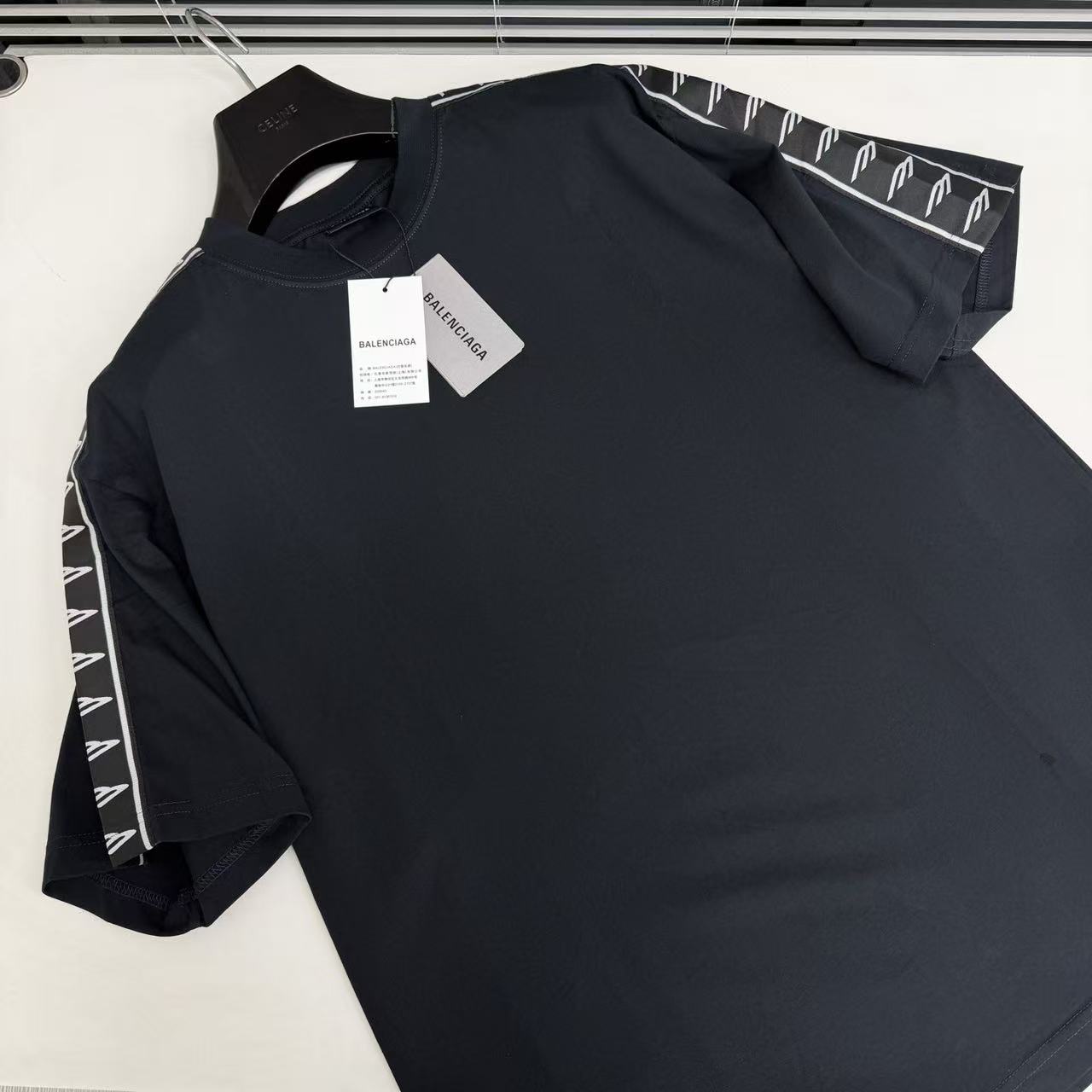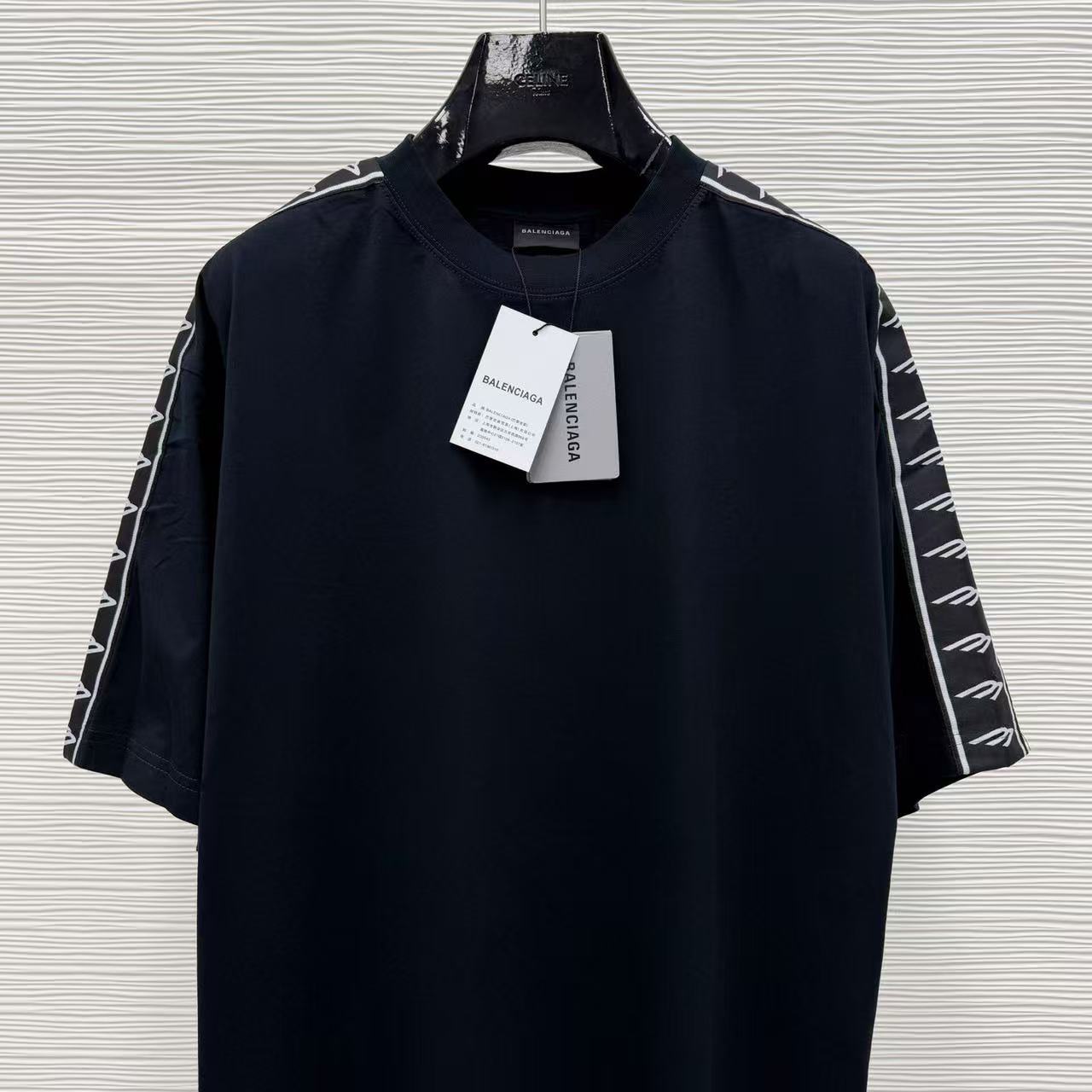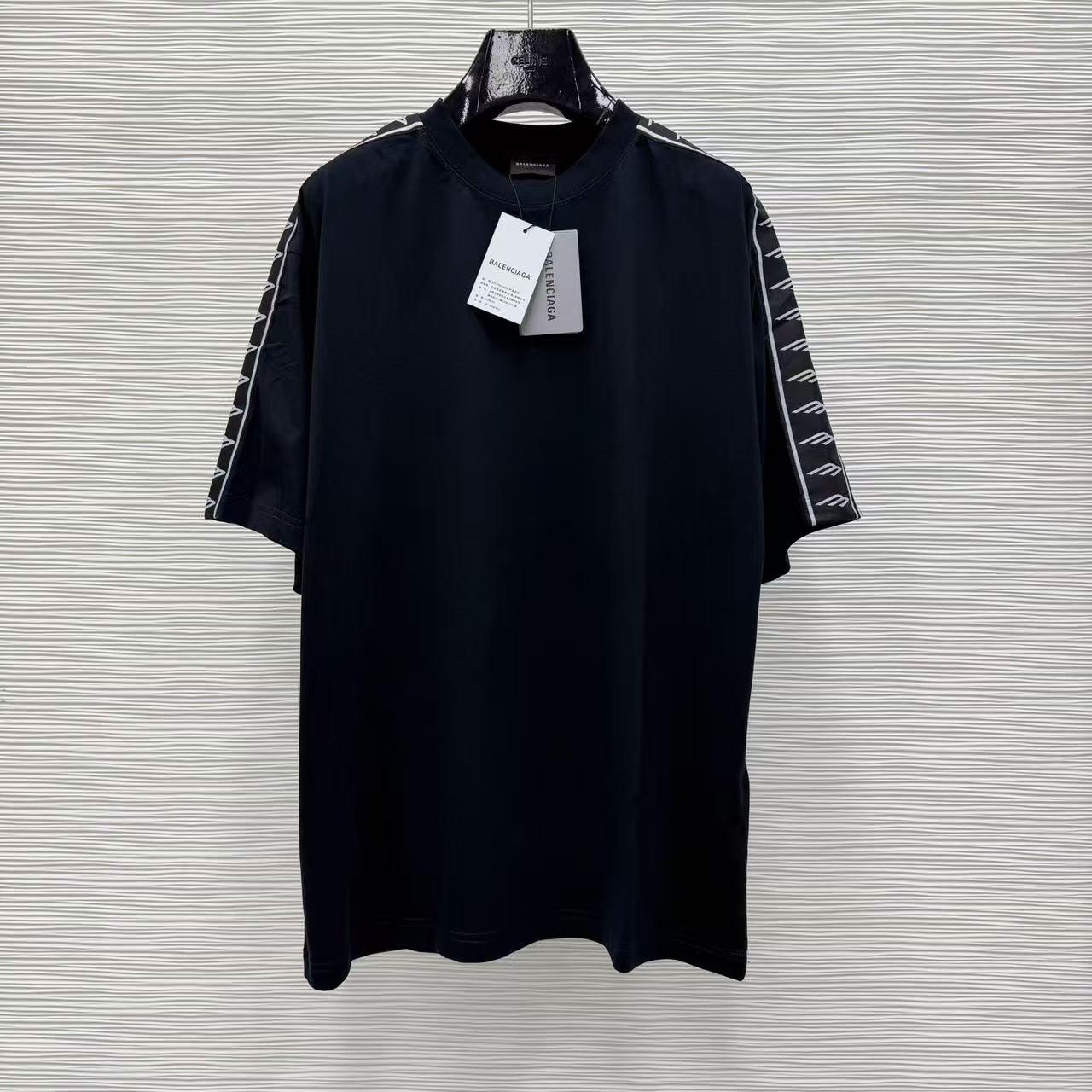這款單品最迷人之處,在於其肩部與袖子側邊拼接的品牌字母織帶,不僅在視覺上拉長了肩線比例,更透過精緻的織紋層次,讓基本的 T 恤輪廓瞬間充滿時裝的建築感。