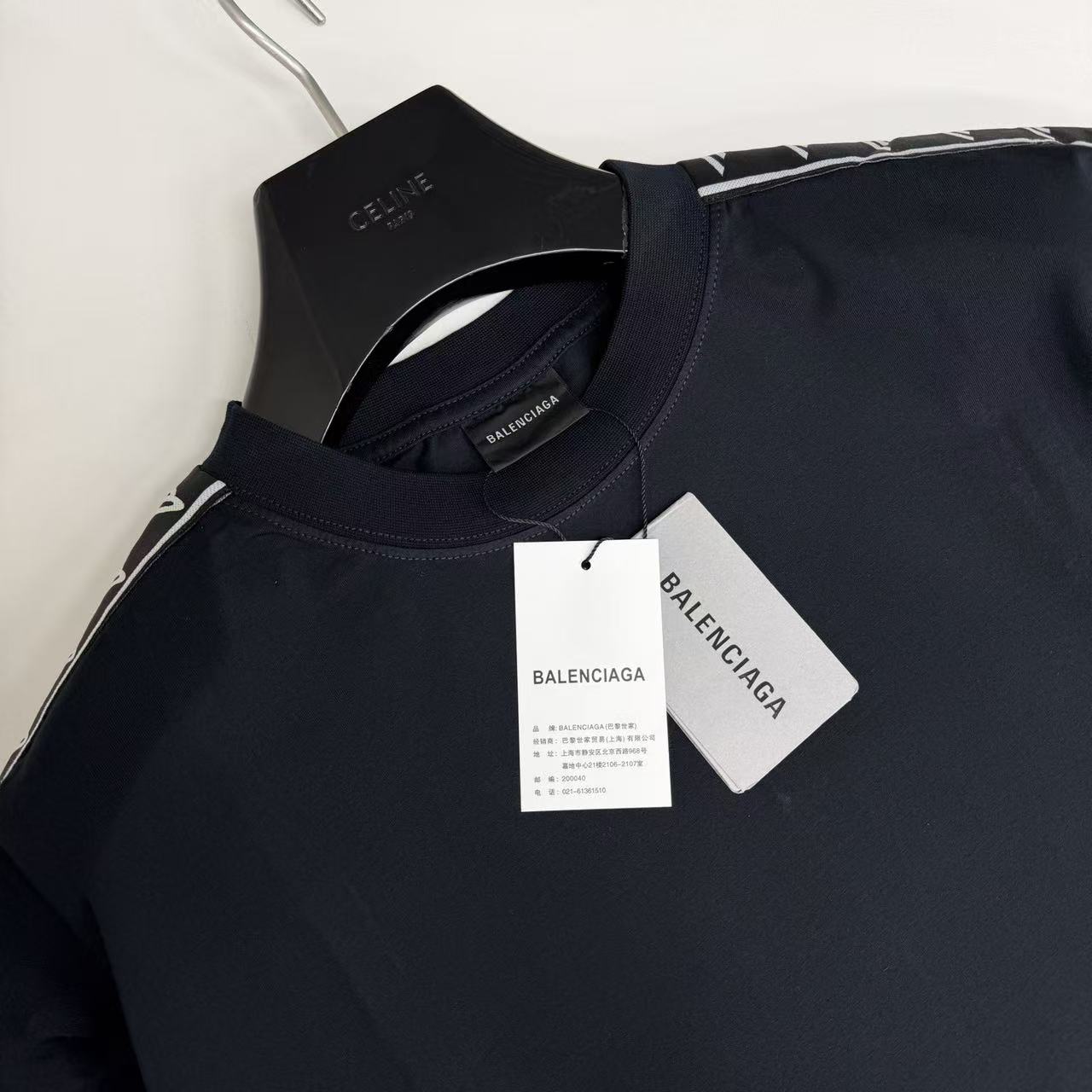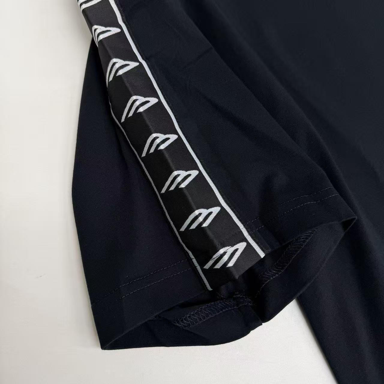 品牌專屬字母串標: 沿著肩部至袖口精確拼接,織帶圖騰清晰且具備微浮雕質感,辨識度極高。