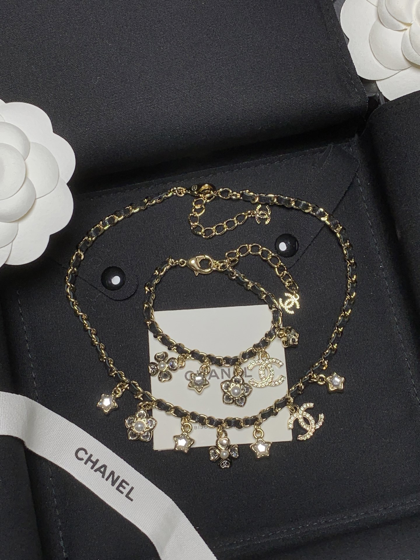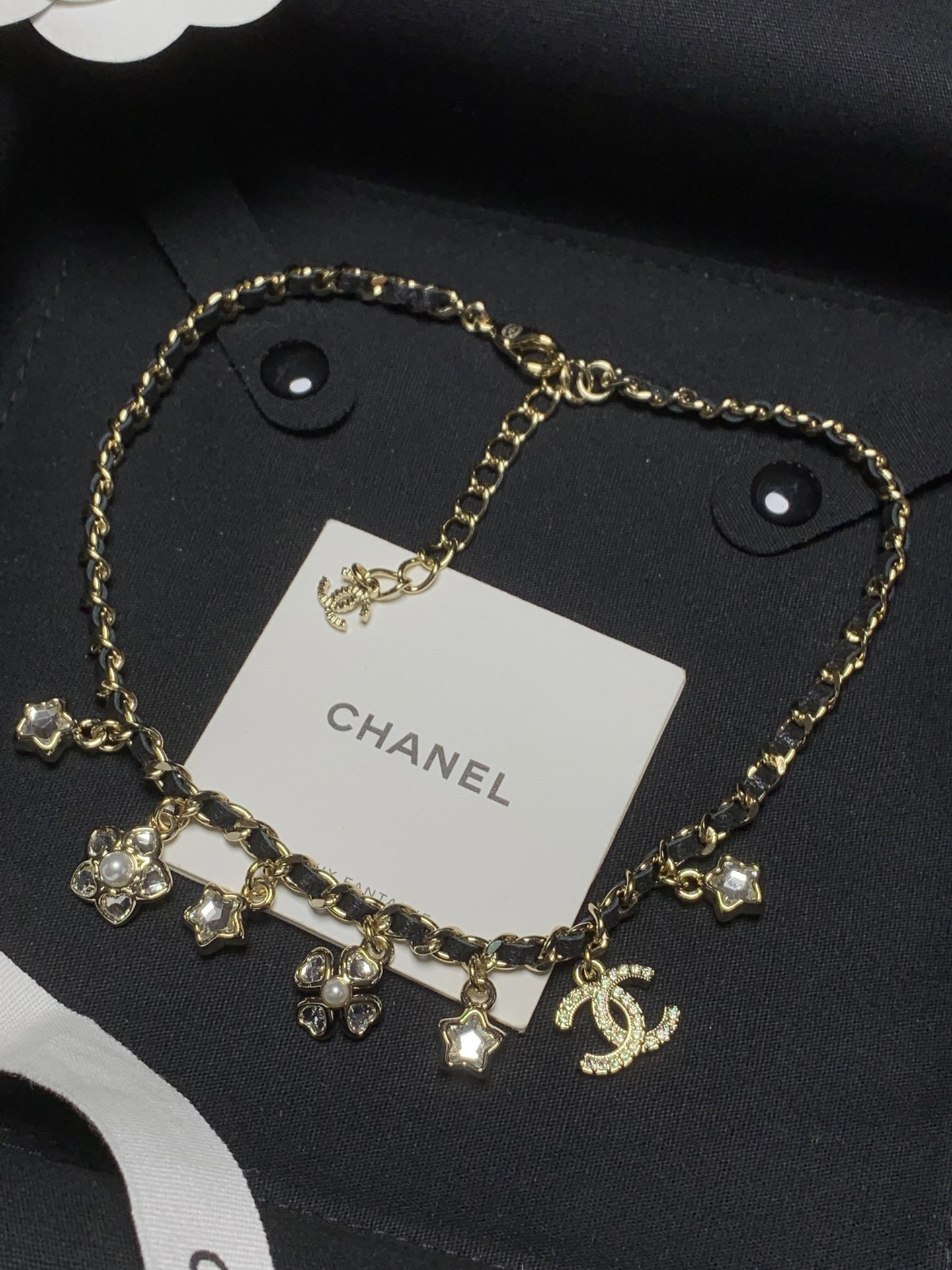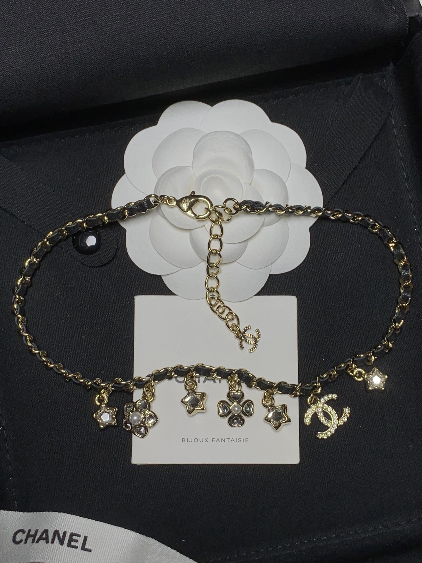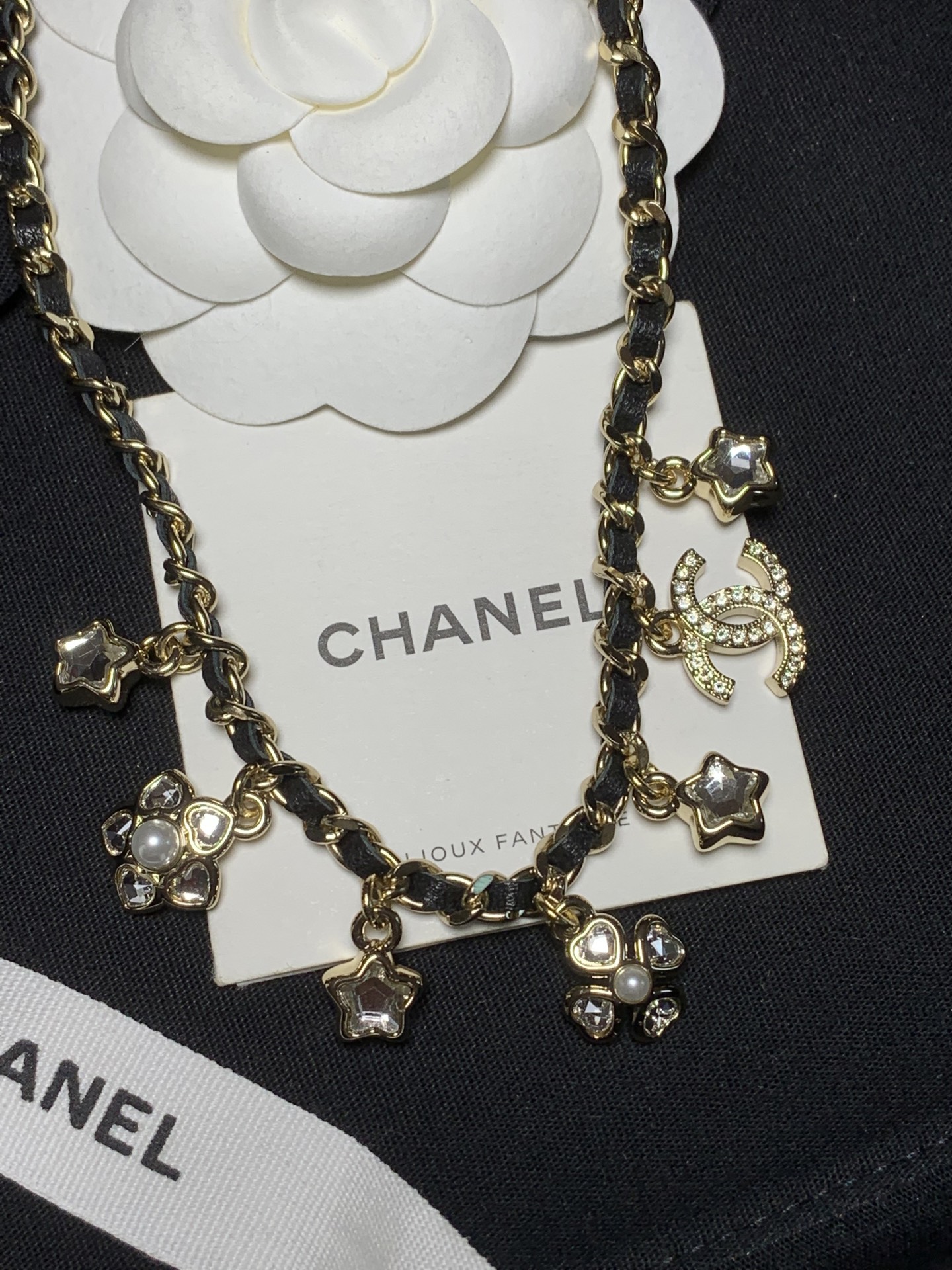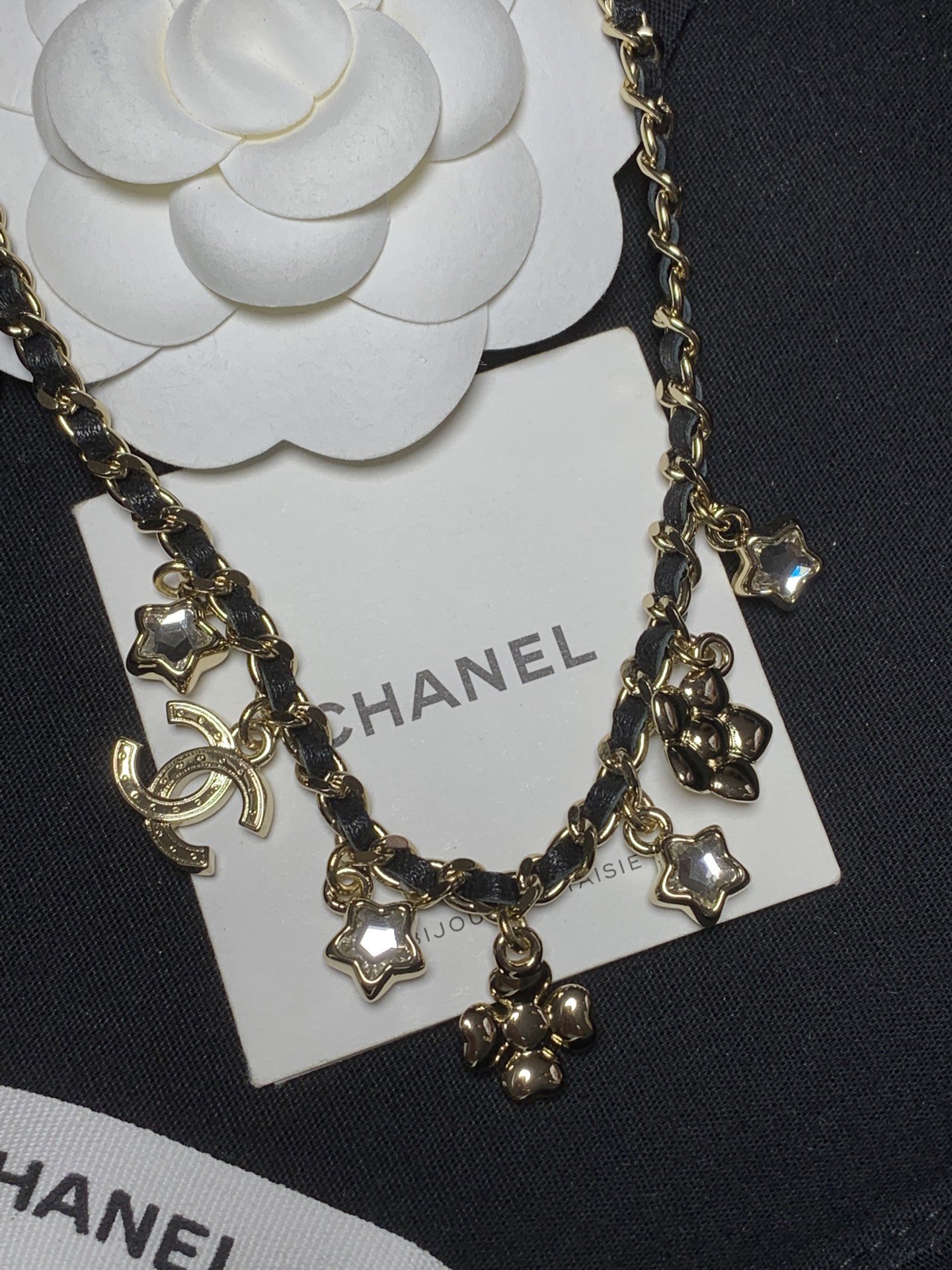 項鍊整體線條纖細優雅,以愛心、星星、四葉草、山茶花與經典雙C皮穿鏈元素為主視覺,層層堆疊的設計,讓配戴時更加靈動。