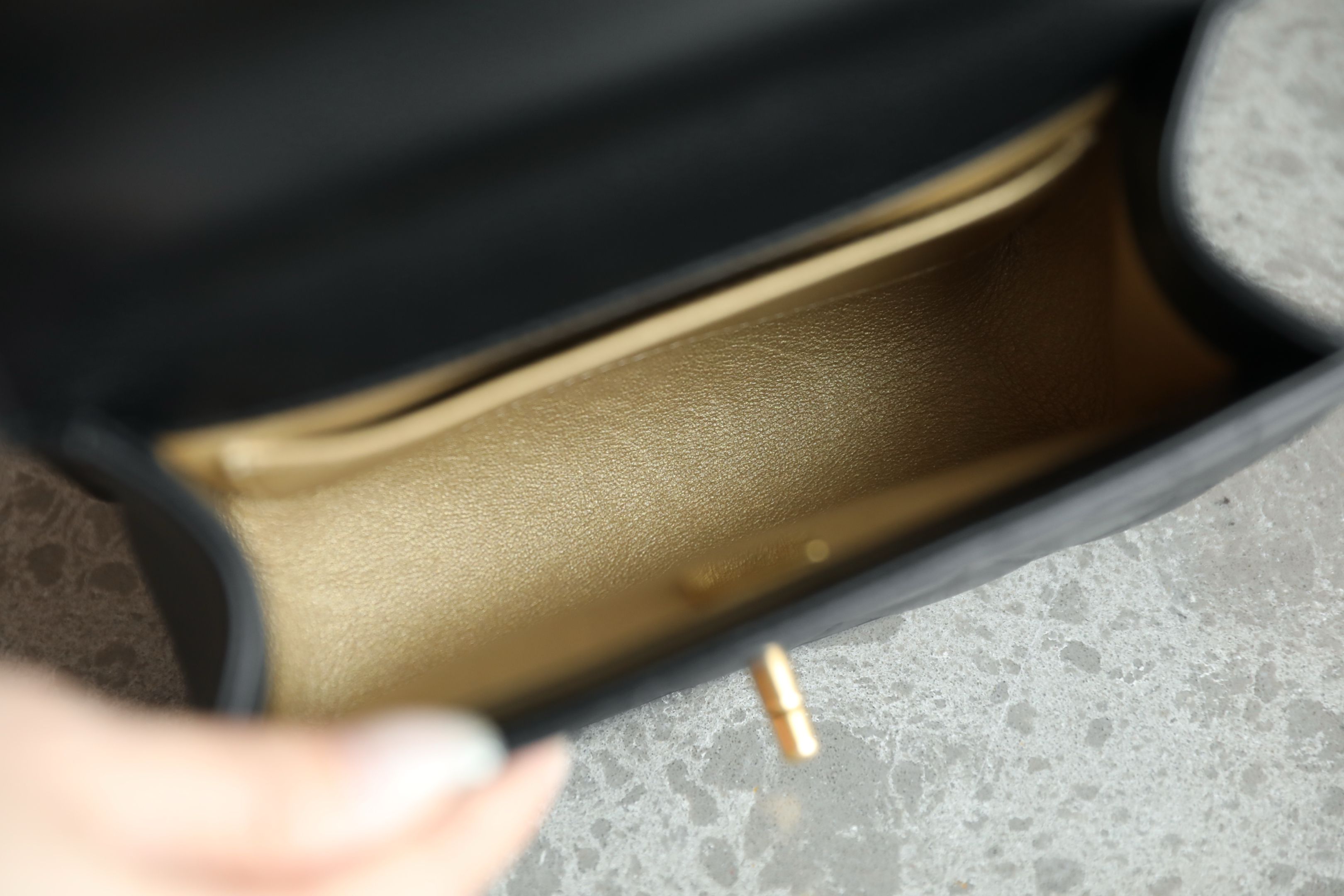 袋身線條俐落,整體挺度佳,包型非常立體,不易變形。金屬五金選用厚鍍復古金色材質,隨光線流動折射出低調高貴的光澤感,不張揚卻難以忽視