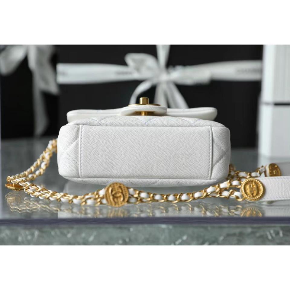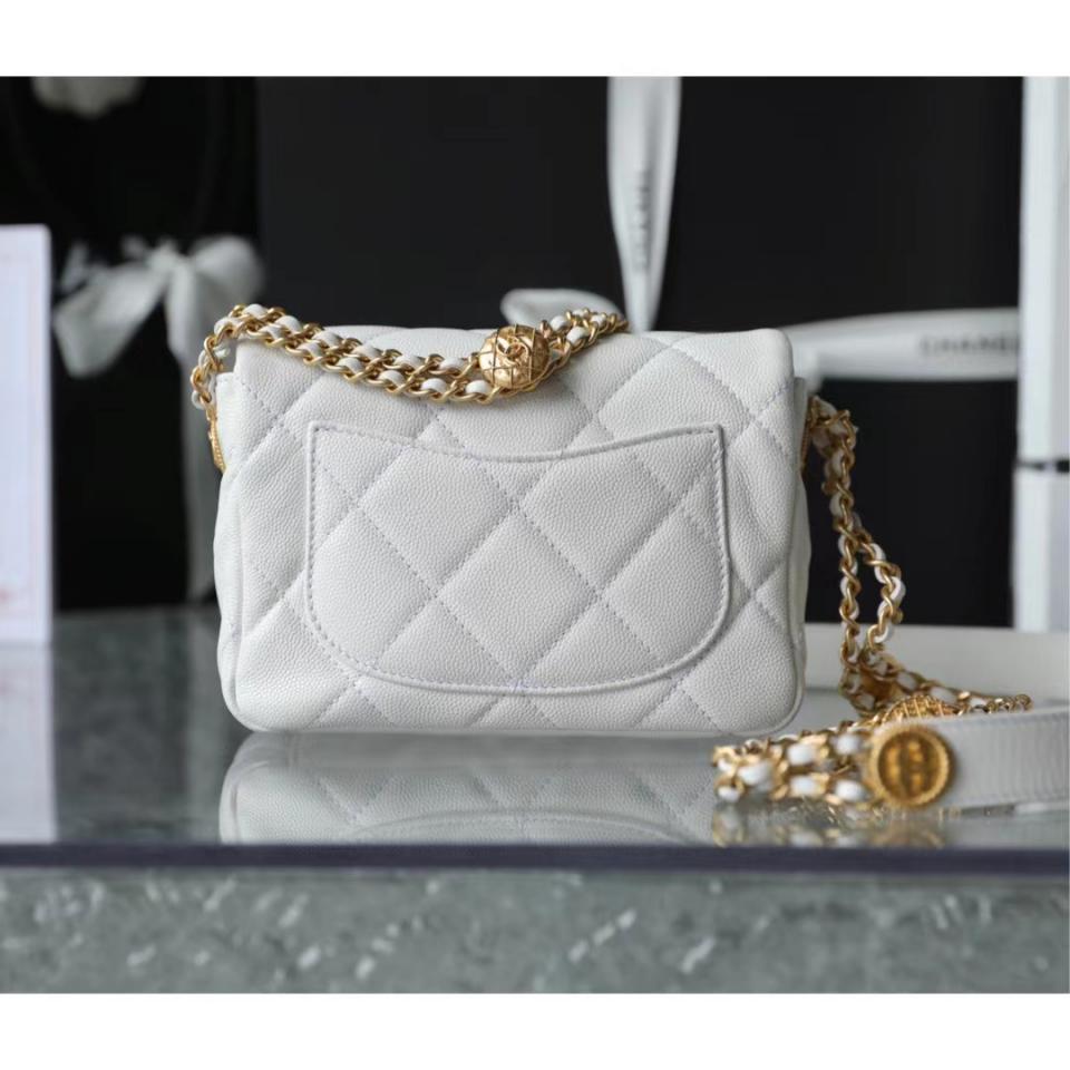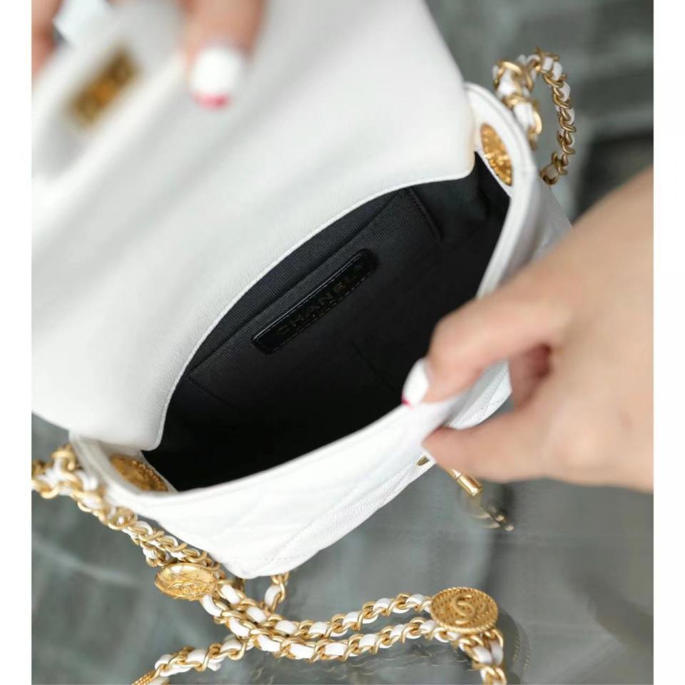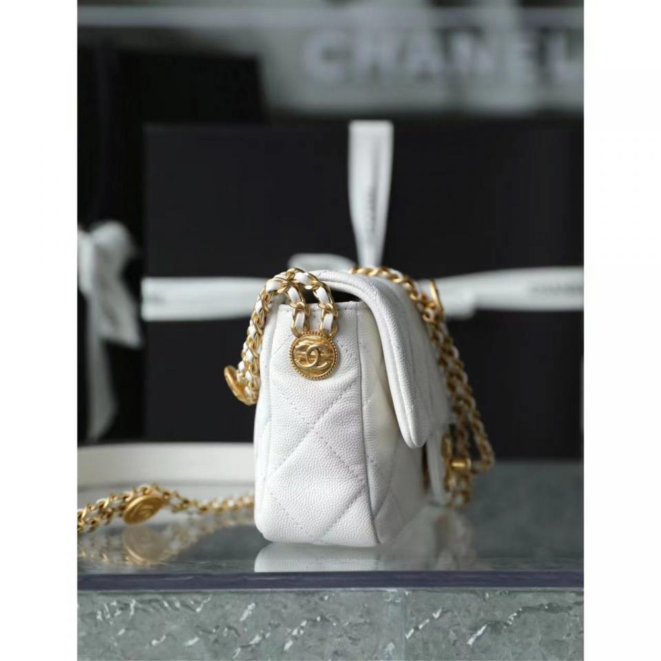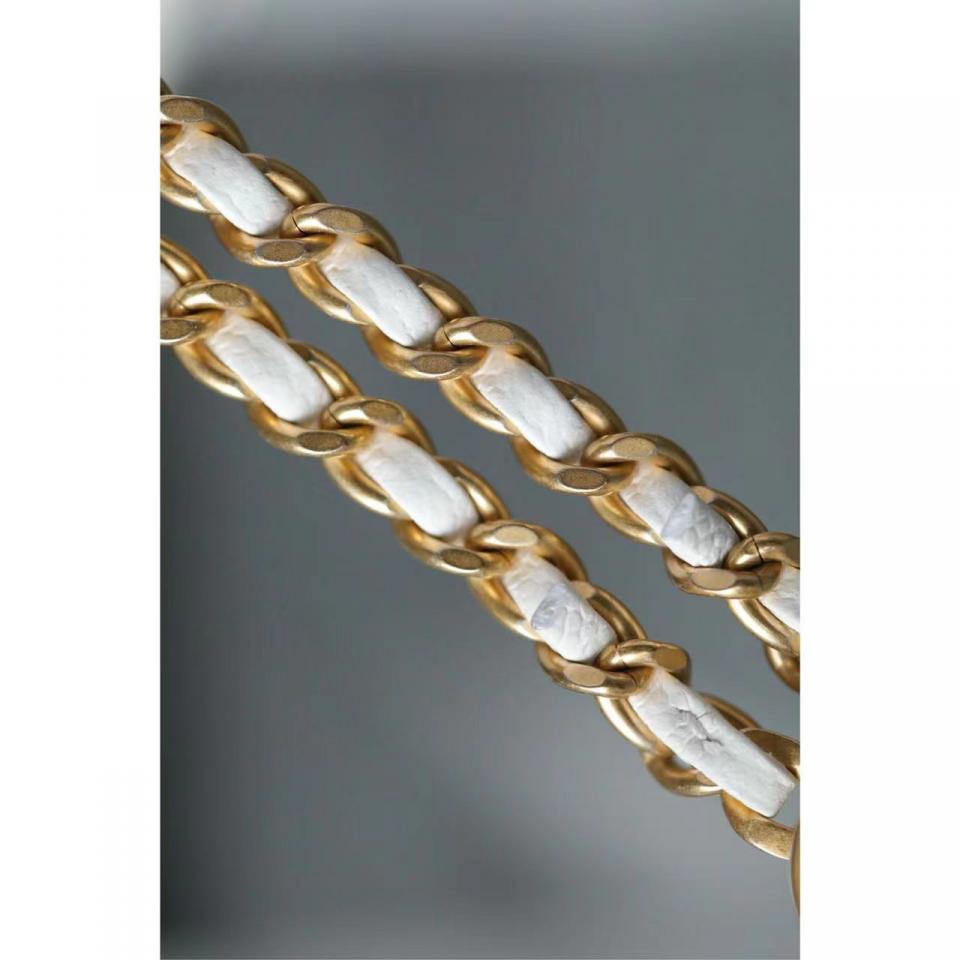2022春夏新品 高級手工坊 徽章金幣鏈條口蓋包(白色18cm) 金幣鏈條非常重工精緻
