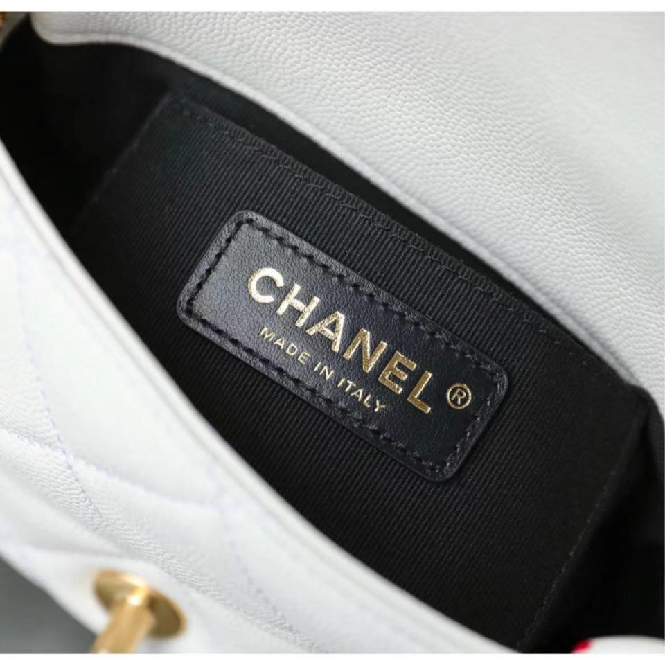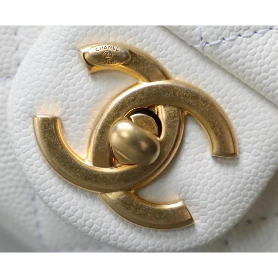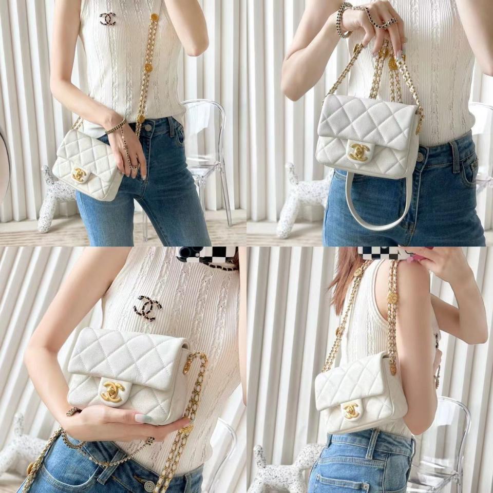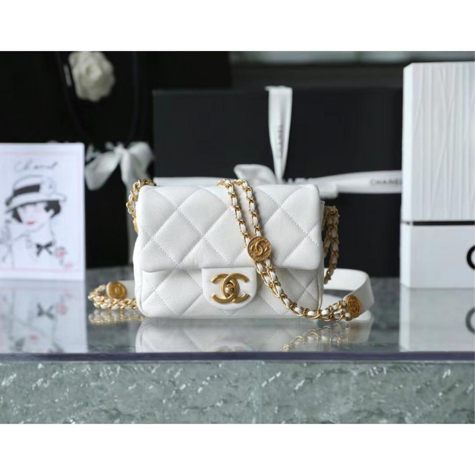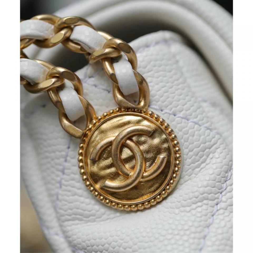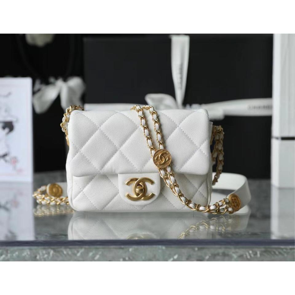 2022春夏新品 高級手工坊 徽章金幣鏈條口蓋包(白色18cm) 金幣鏈條非常重工精緻