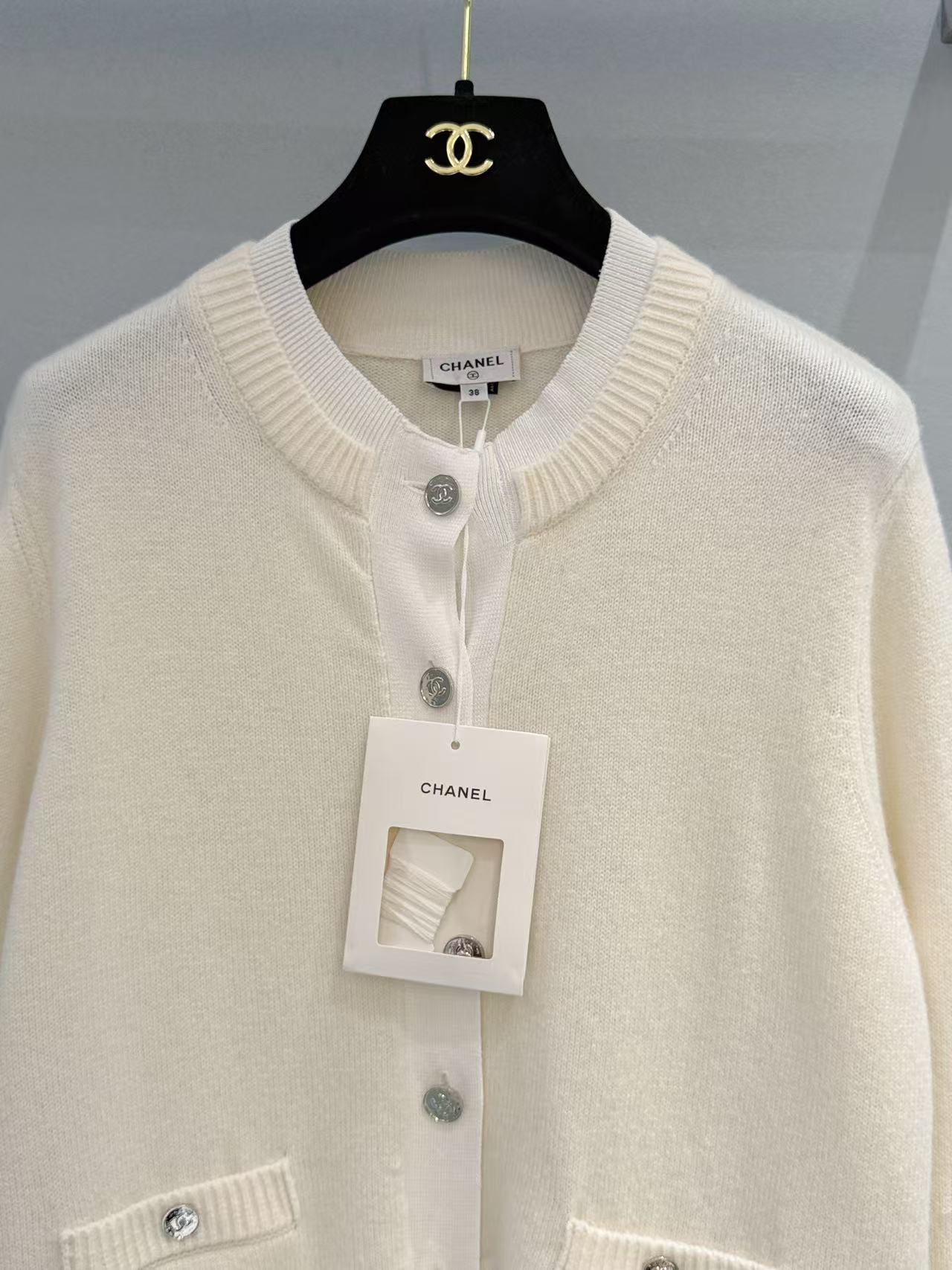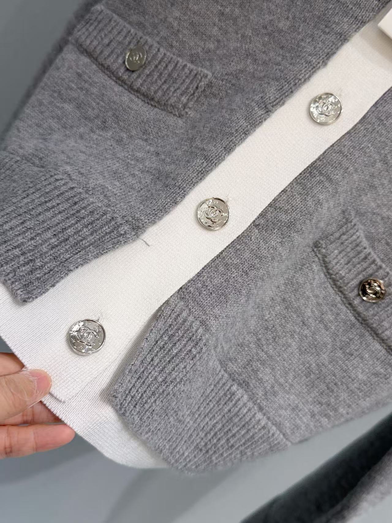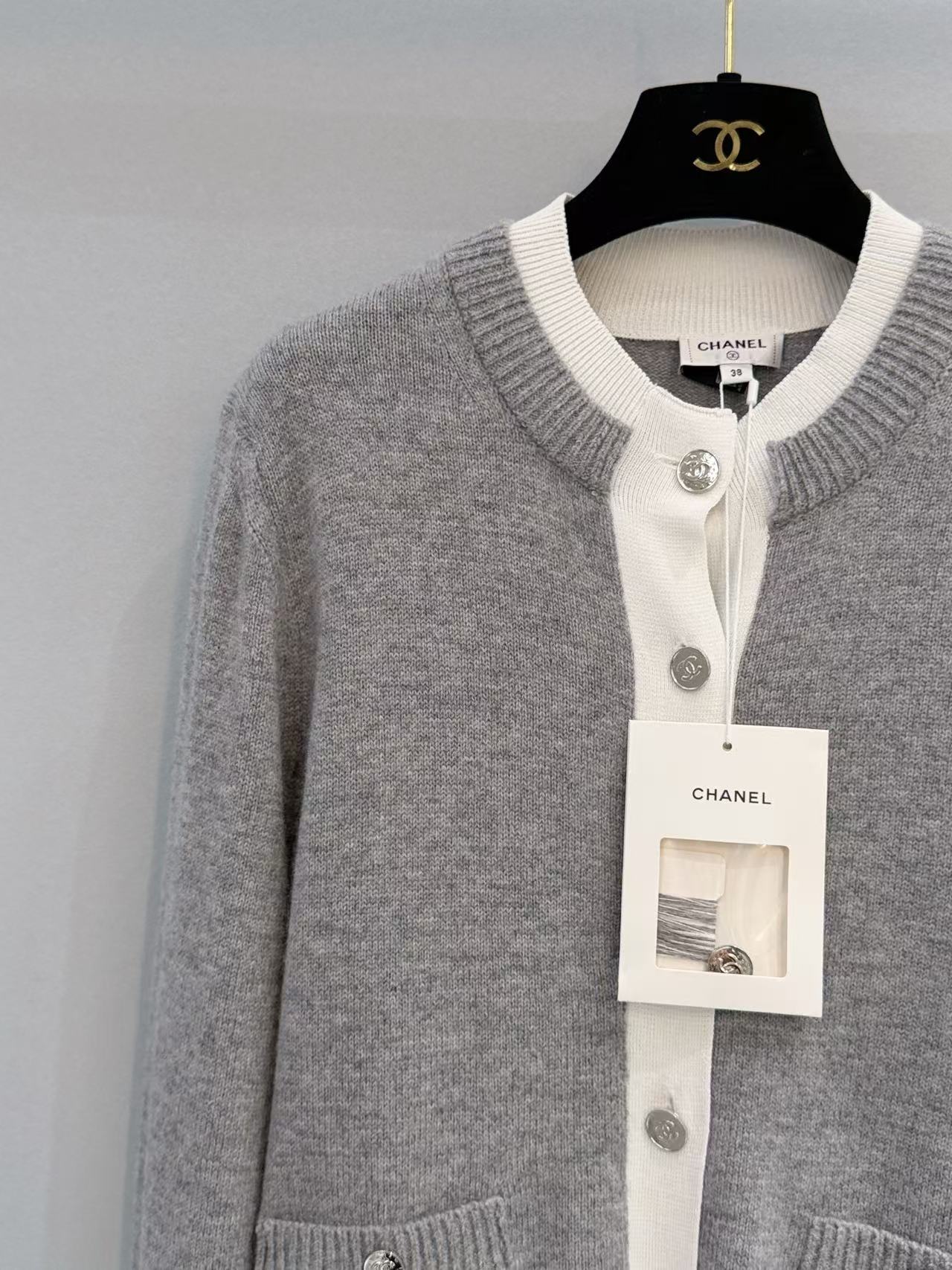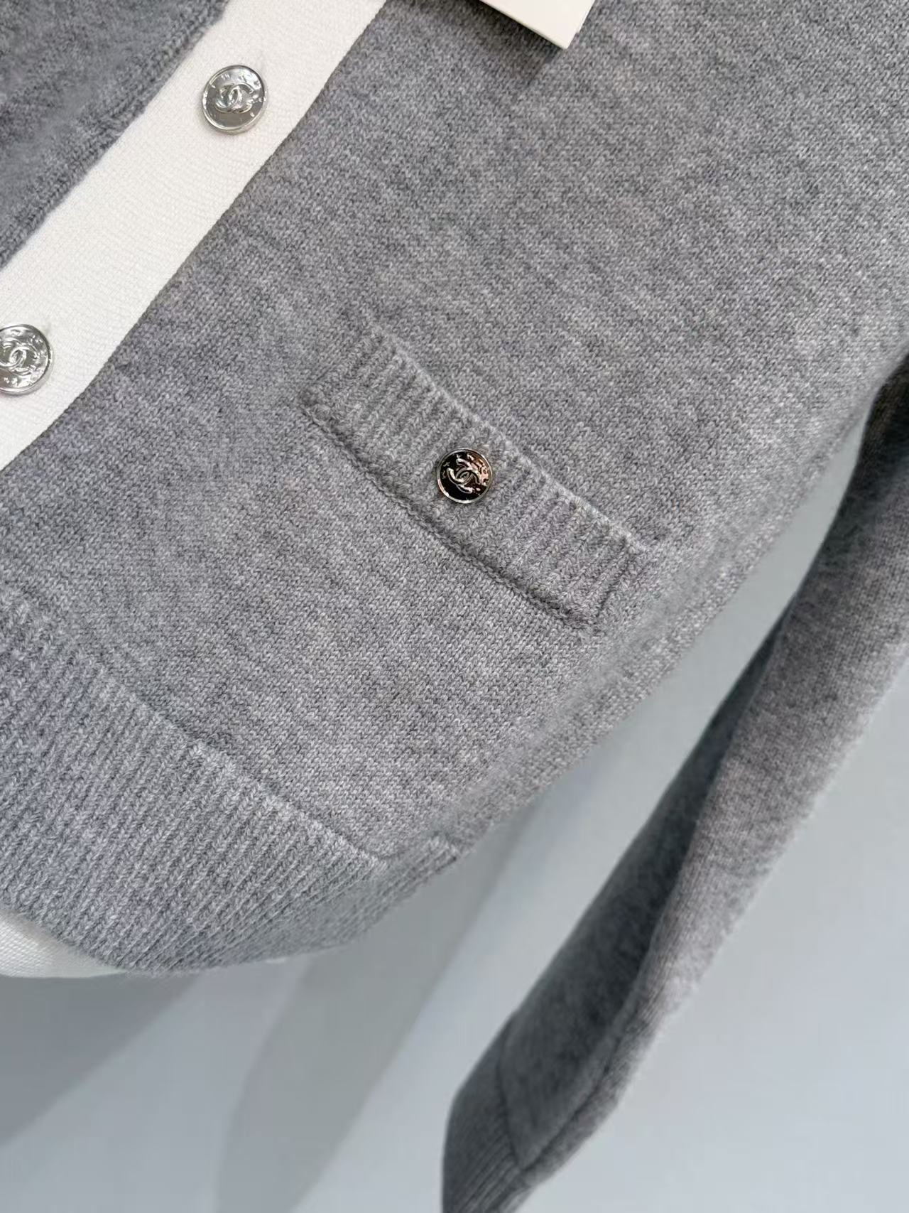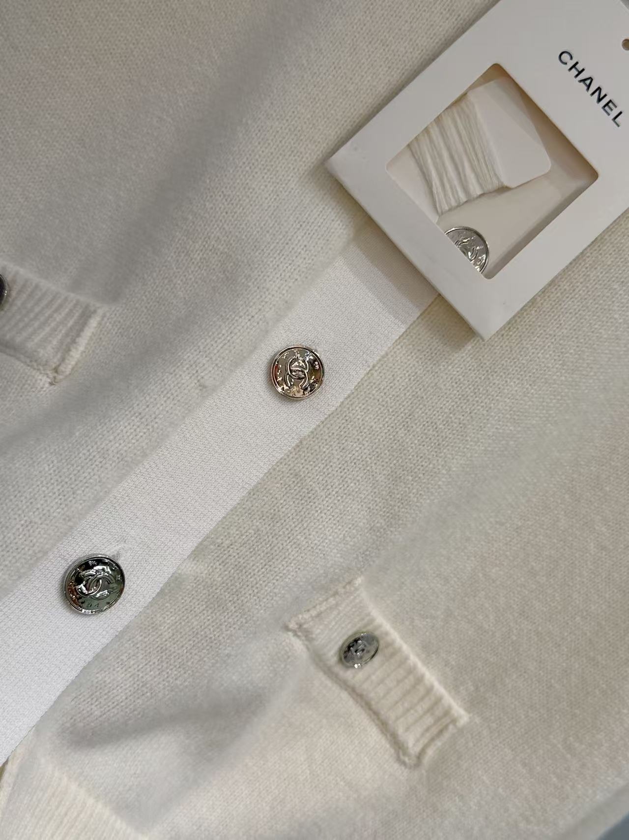 胸前裝飾的小口袋搭配經典金屬雙 C 鈕扣,在低調的極簡風格中,點亮了品牌的靈魂符號,展現出「越簡單、越奢華」的穿搭美學。