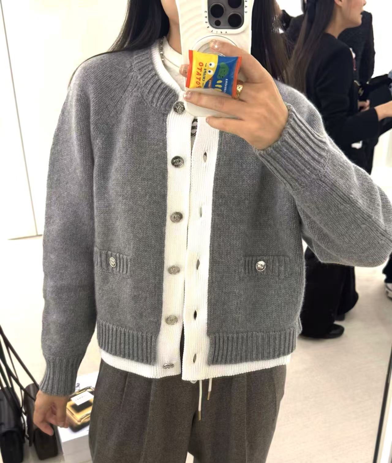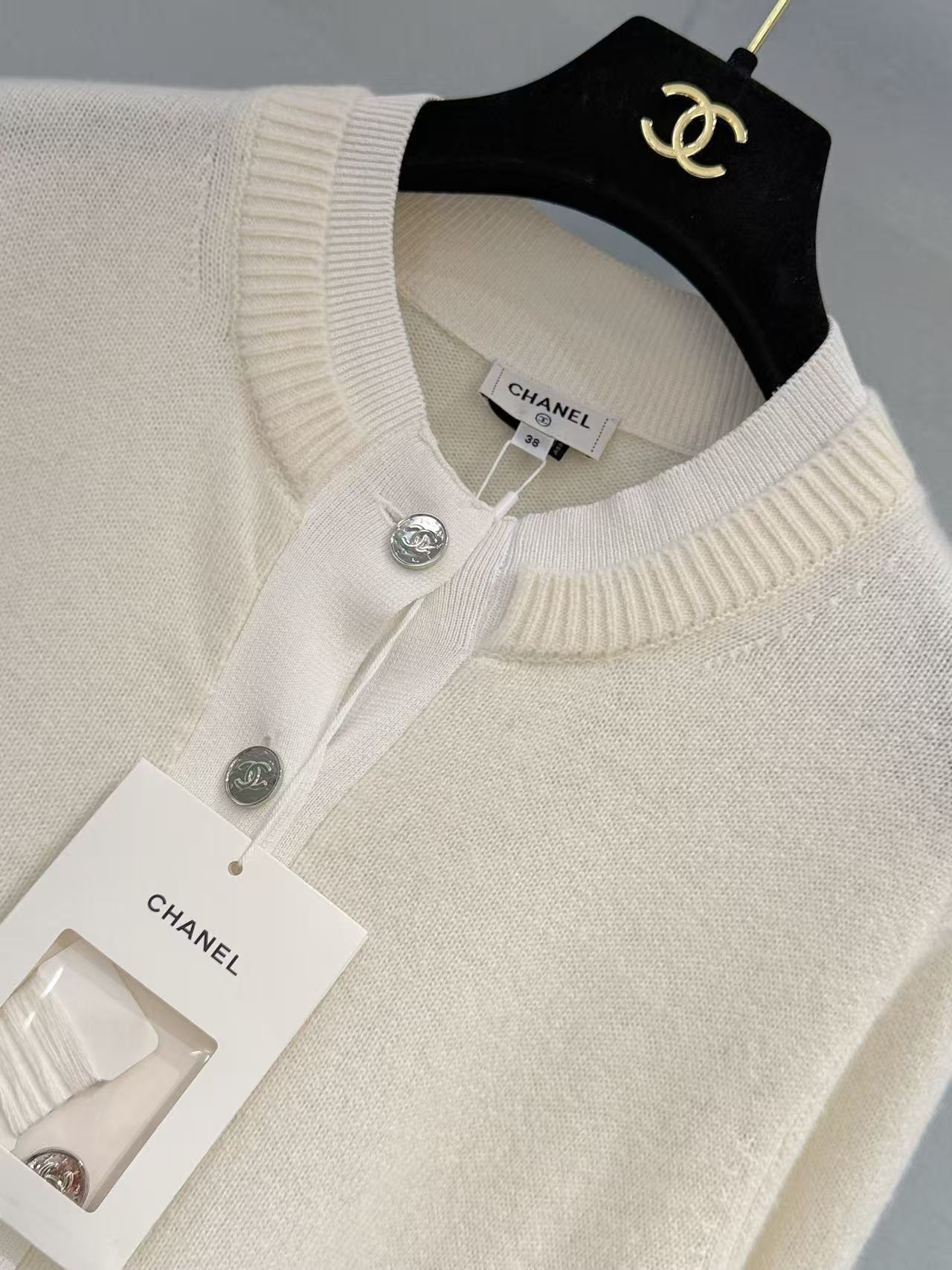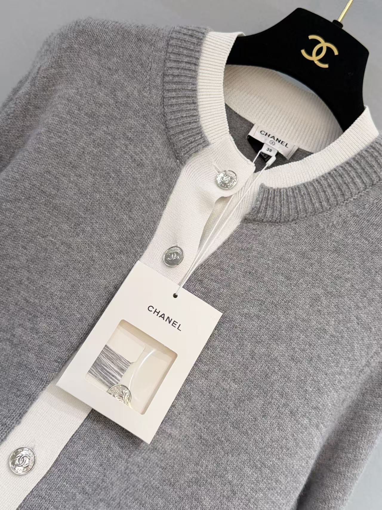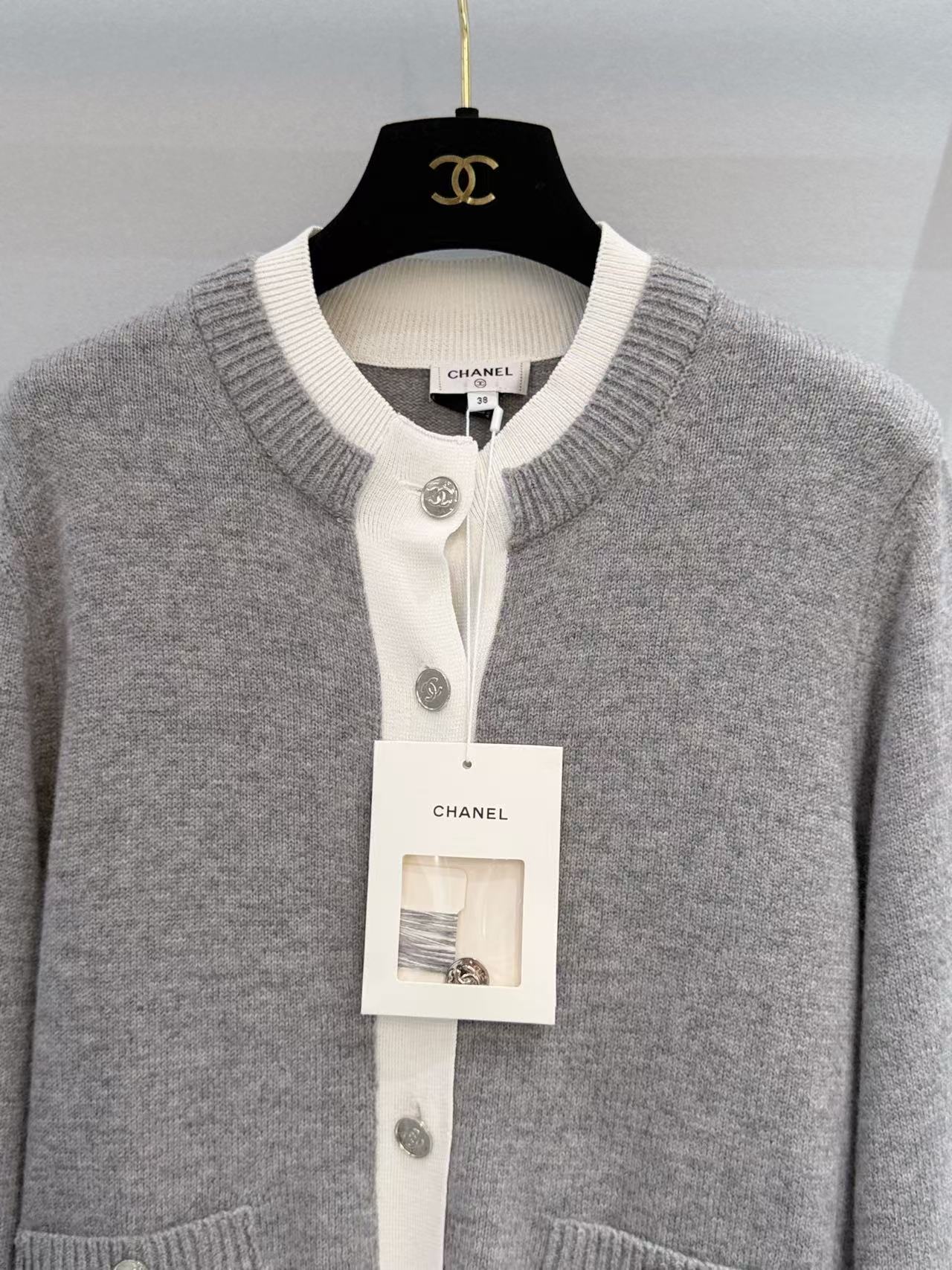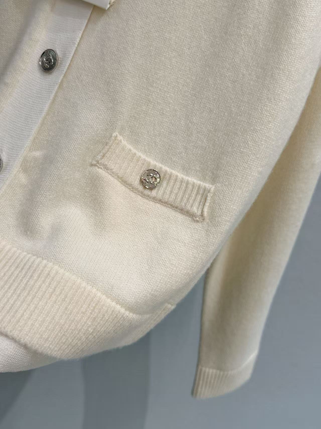胸前裝飾的小口袋搭配經典金屬雙 C 鈕扣,在低調的極簡風格中,點亮了品牌的靈魂符號,展現出「越簡單、越奢華」的穿搭美學。