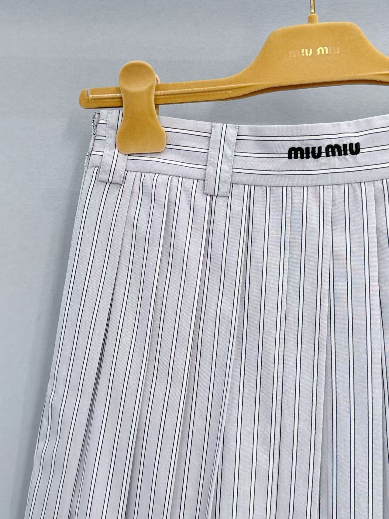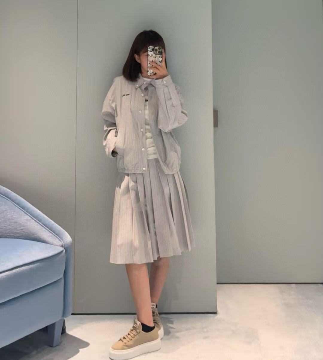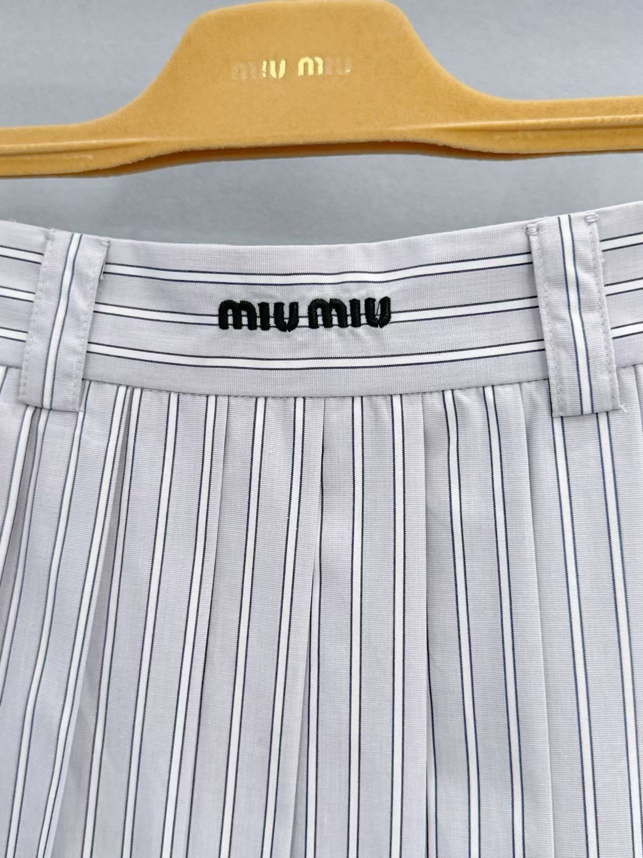 腰頭或裙擺處點綴了標誌性的 Miu字母刺繡。這種不張揚的精緻感,讓妳在轉身間展現出品牌的高端身份,是質感女孩一眼就能認出的專屬標識。